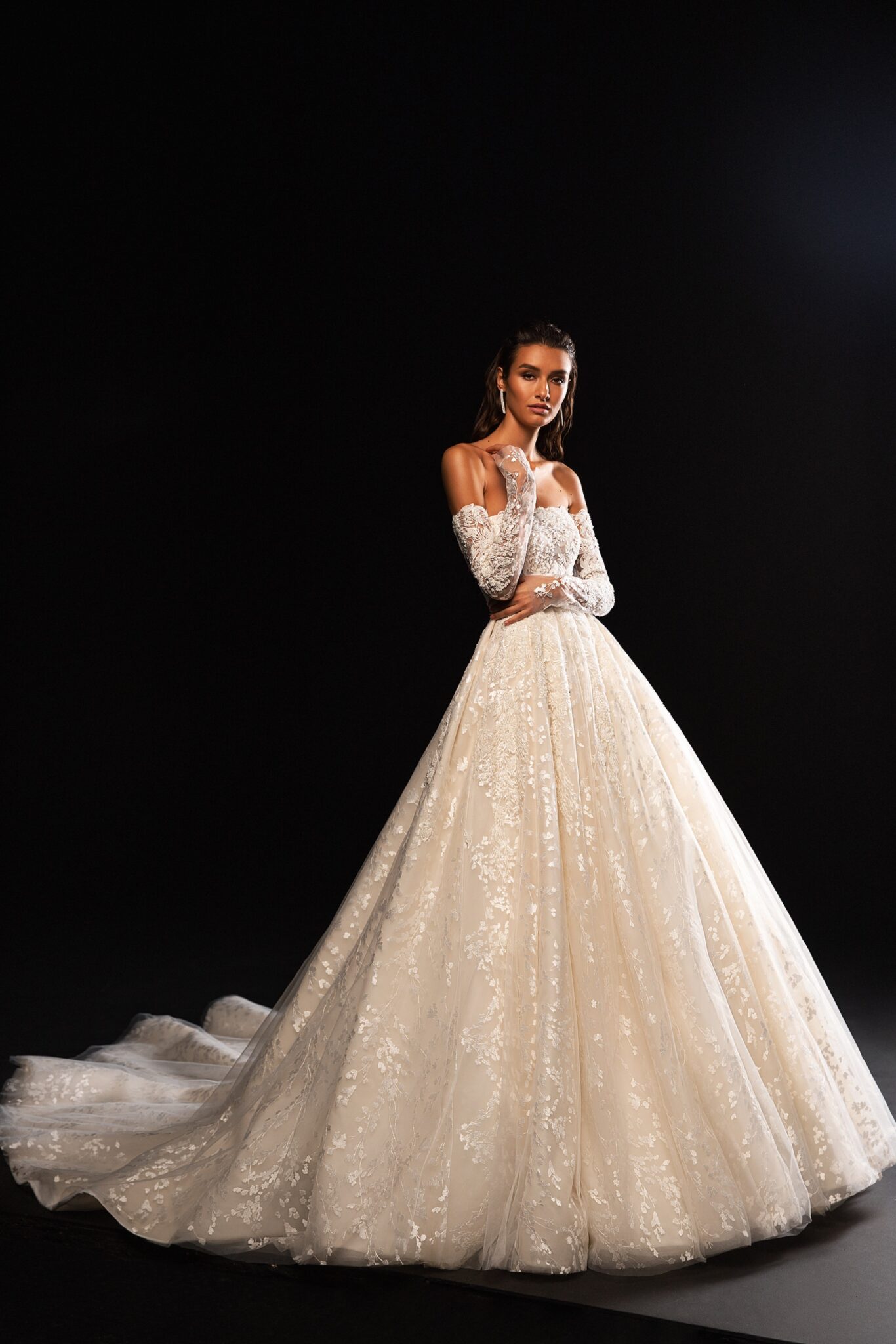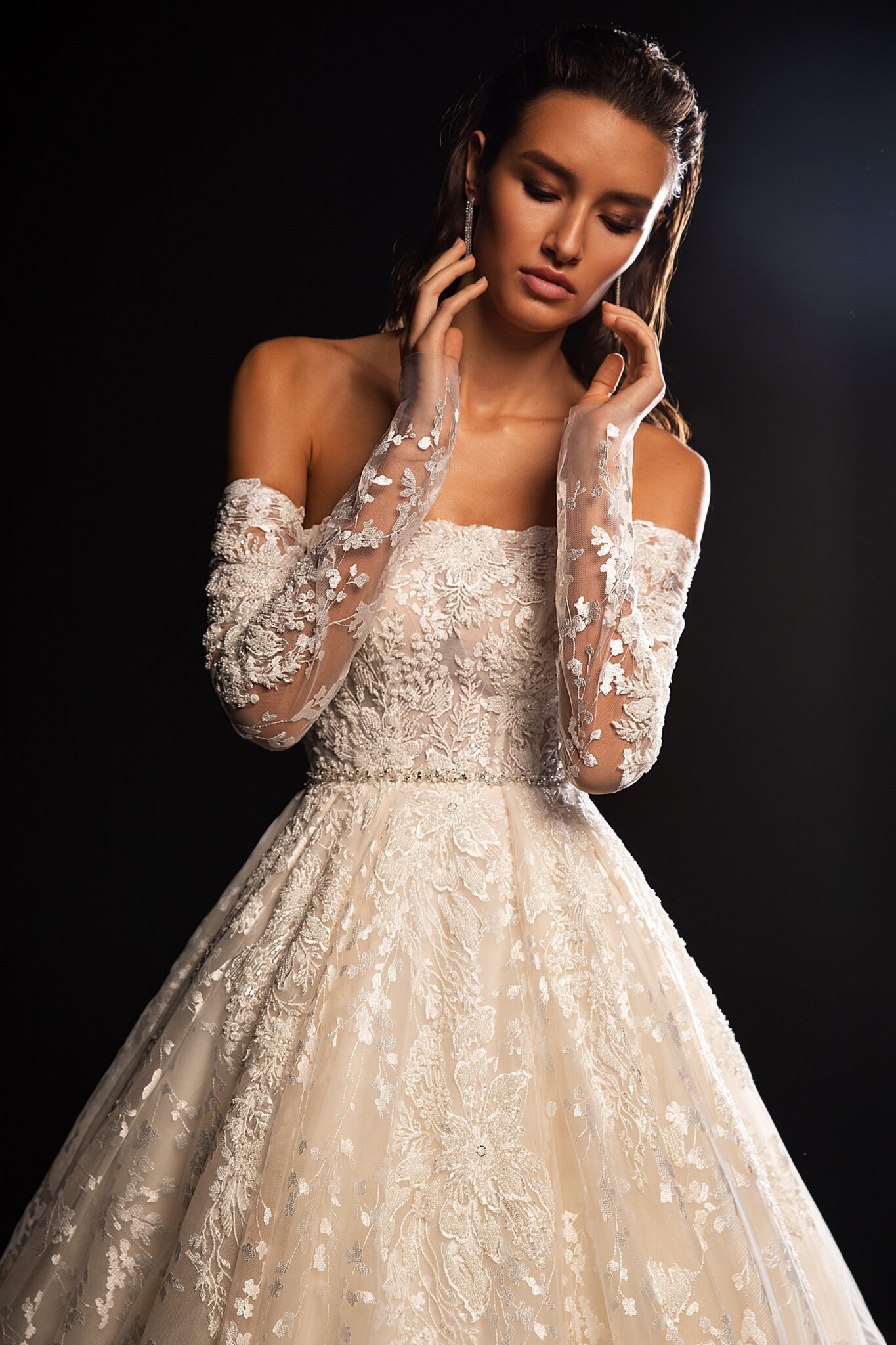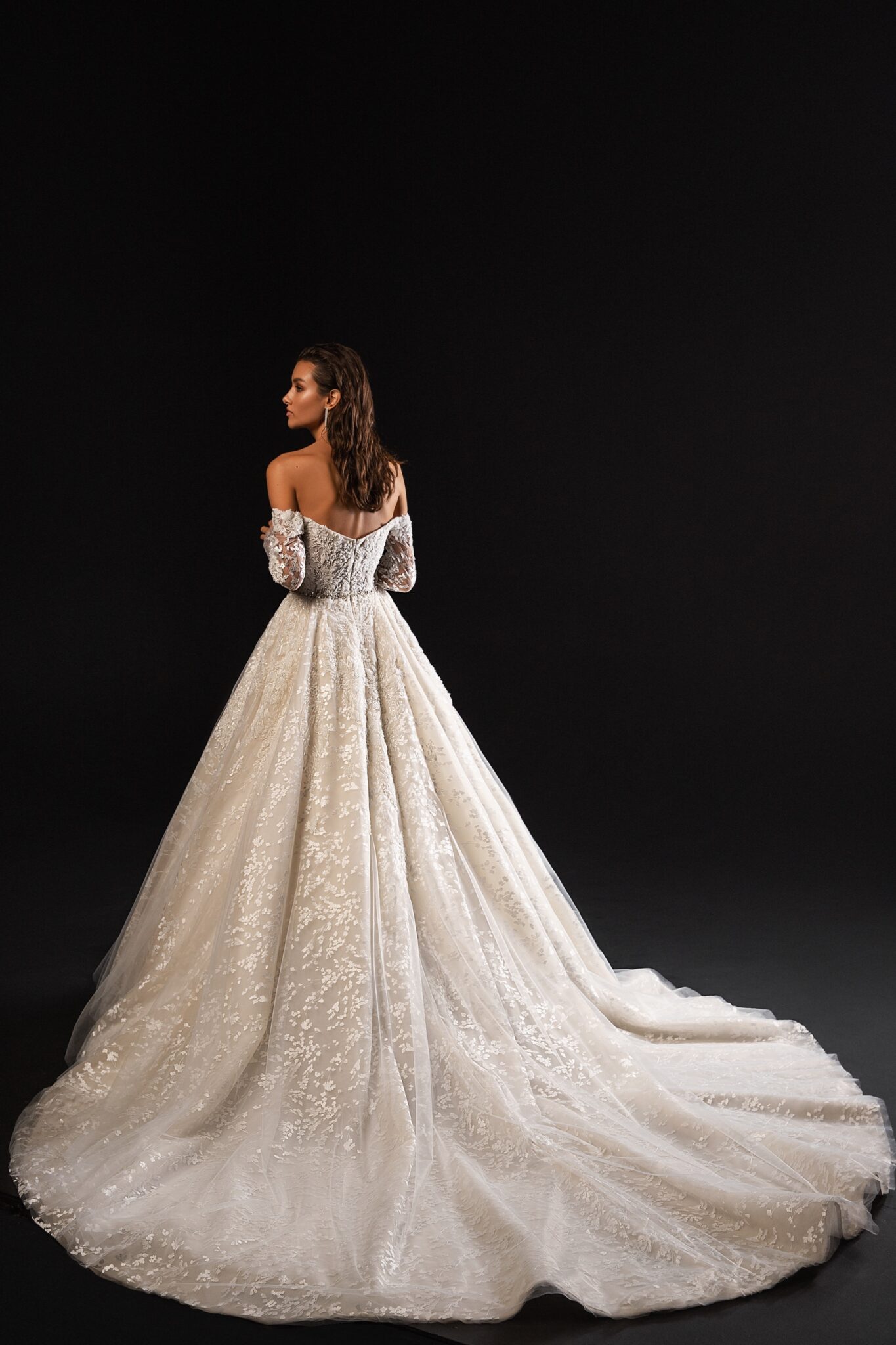 StardustA fabulous wedding gown with magnificent long sleeves. The upper part of the dress is fully decorated with a pattern of shining crystals and beads. lo. A splendor skirt that passes into a train is making it even more charming. A Boat neckline adds a finishing touch to the outfit