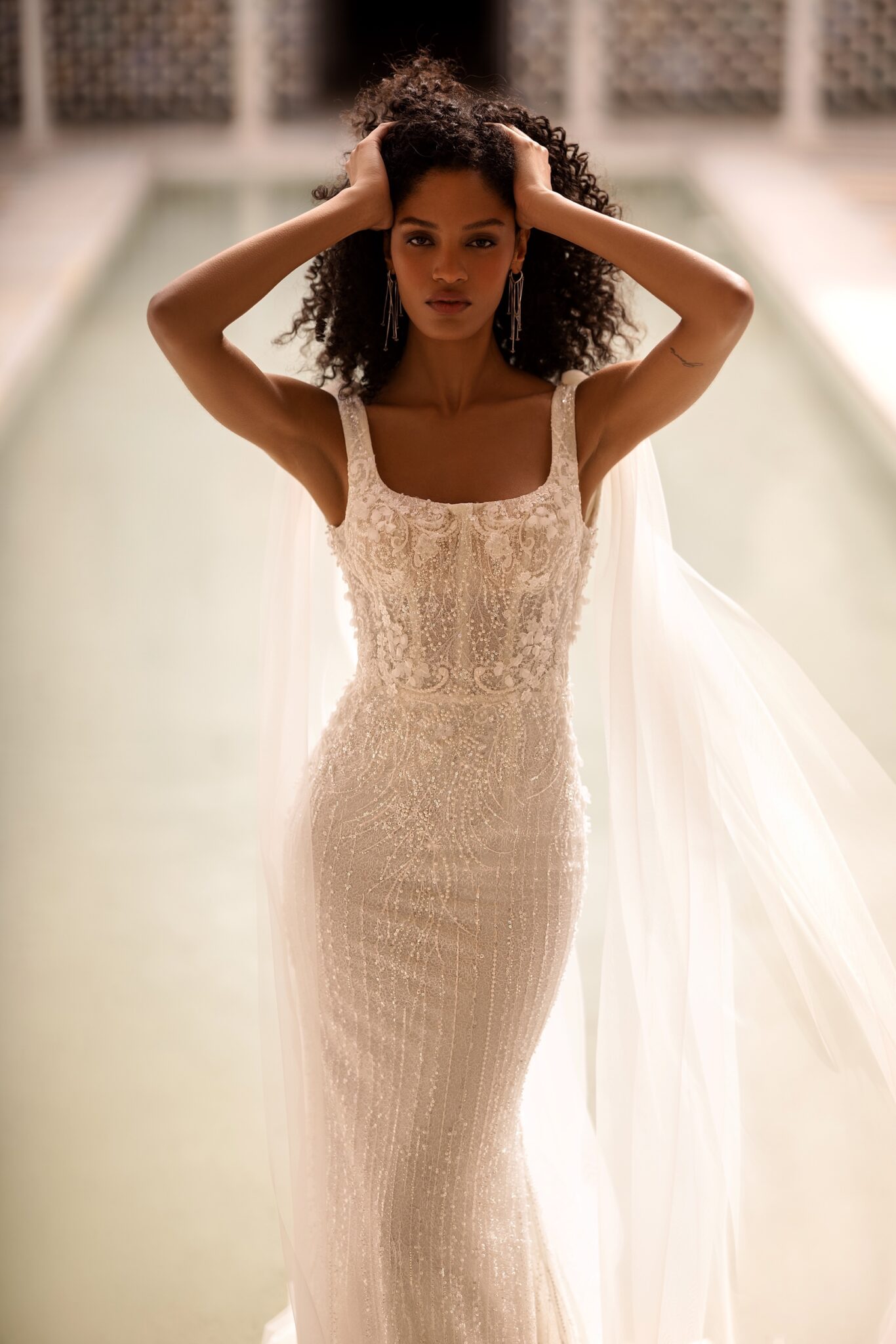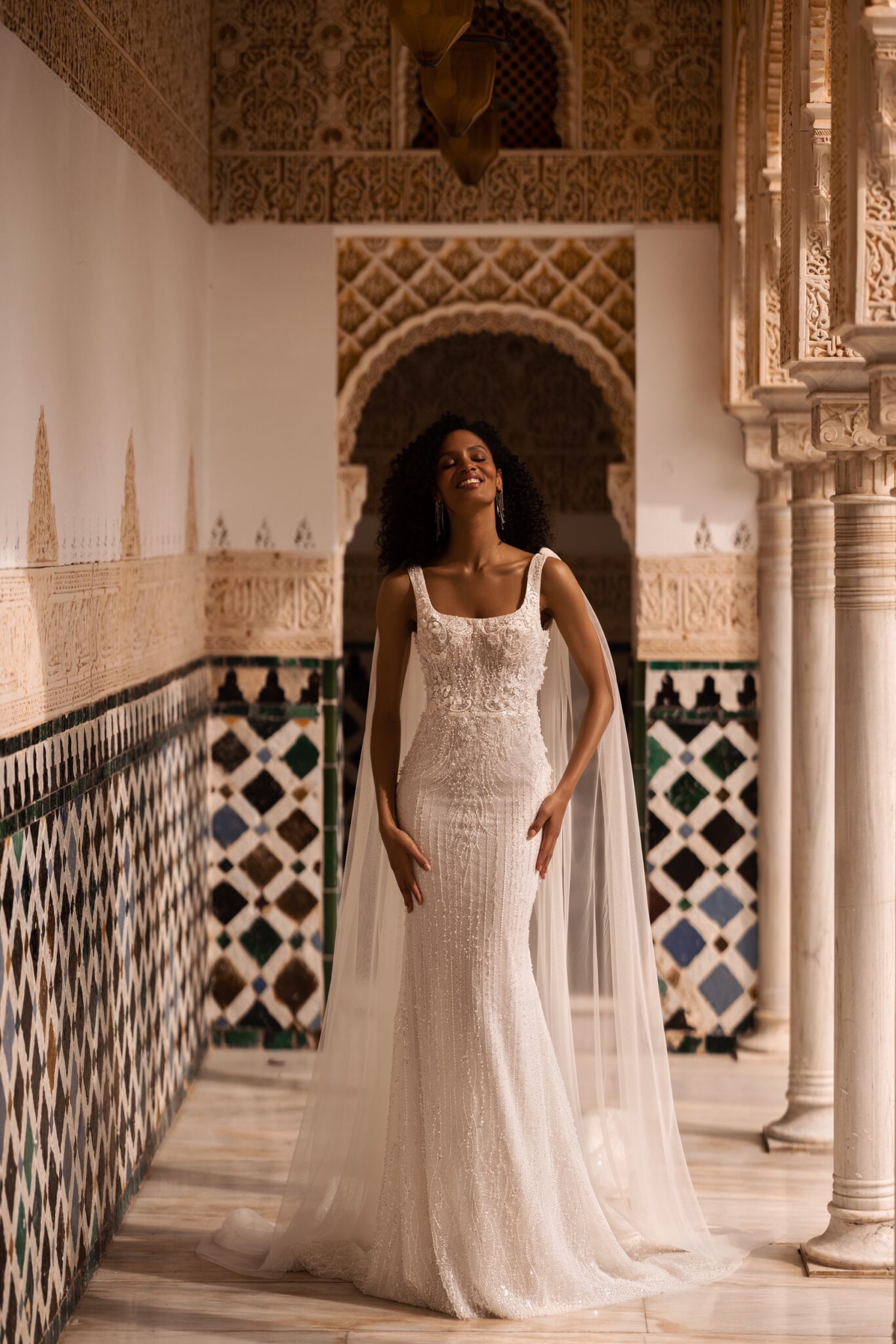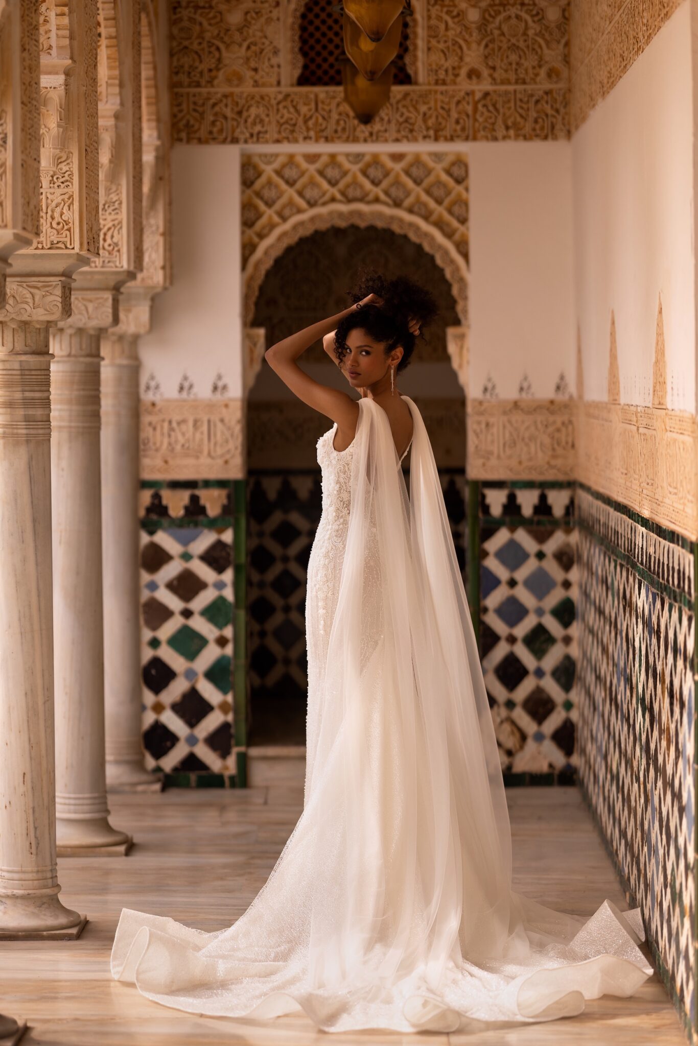 Alma de OroThis exquisite gown is crafted from intricate floral lace, meticulously adorned with delicate beads and pearls that catch the light and create a mesmerizing effect. The corset, designed with slender straps and a sophisticated square neckline, beautifully accentuates your shoulders and décolletage, enhancing your natural grace and allure. As an exquisite addition, a detachable tulle cape is fixed on the shoulders, adding a touch of ethereal beauty and creating a captivating aura as you walk down the aisle. The mermaid silhouette gracefully embraces your curves, creating a silhouette that is both alluring and romantic.
