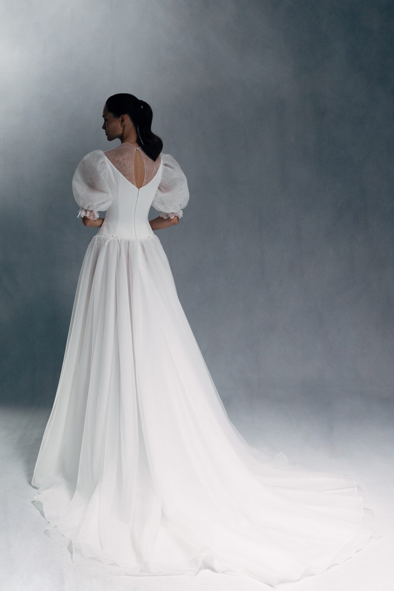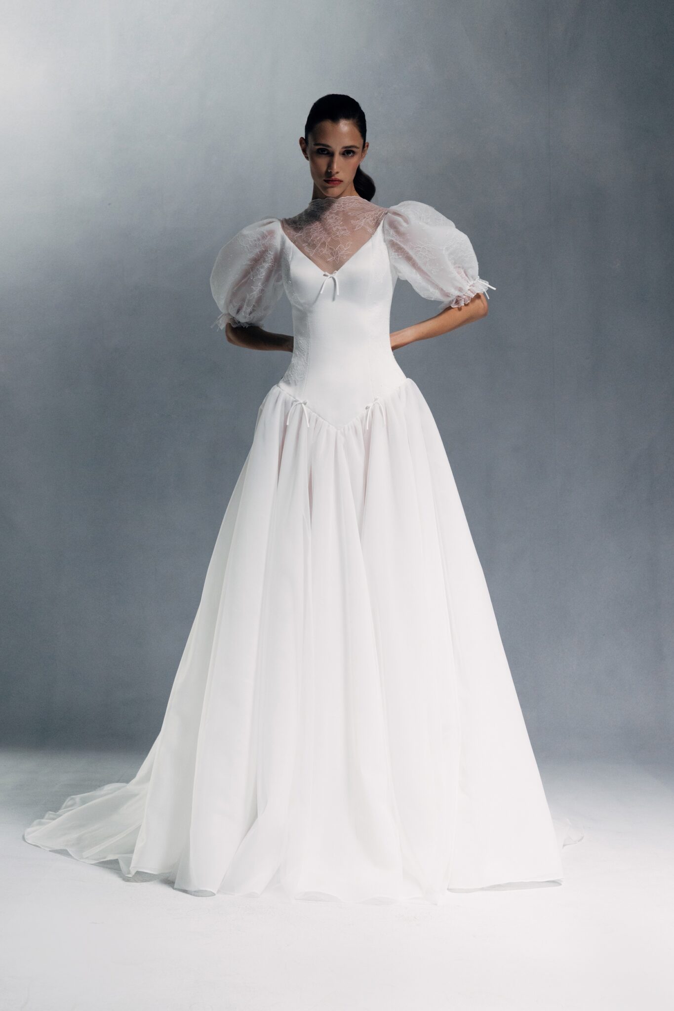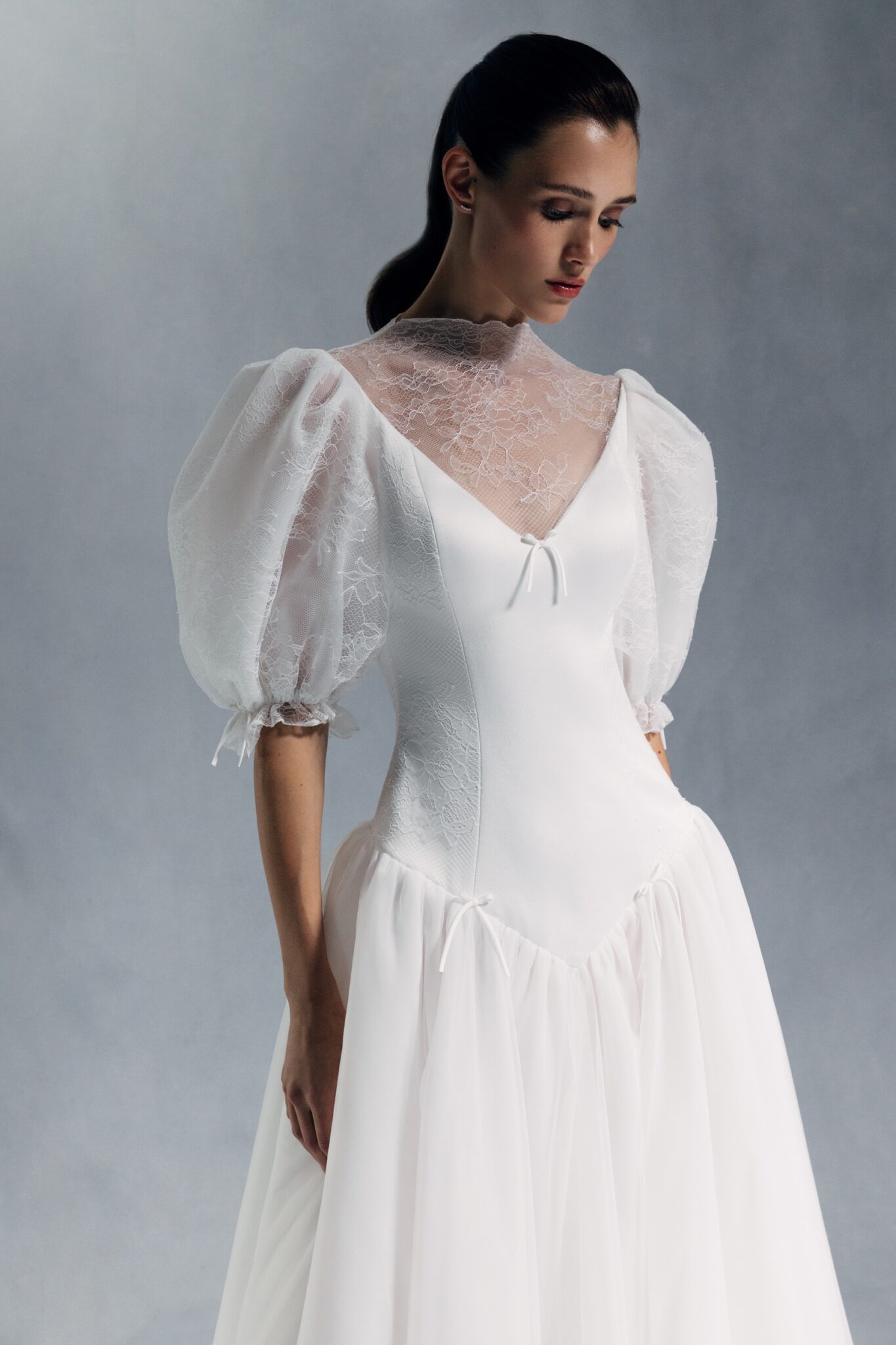 Special EditionA modest yet captivating dress featuring a V-neck and basque waist. The upper part of the gown is accented with sheer floral embroidery, drawing attention to the neckline and voluminous balloon sleeves.