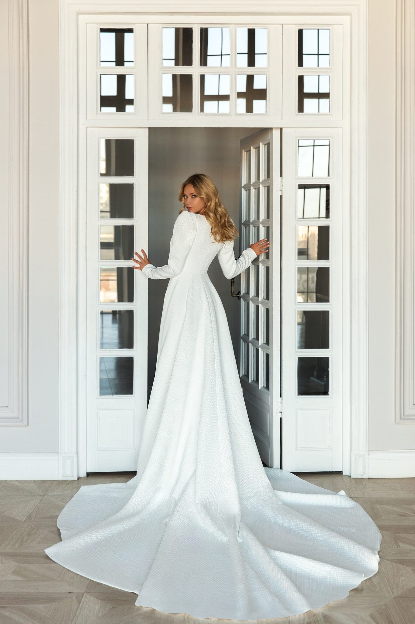 Less is more 2021Introducing Margo, a masterpiece in bridal couture. Every stitch and fold of this dress speaks volumes about its craftsmanship. With its fitted with overskirt silhouette draped in the opulence of crepe, it promises to be a showstopper, ensuring the bride’s grand entry is memorable.