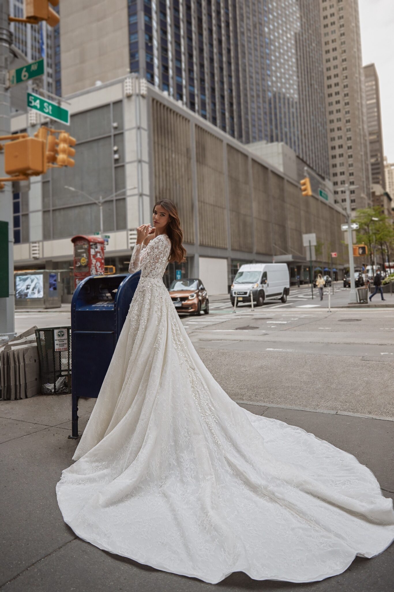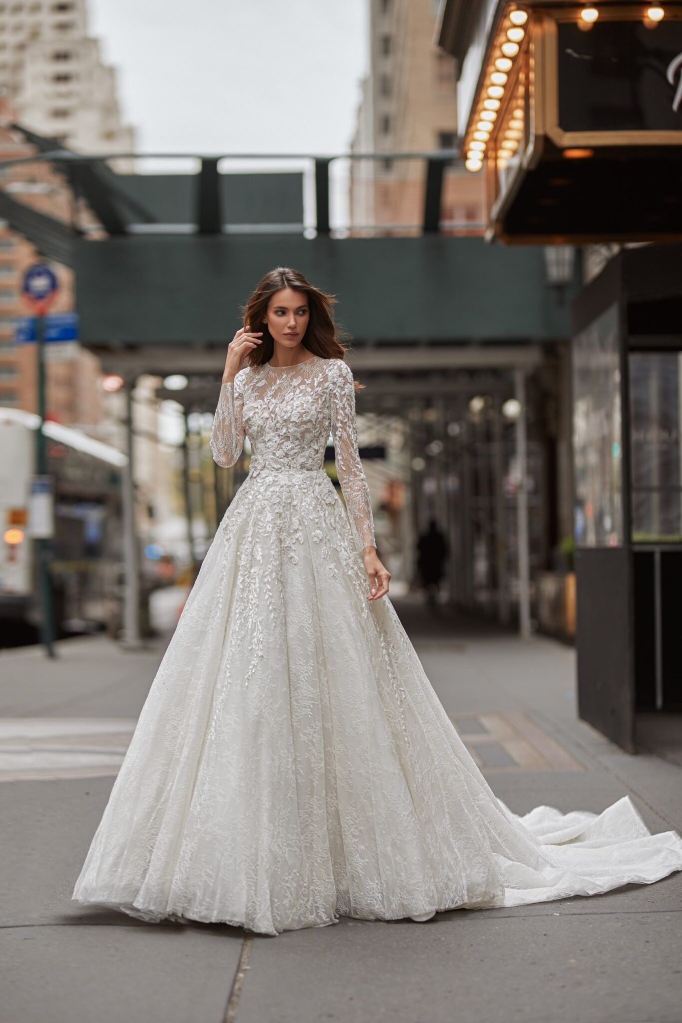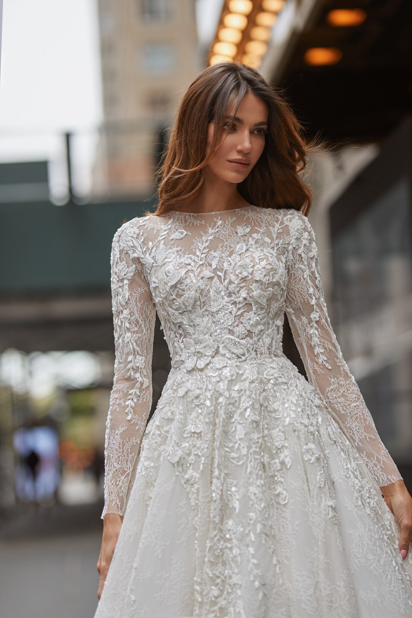 Love in the CityLaconic A-silhouette Maria wedding gown with a shining decor is just breathtaking. The bodice with a covered high neckine is embellished with 3D lace with beads and flowers. The semi-transparent fitted long sleeves are decorated with floral lace. A fabulous lush skirt, decorated with lace near the waistline, is made of embroidered Tulle and passes into a long train.