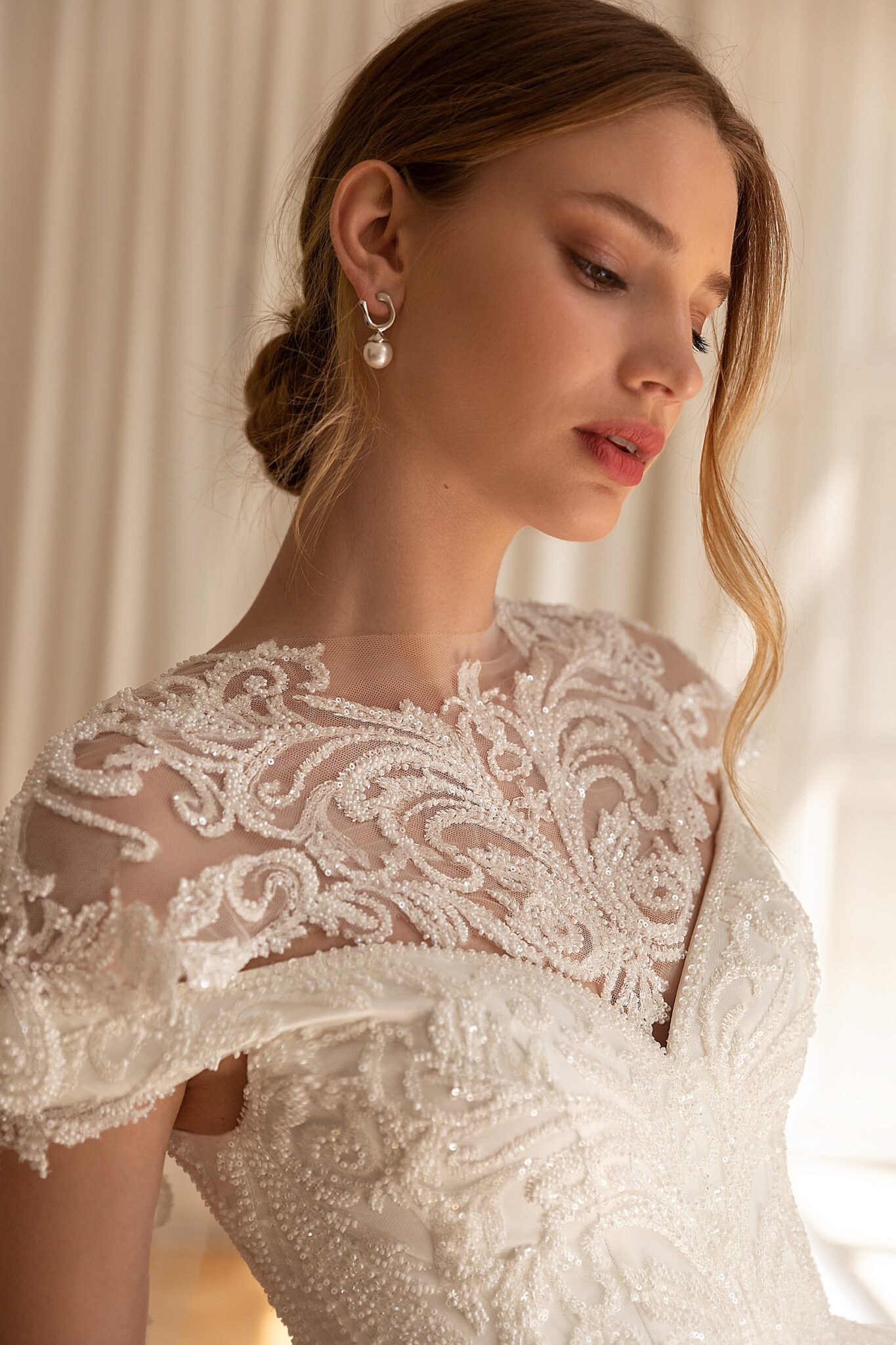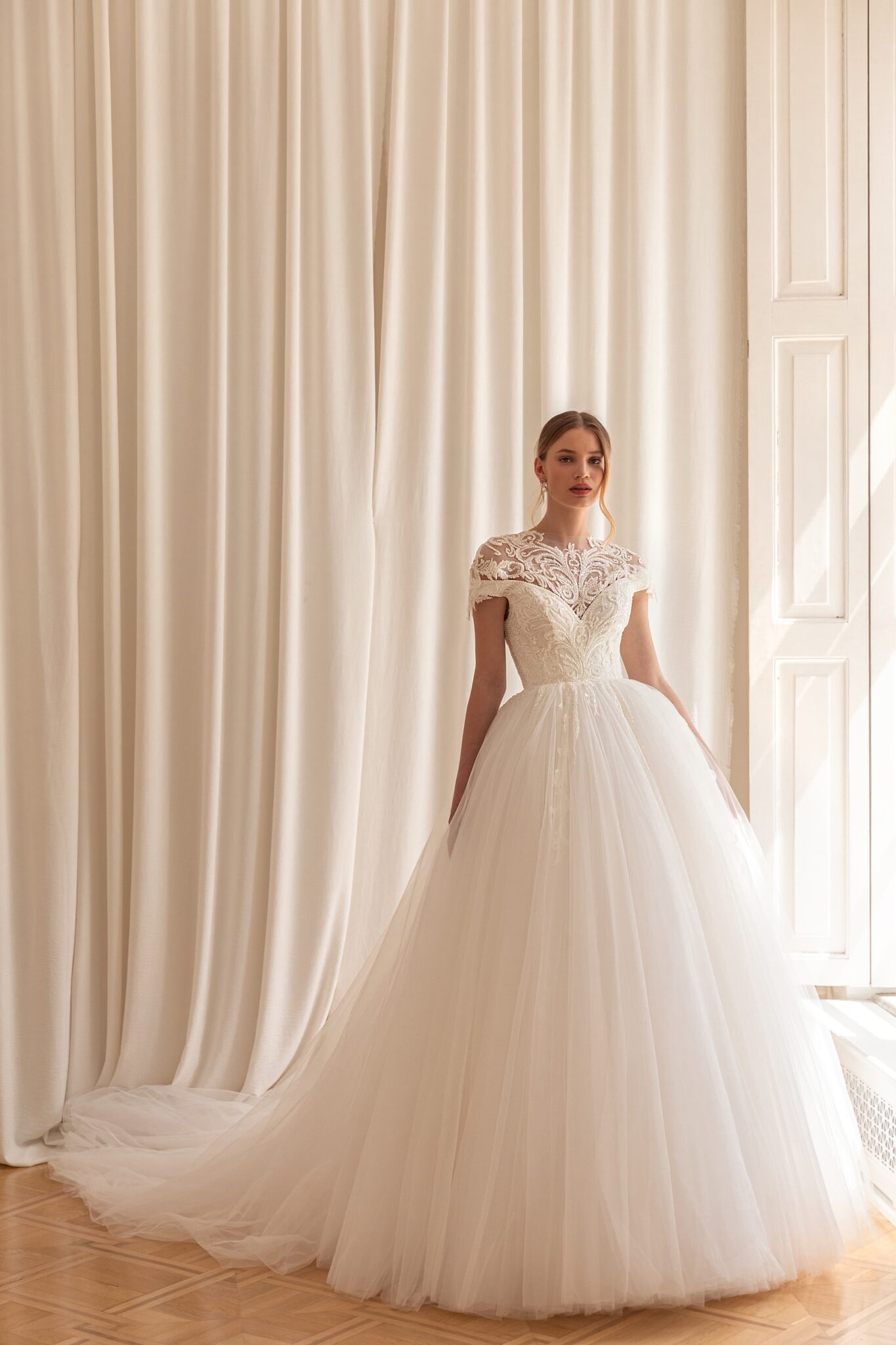 Less is more 2022Matilda is a classic ball gown with a detachable bolero. The off-shoulder corset has a V-shaped neckline and is decorated with embroidered lace with beads and crystals. The volumetric skirt is made of numerous layers of Tulle and the waist area is decorated with beaded lace. The additional bolero is made of transparent fabric with lace and embroidery and is placed above the dress neckline.