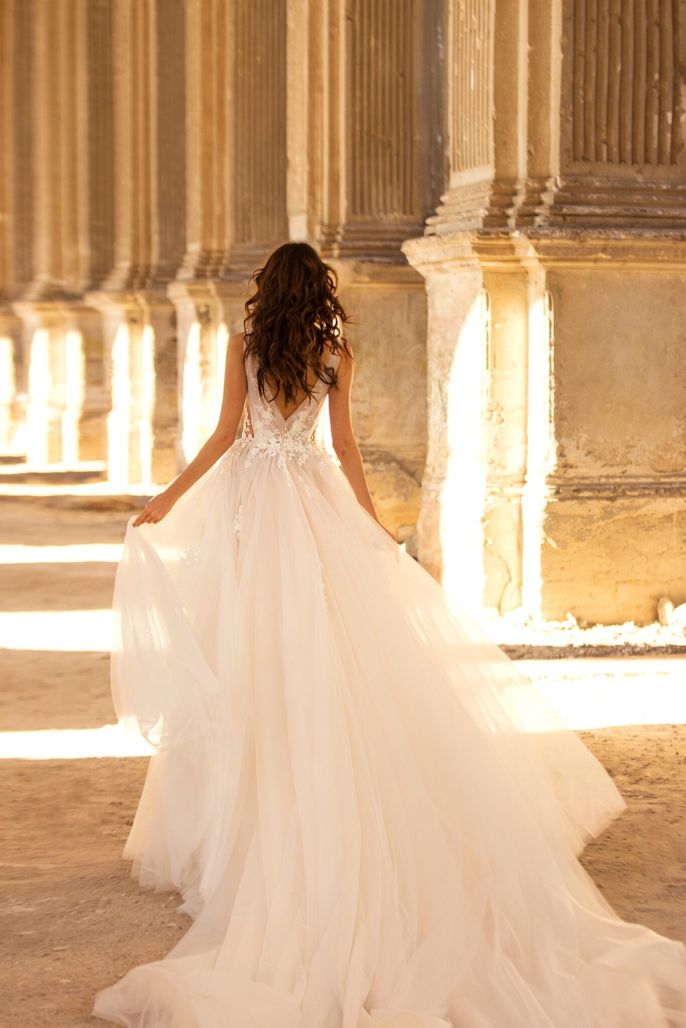 Golden HourThis tender wedding gown has a minimalistic and interesting design. A V-shaped neckline accentuates a beautiful decollate. The fantastic skirt passes into a long train.