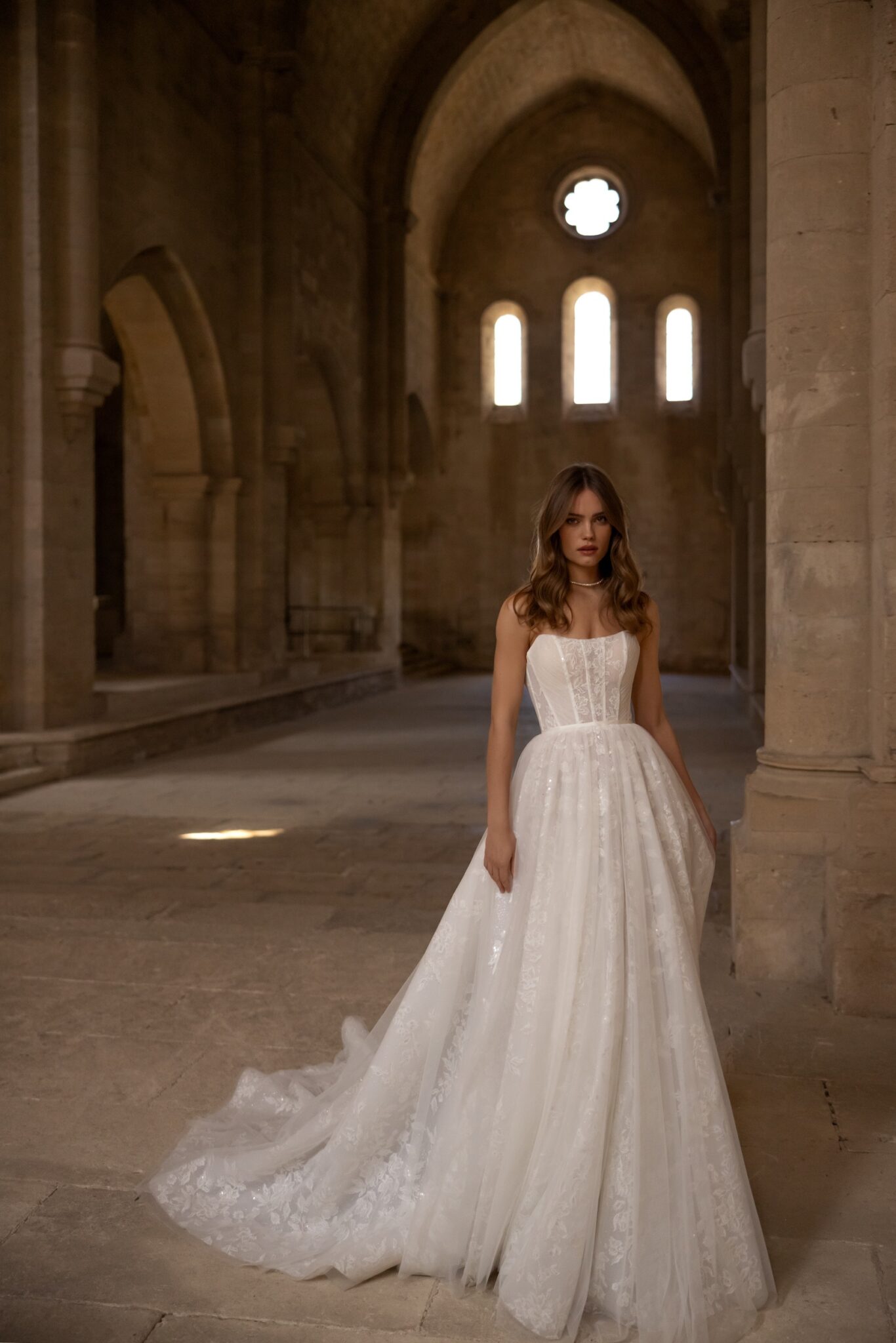 Love SpellElevate your wedding day with our exquisite a-line wedding dress, a true masterpiece of elegance and grace. Crafted from luxurious shiny floral lace, this gown embodies timeless beauty and sophistication. The strapless neckline accentuates your shoulders and décolletage, creating a stunning and romantic look. As you glide down the aisle, the skirt gracefully flows around you, showcasing the intricate details of the lace and adding a touch of ethereal charm. The long train trails behind you, exuding an aura of grandeur and enchantment. Every step you take is a captivating dance, mesmerizing all who behold you.