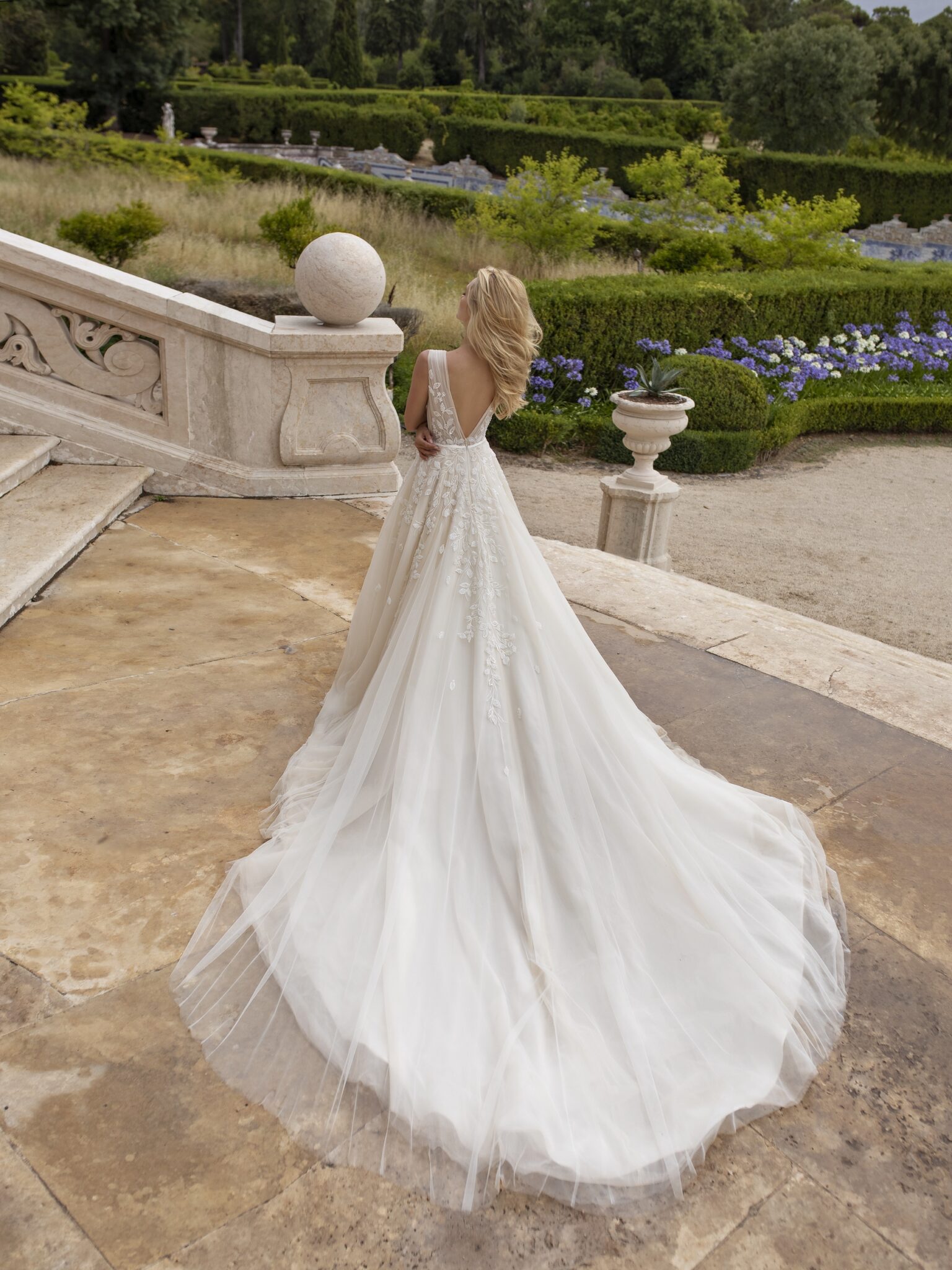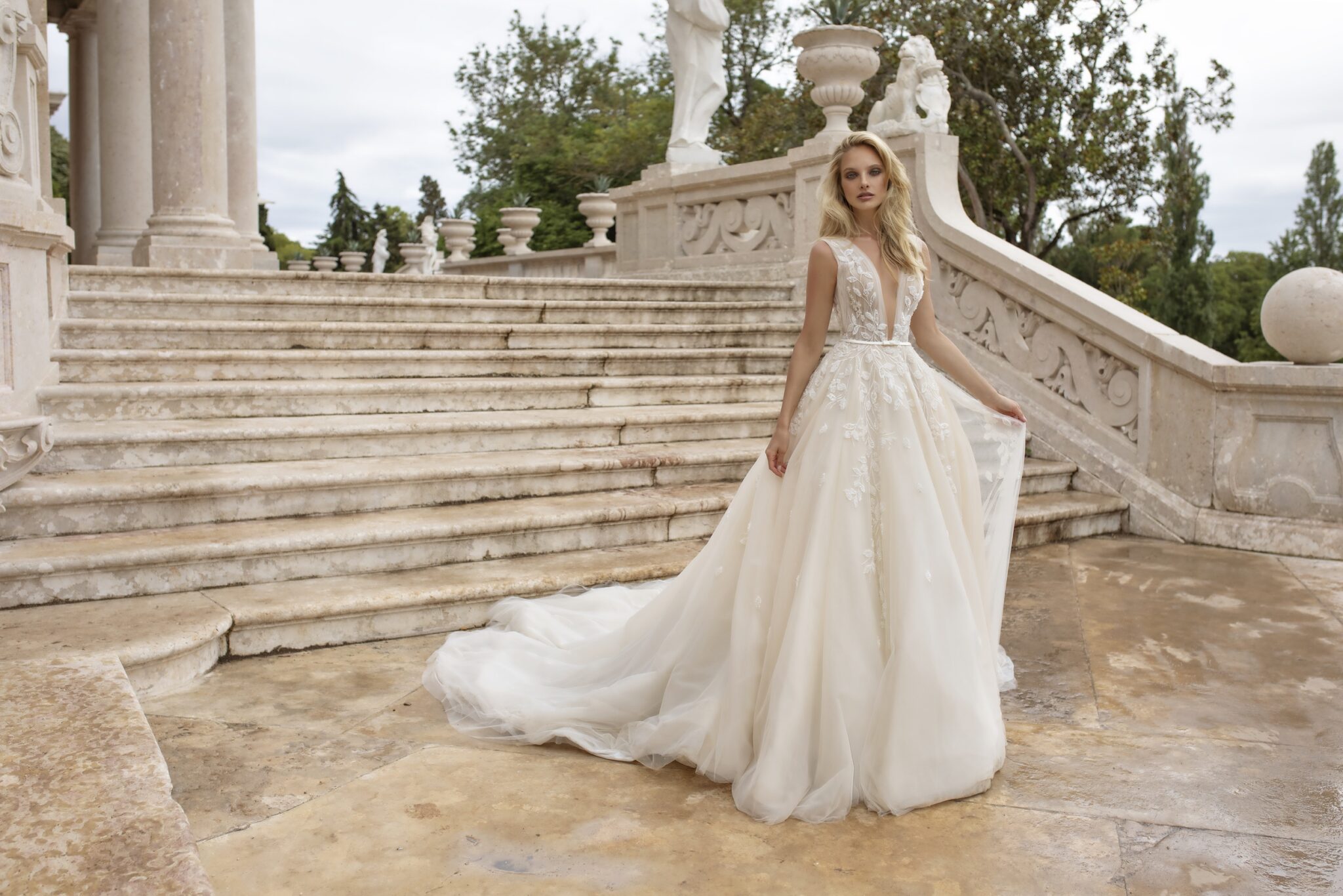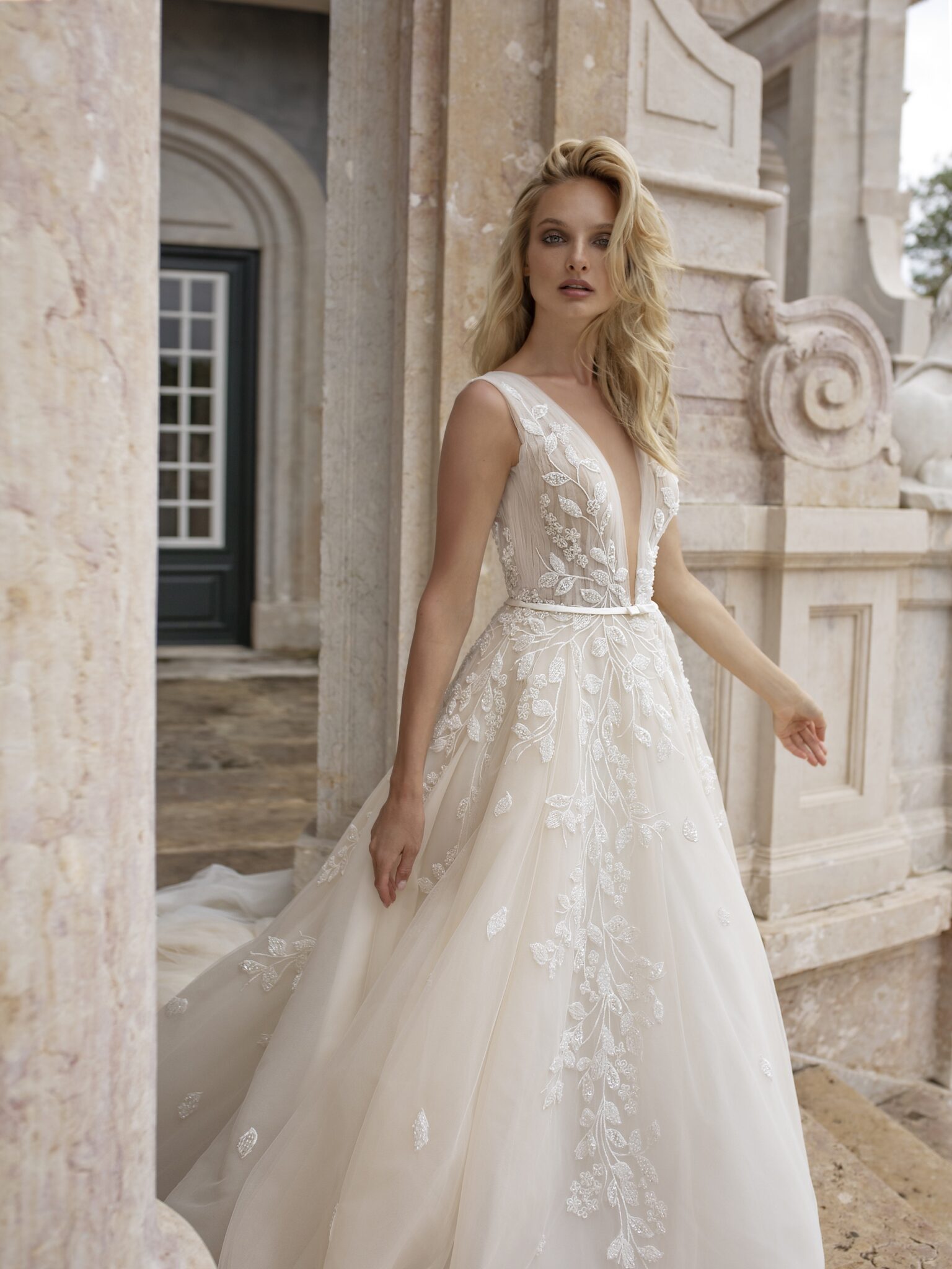 Lisbon VibesA-line Melody bridal gown is a classical wedding dress. A corsage is made of veiling and lace. Lace leaves that are decorated with beads are also found on the skirt. The skirt itself is made of many layers of veiling. V-shaped low neck and deep neckline at the back of the dress make it more feminine. A fabulous tail adds solemnity and a thin belt accentuates a waistline.