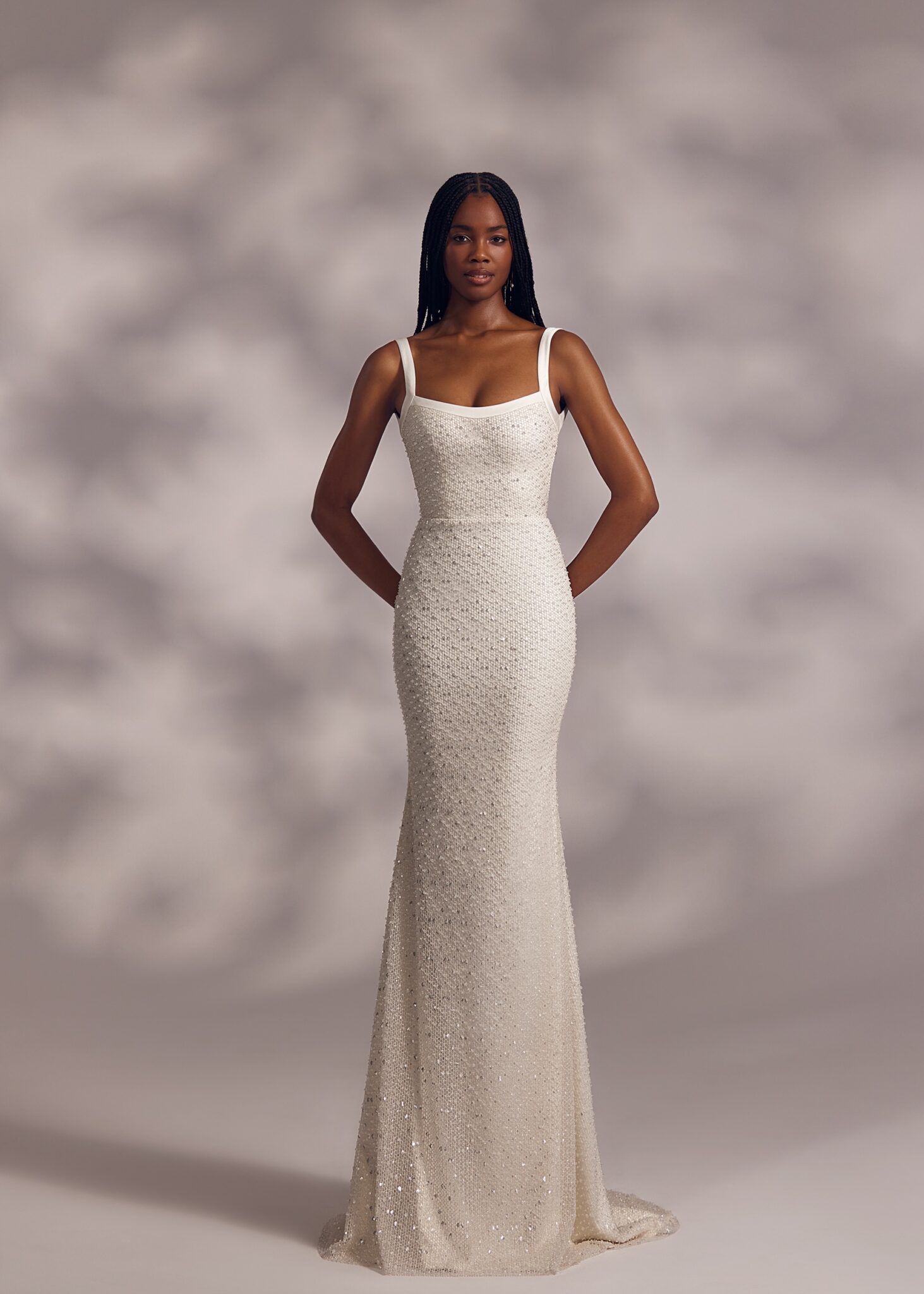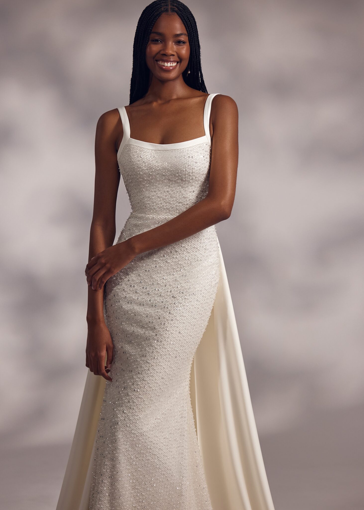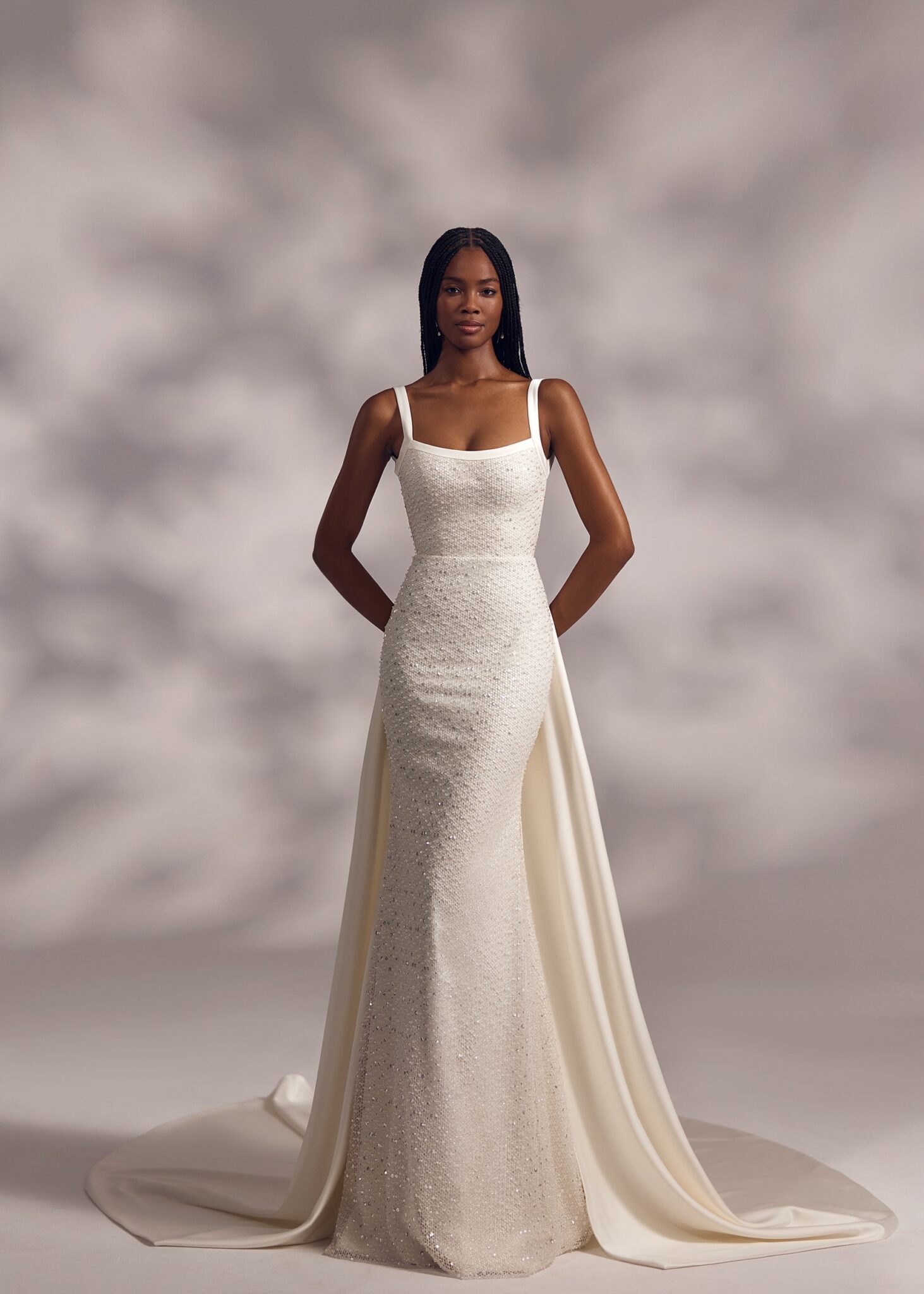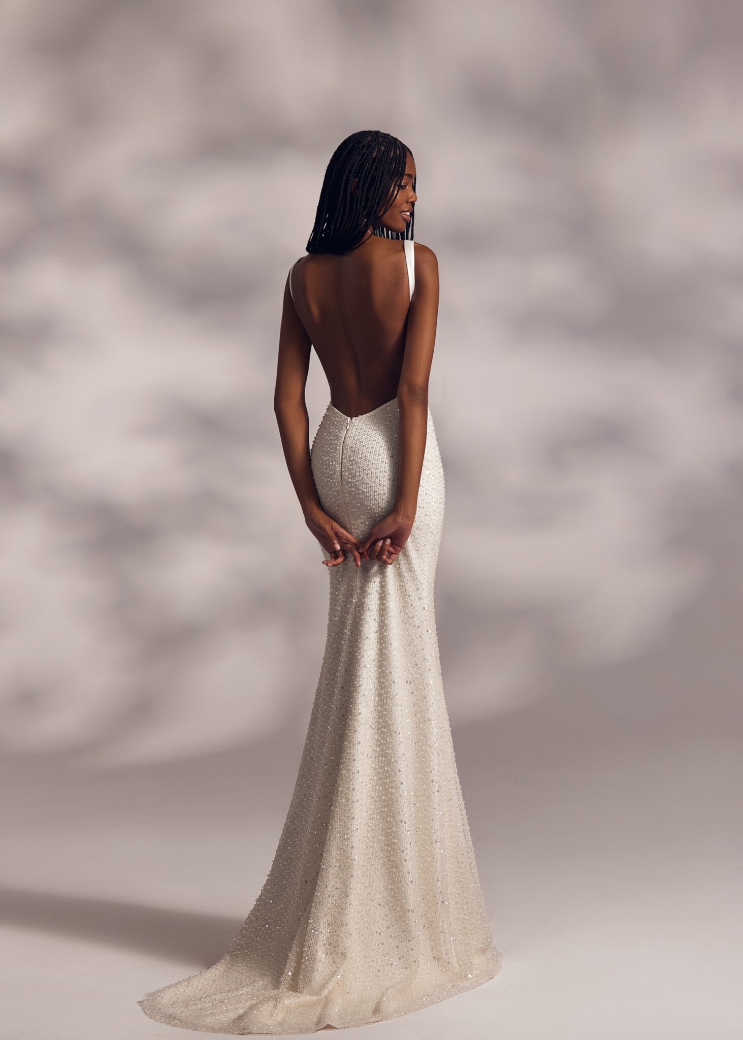 Less is More IVMerci – camisole top dress with natural waistline, open back and straight skirt. The dress is covered with beaded mesh and complemented with detachable overskirt trail.