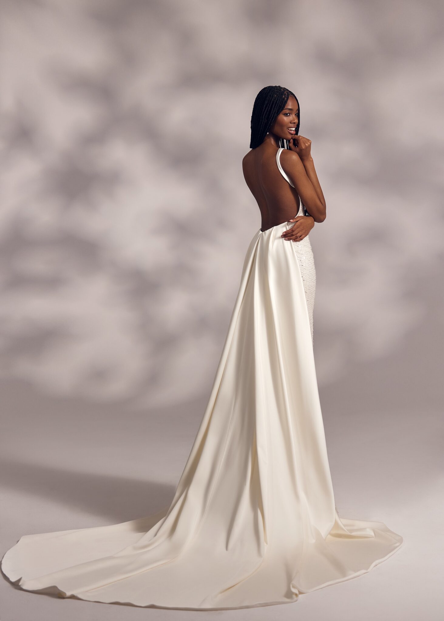 Low back wedding dress «Merci» with detachable overskirt