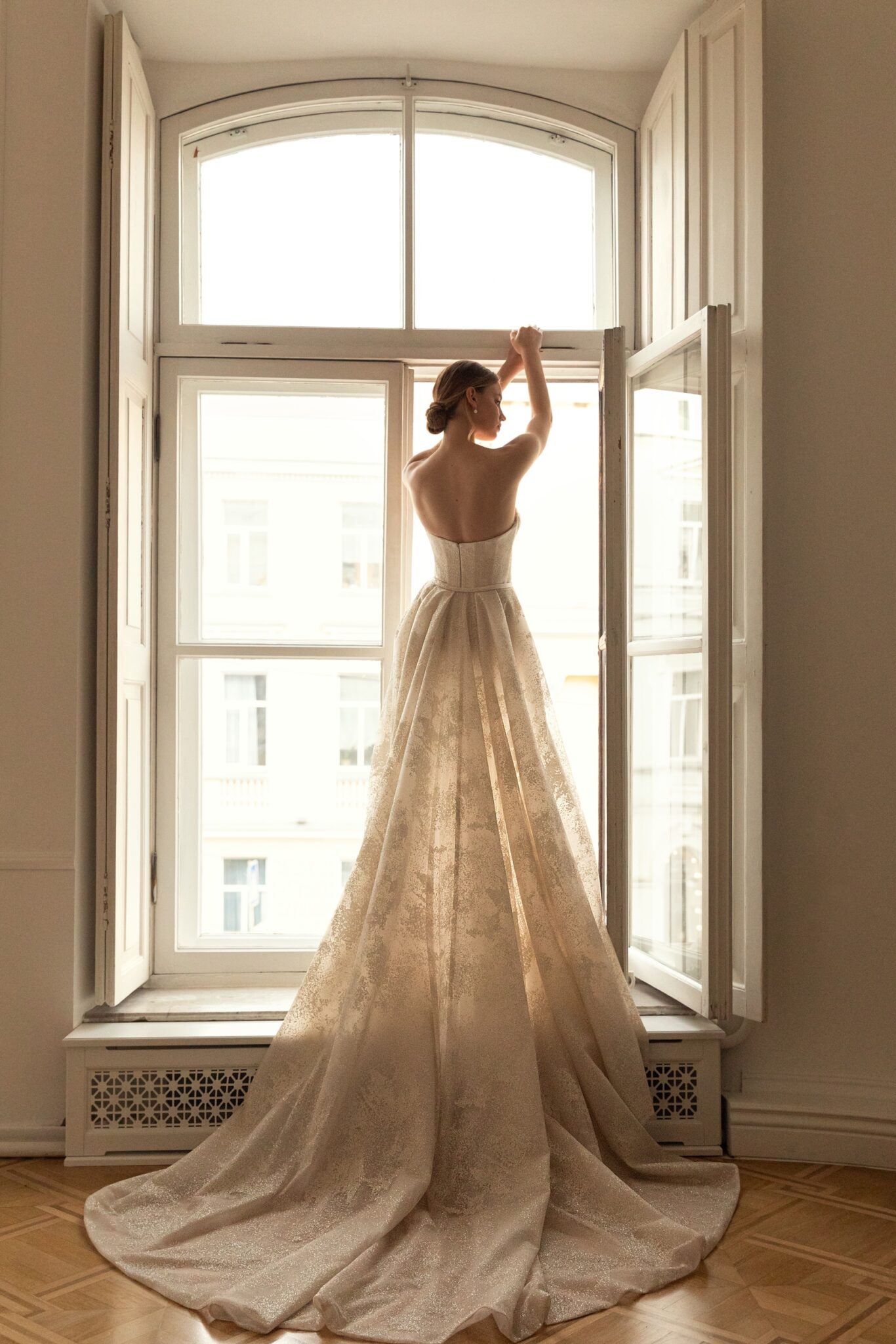 Less is more 2022Milena wedding gown is entirely made of sparkling fabric with light pattern in soft Ivory colour. The corset is strapless and has a feminine sweetheart neckline. The sheath dress has a Straight cut, is fitted on the hips and becomes looser down the silhouette. The detachable skirt is fixed on the waist and has a fabulous train.