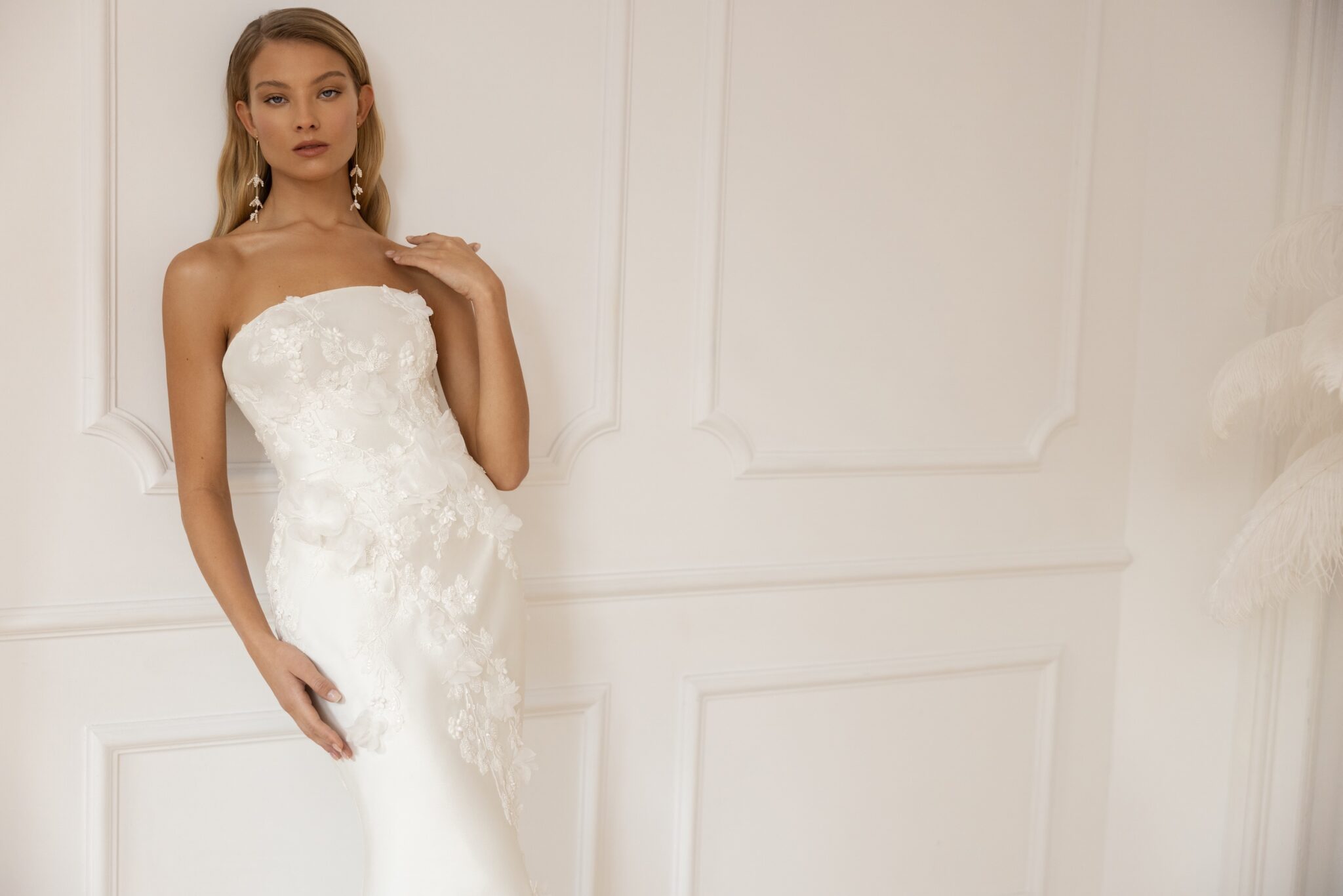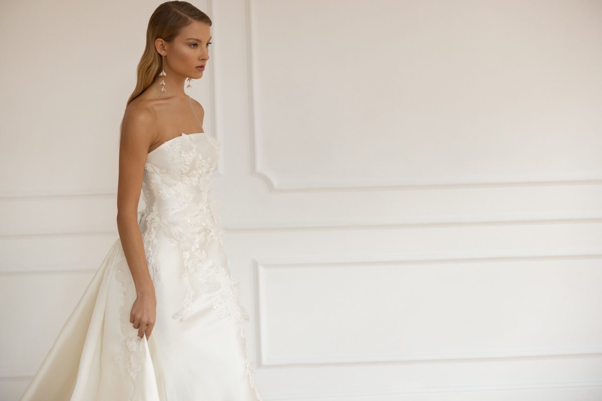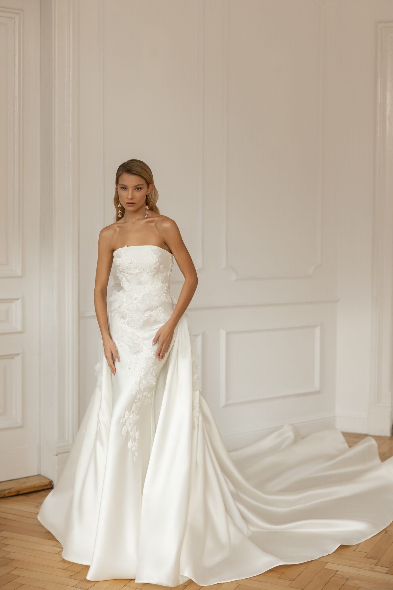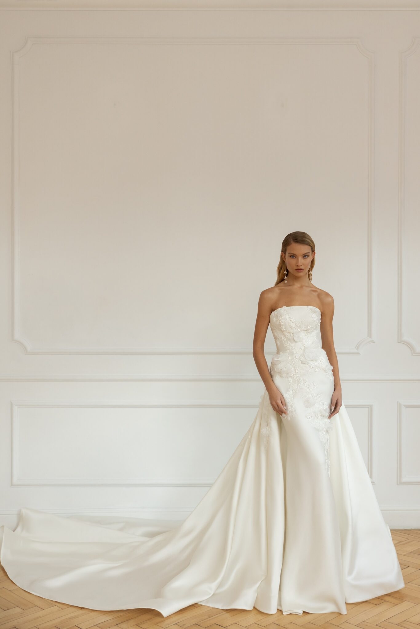 Less is more 2023, Plus SizeThe Minelli bridal gown is a masterpiece in form and fit. Cut in our signature Mikado, it accentuates the curves of the female body, with minimalist embroidered lace and 3D organza flowers that pass from the bodice through the hips along a flare skirt. A strapless bodice with gently curved Straight neckline features an open back. Accessorized with a dramatic voluminous overskirt, Minelli takes on extra volume for a grand down-the-aisle entrance