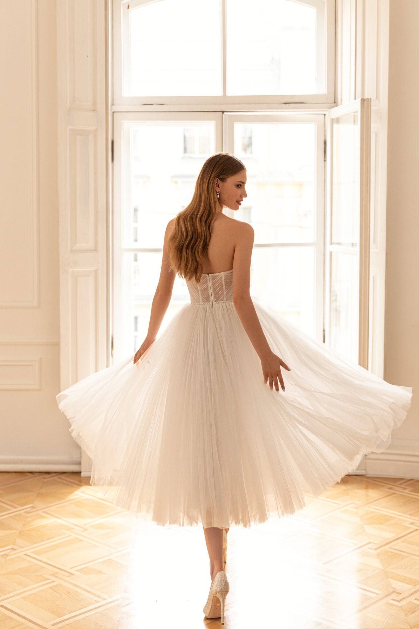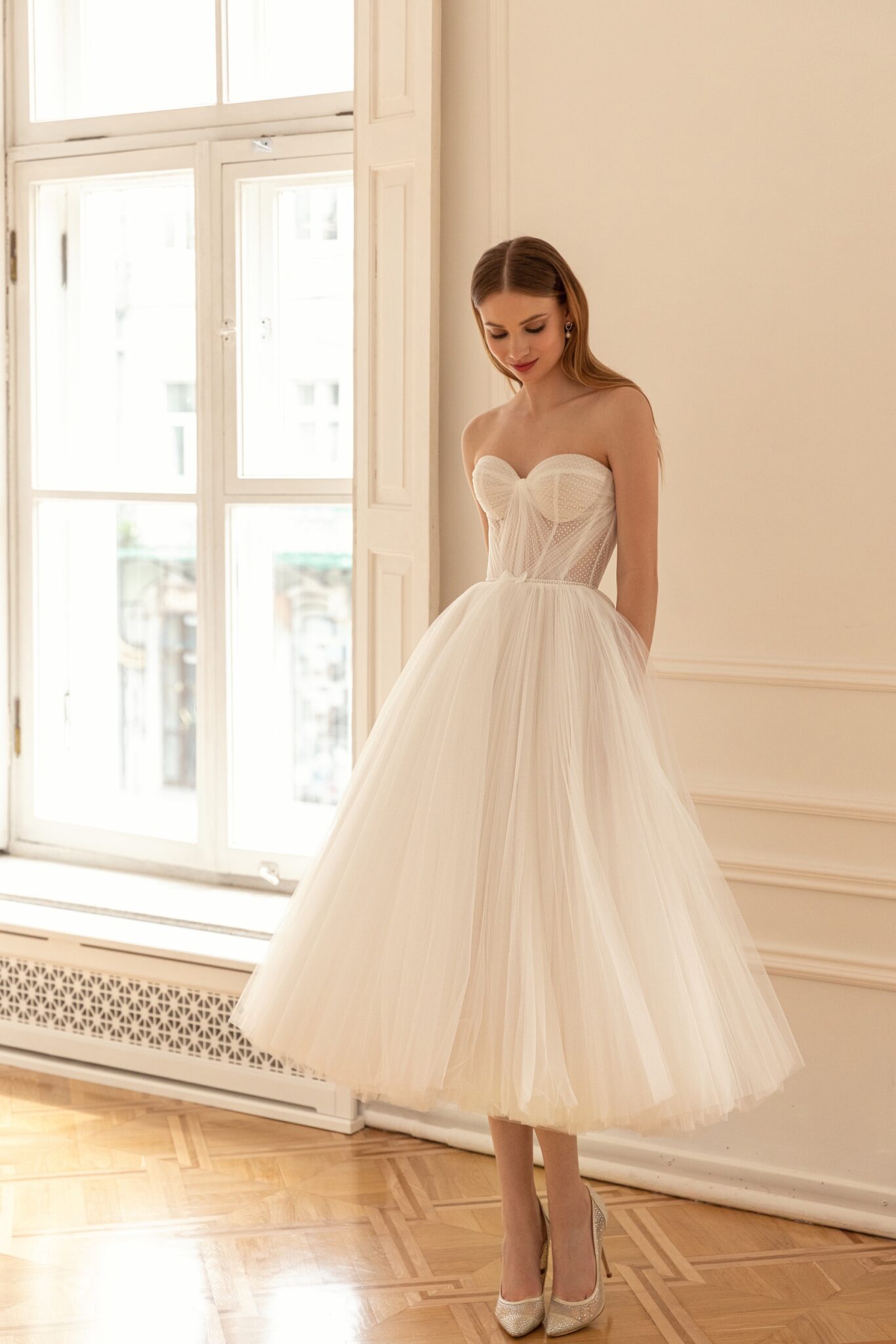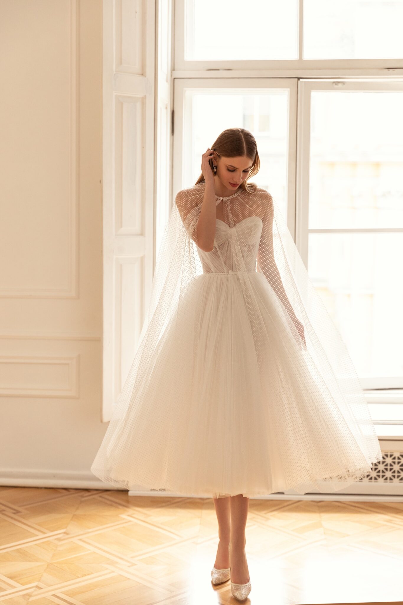 Less is more 2022Molly is a pretty and feminine style with a semi-transparent cape. The main dress is made in midi length with a strapless corset decorated with a sweet heart neckline. The dress is made of weightless Tulle with polka-dot pattern and the skirt is decorated with pleats. The datachable bolero is fixed on the neck and creates a unique silhouette.