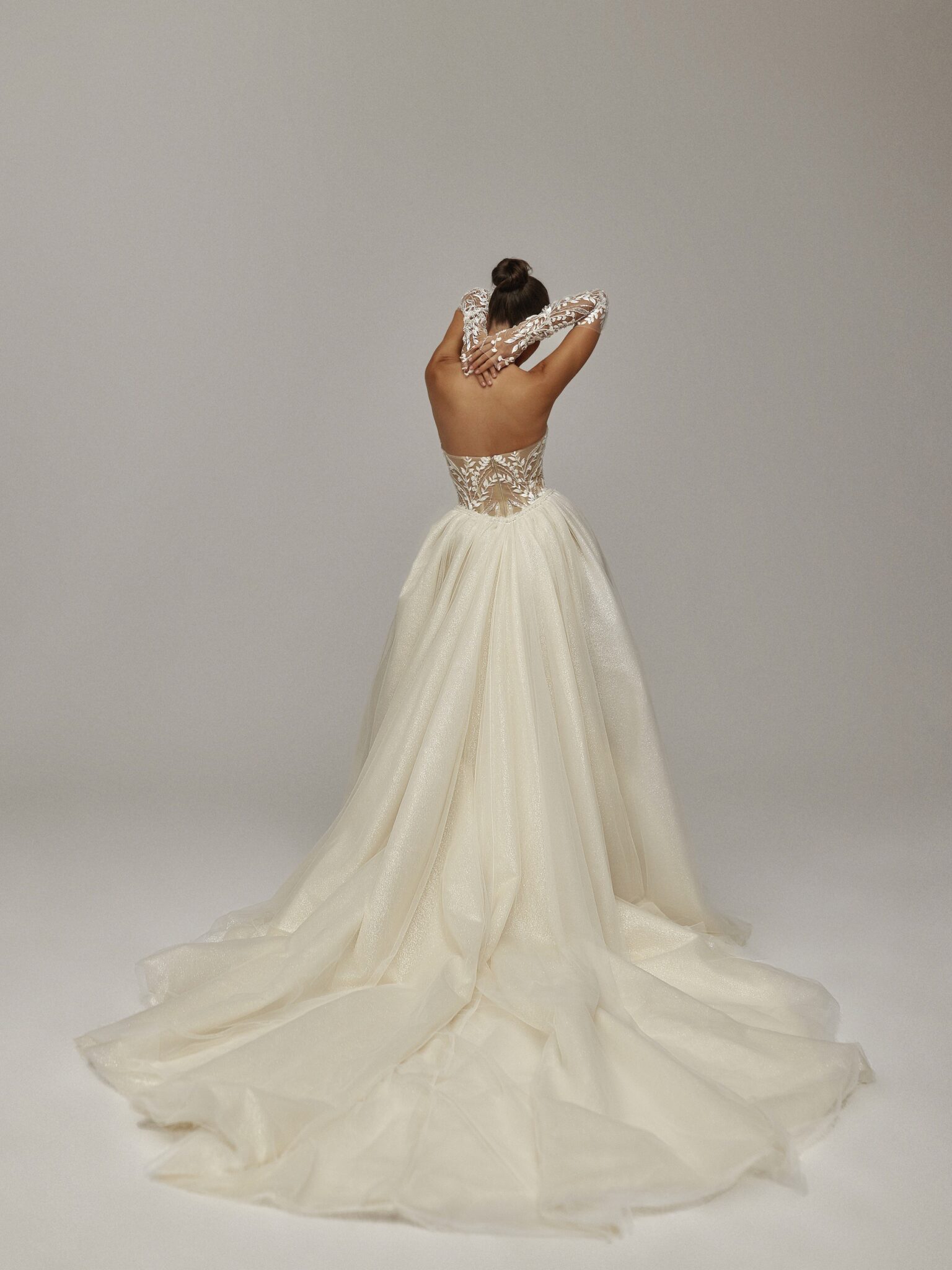 The gown features a detachable overskirt that forms a flowing train, secured with discreet snaps for easy removal. This allows the bride to transform her look — from a regal ceremony gown to a sleek, modern silhouette for the evening celebration.