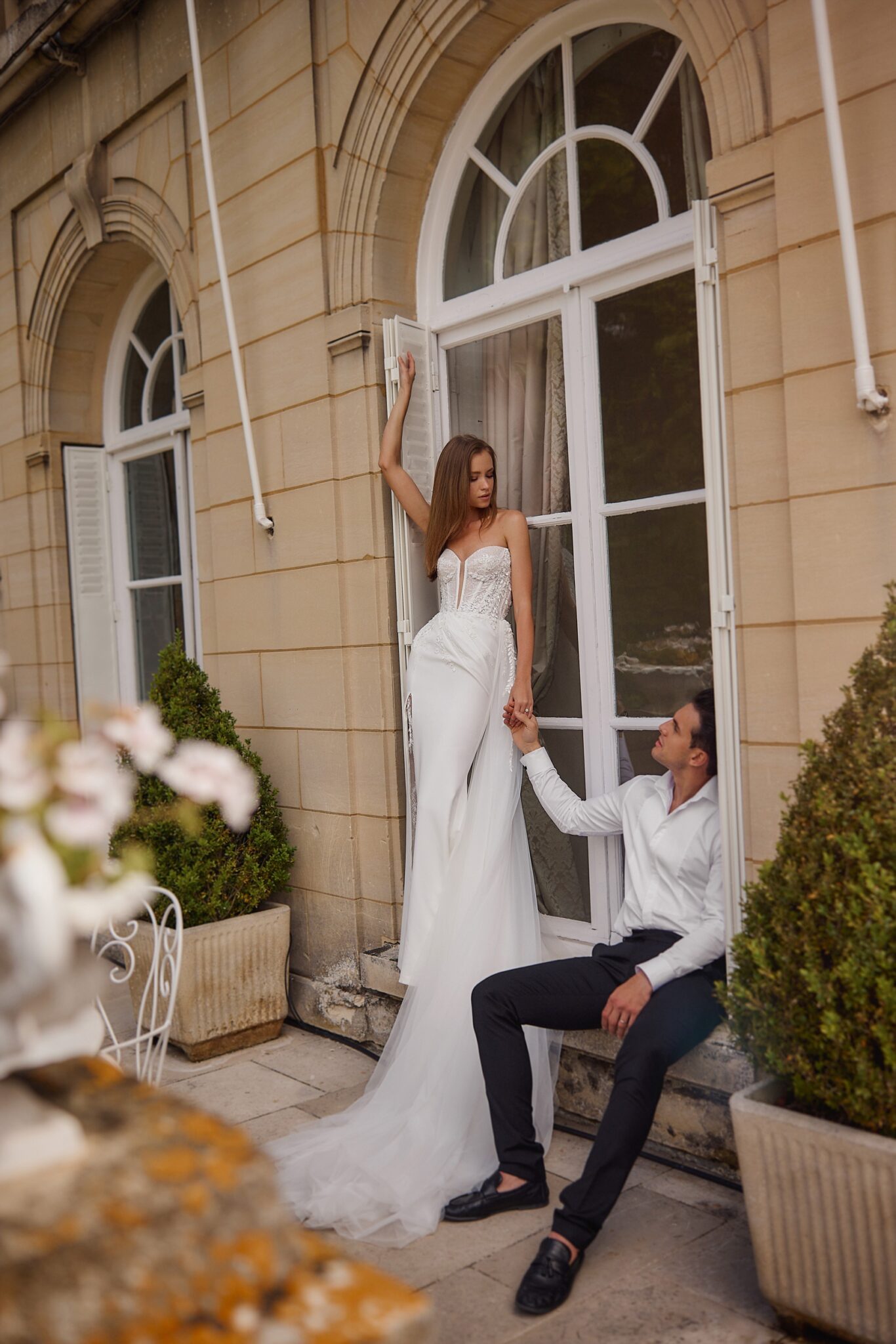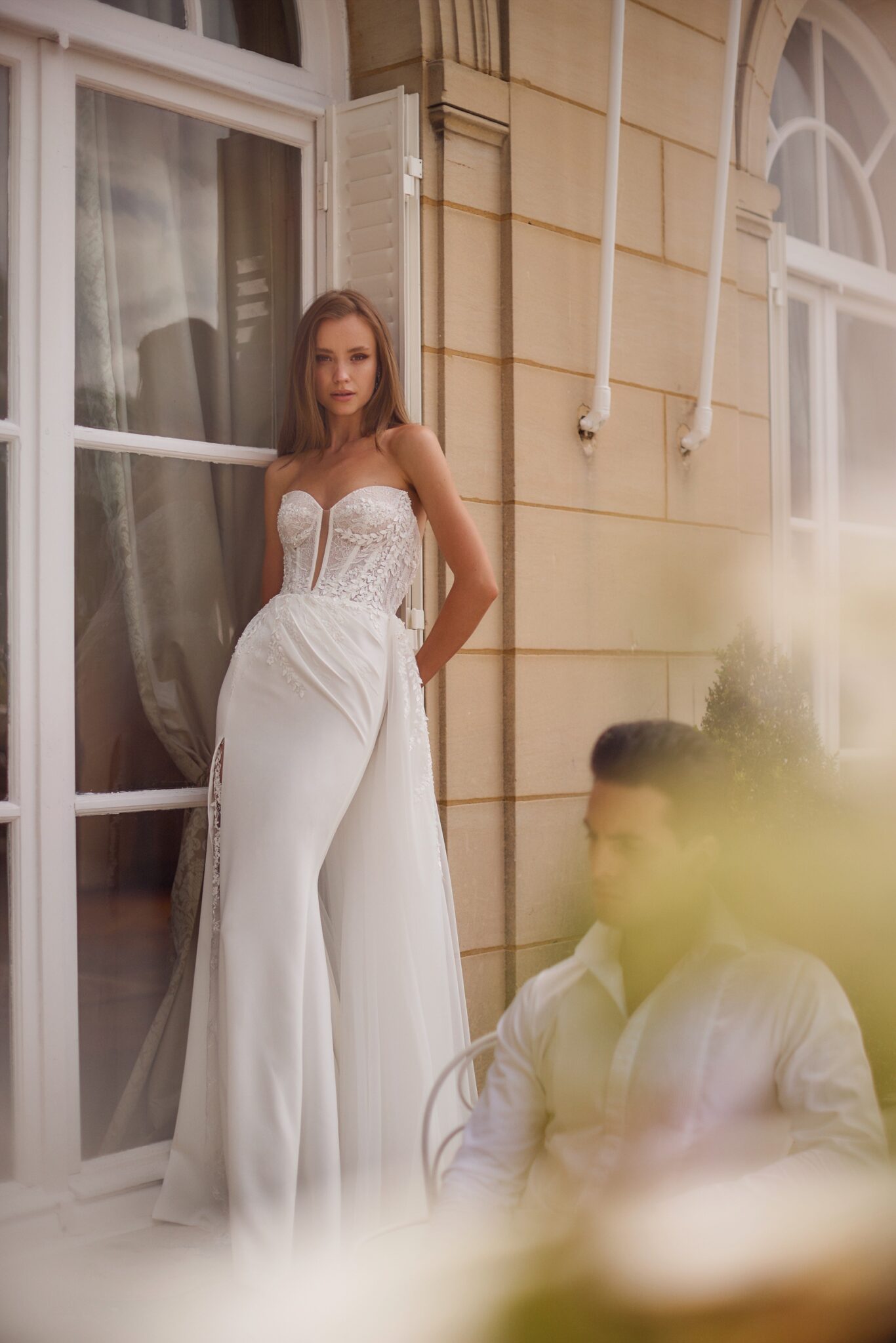 Love Story, Plus SizeHeart-shaped neckline dress with lace-up back and translucent midline on the top. The asymmetric diagonal shirring on the left hip and full split on the right side of the skirt add a dynamic touch. The dress features sophisticated embroidery of tiny leaves and flowers and is complemented by a translucent floral embroidered underskirt and an upper skirt of light voluminous tulle fabric, contributing to the amount of handwork by an additional leaves-and-flowers waist outlining.