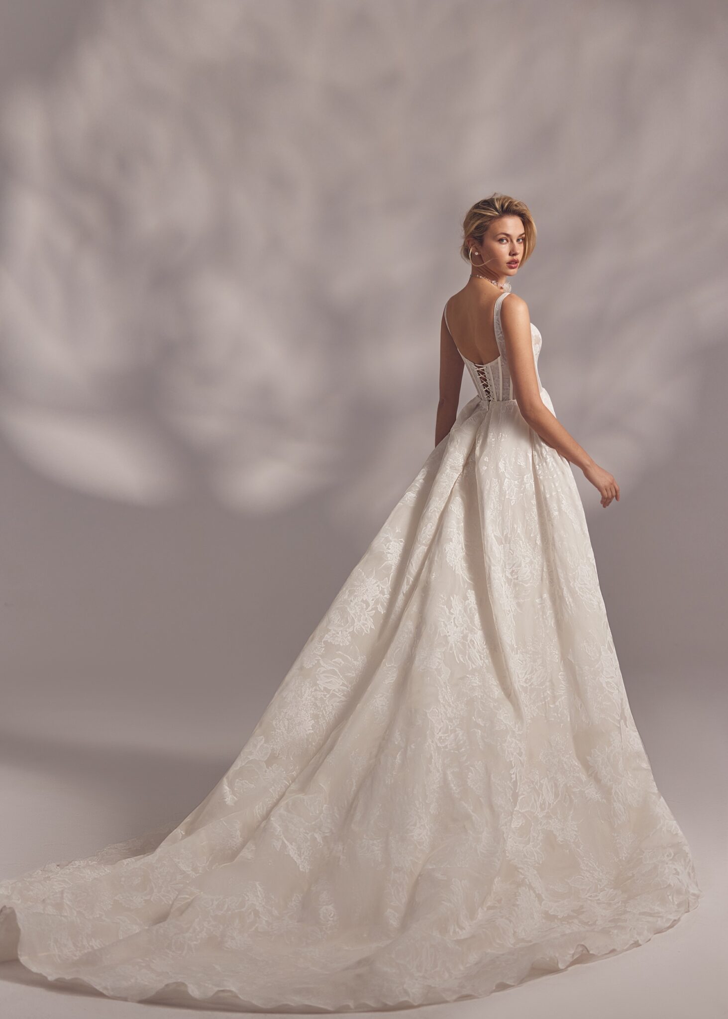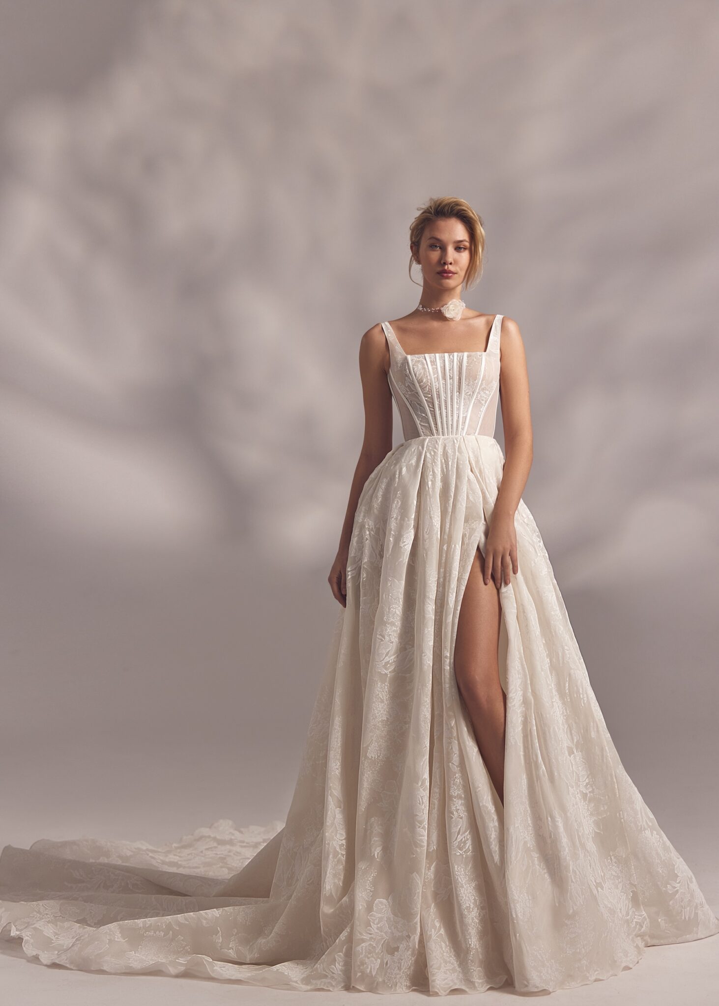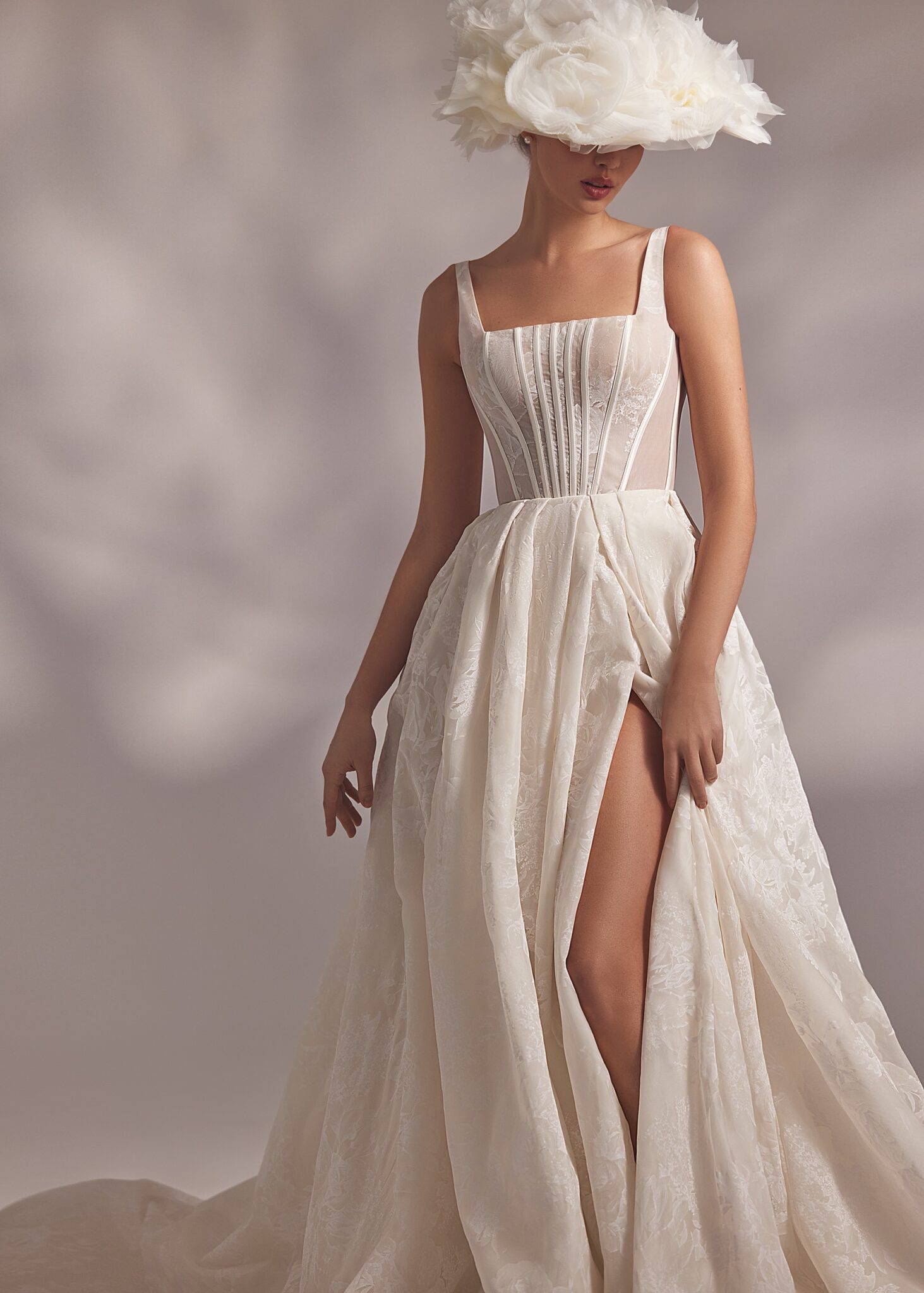 Less is More IVMoraya – camisole detailed corset dress with lightweight floral lace ornaments and split skirt covered with tuille lace embroidered overlay.