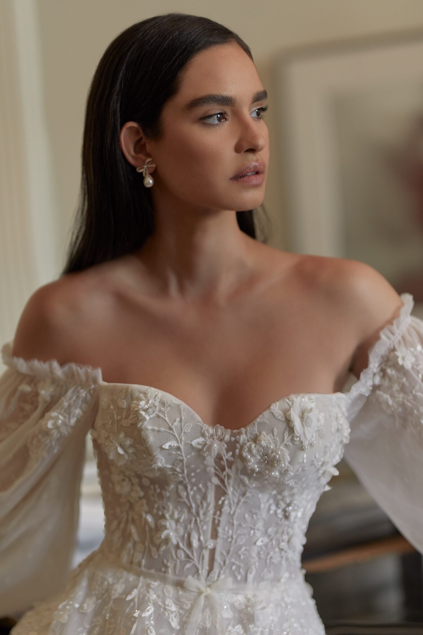 Love in the CityNadin ball gown reminds a wedding dress for a real princess. Strapless lace corsage with lowered shoulders is decorated with 3D lace with small flowers. Those flowers are found at the waistline and the skirt. Tender translucent long sleeves are embellished with veiling bows. The loose A-line skirt looks fantastic with numerous layers of Tulle. Veiling skirt is completed with fantastic train.