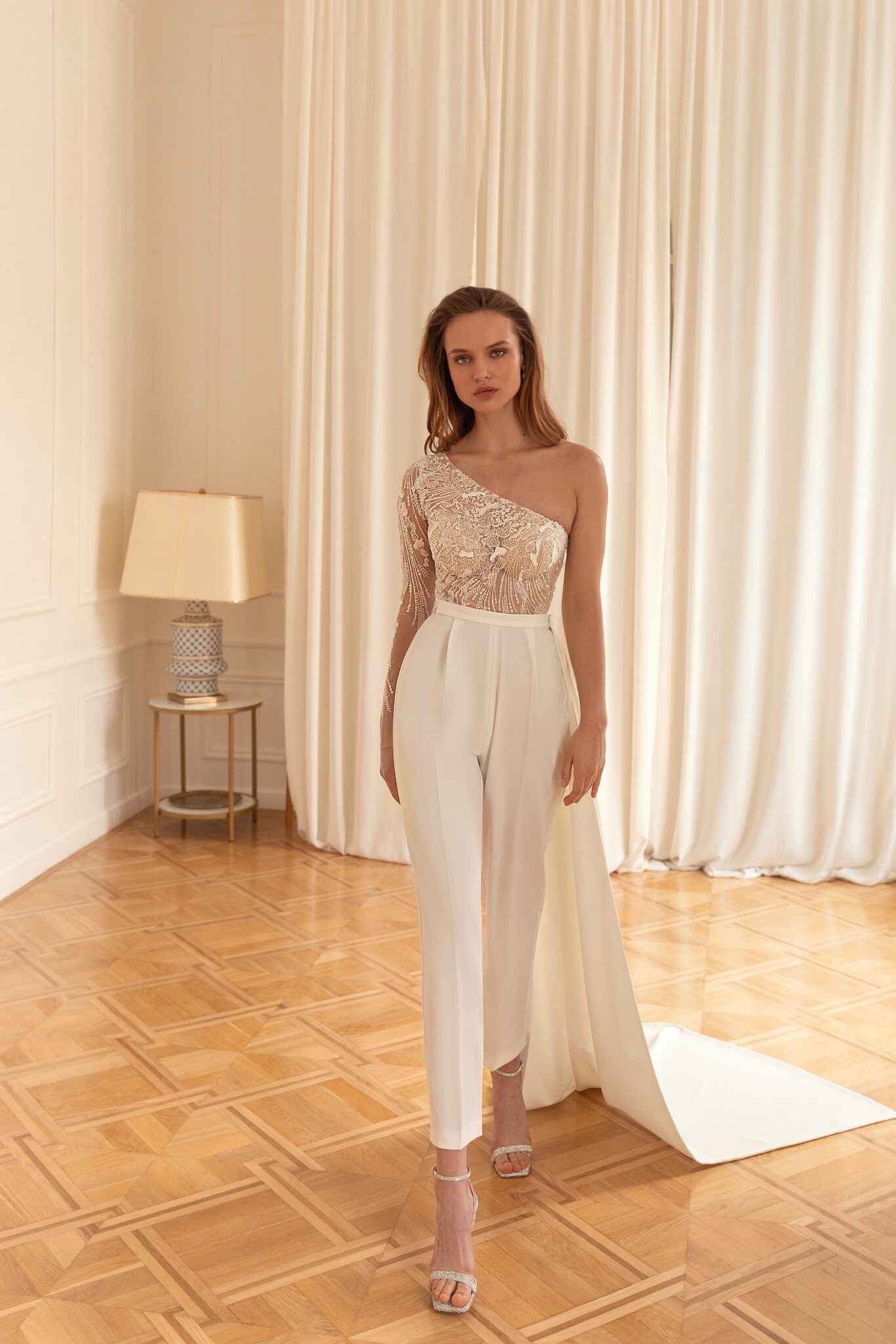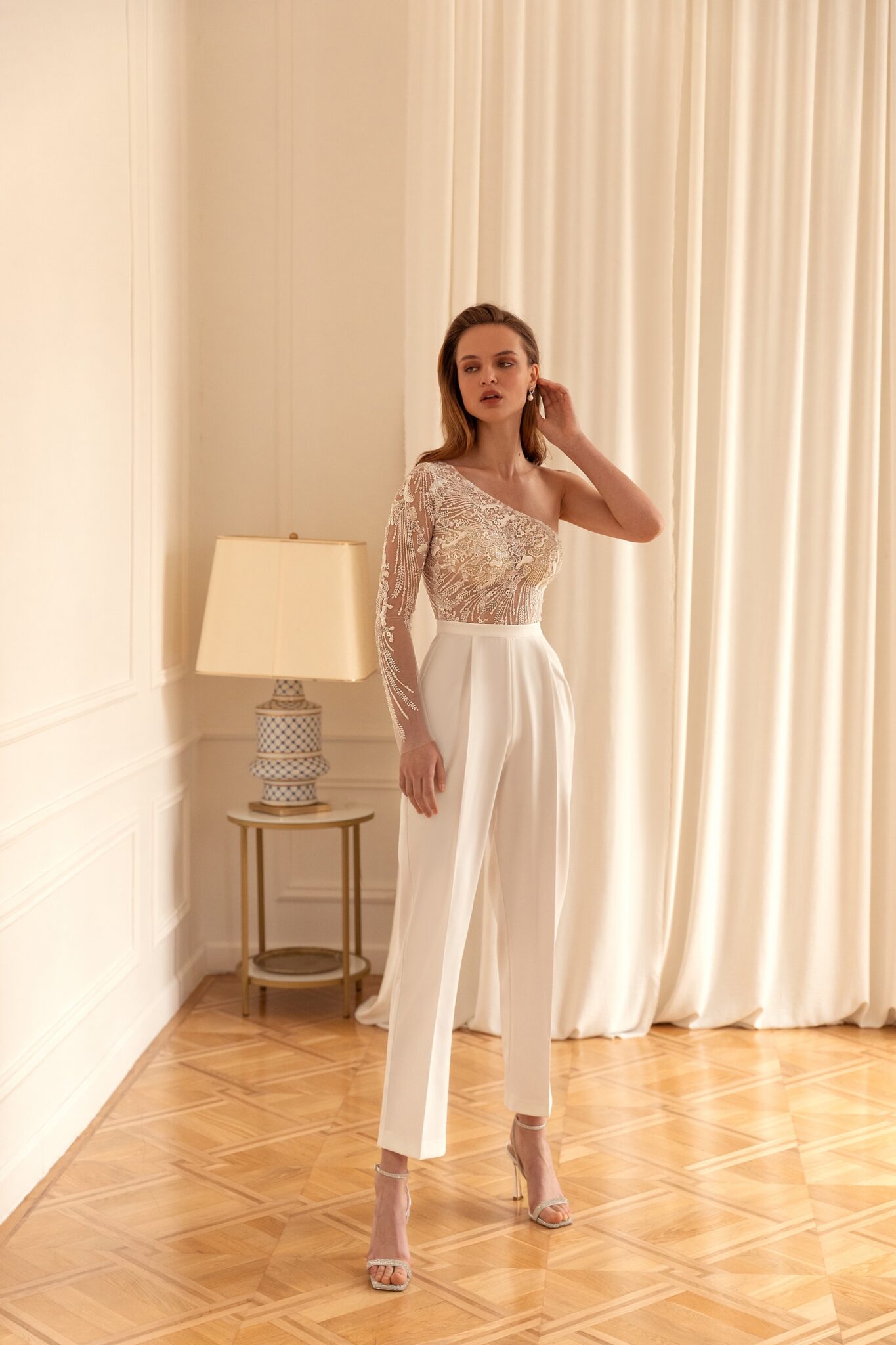 Less is more 2022Napoli is an extravagant option for a daring bridal look. The wedding jumpsuit has Straight cut ankle length trousers made of white crepe-satin. An upper part of the jumpsuit is made of translucent fabric that is decorated with lace patterns and embellished with beads and sequins. The top has an exquisite neckline with one long sleeve and the high waist trousers are a perfect match. A fantastic overskirt with small train can be fixed on the bride’s waistline.