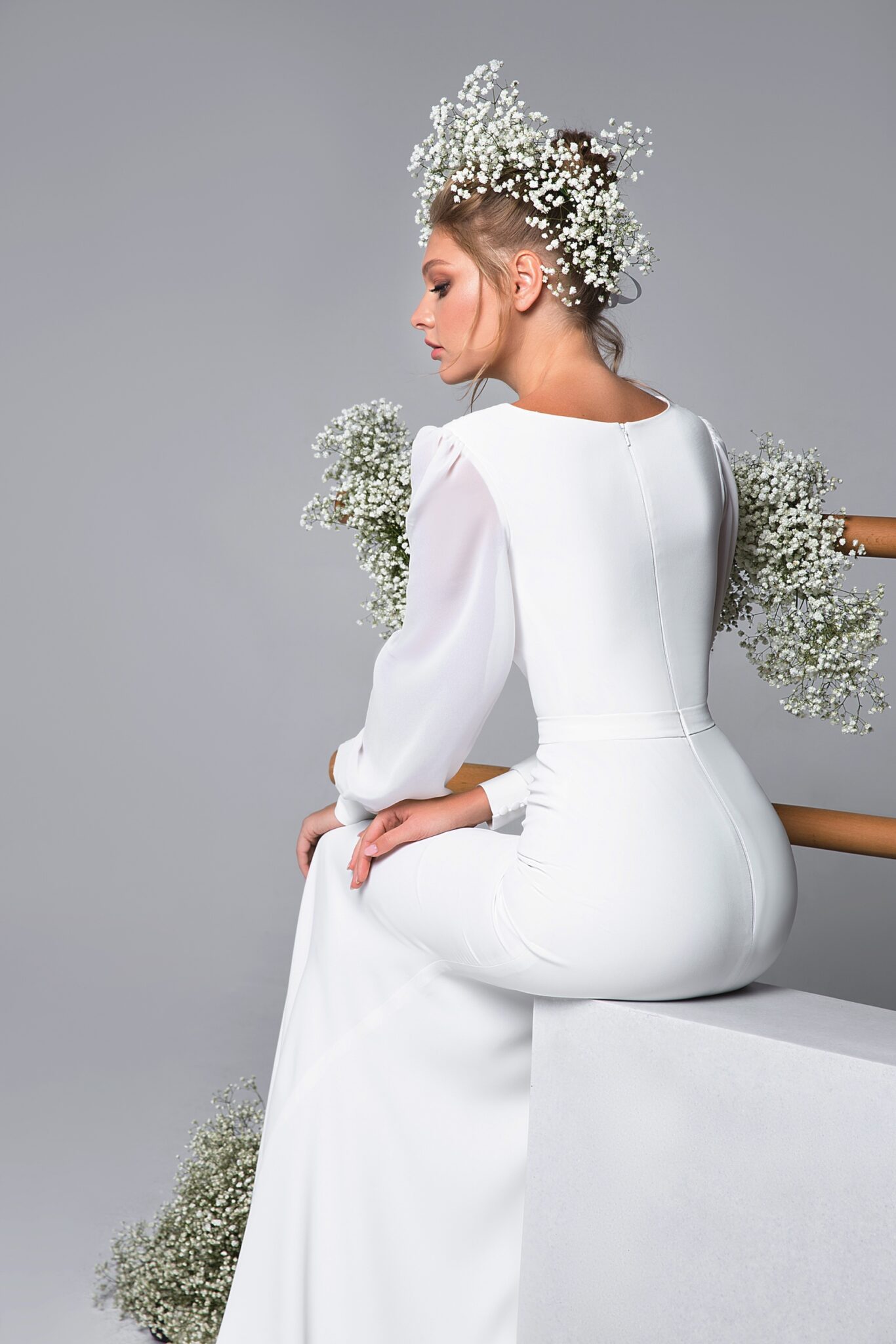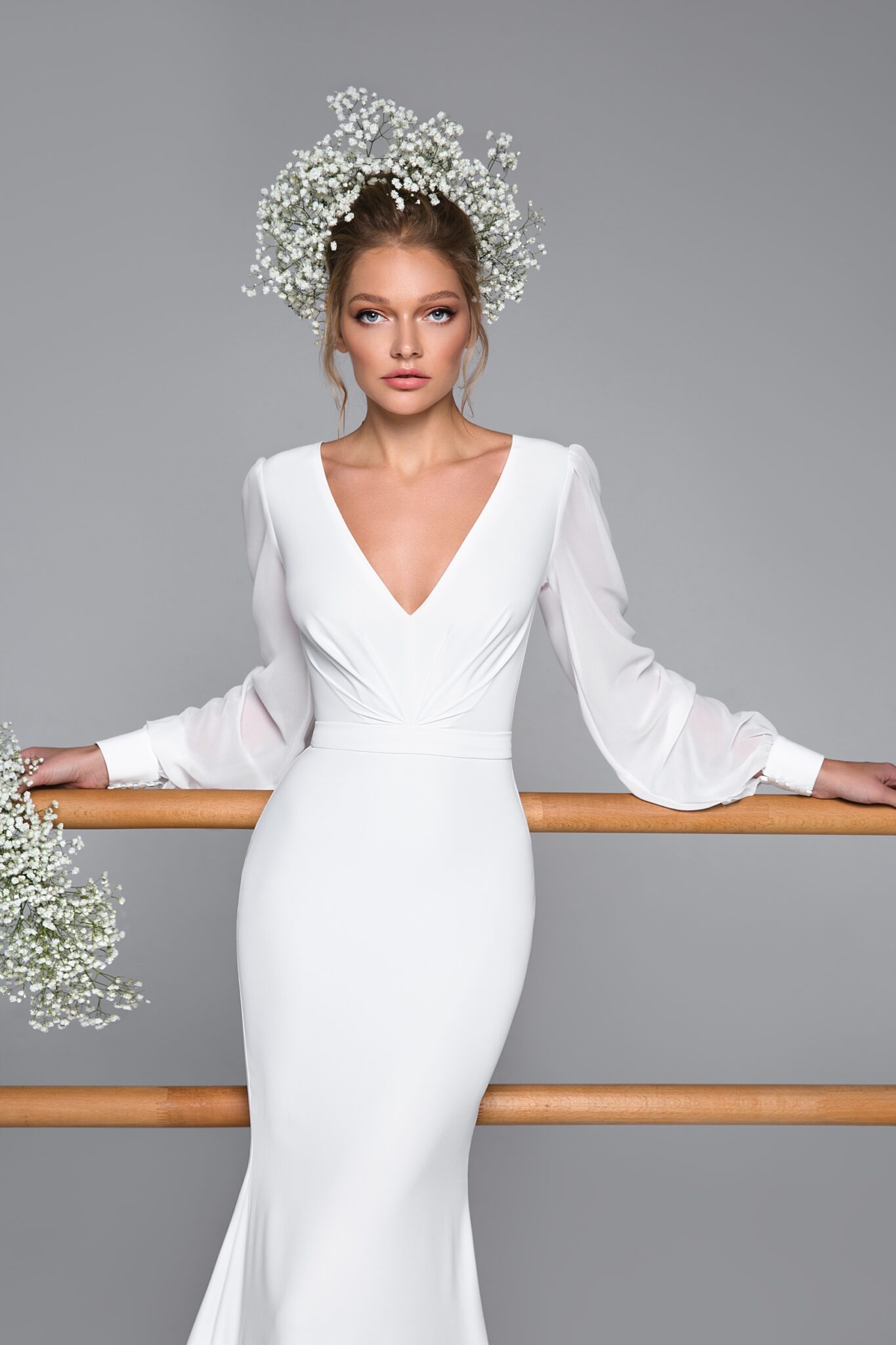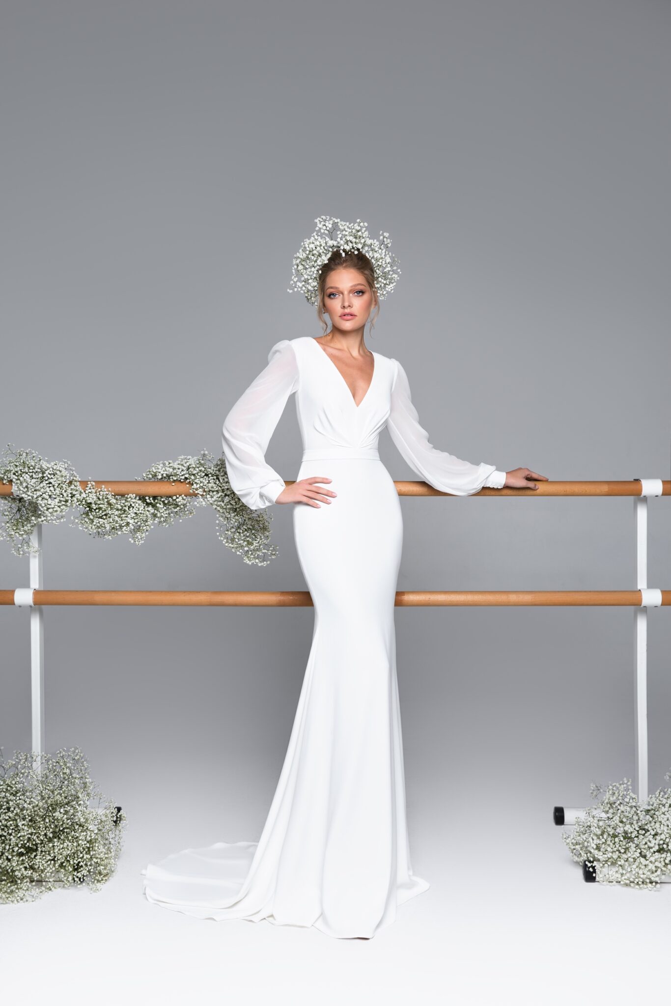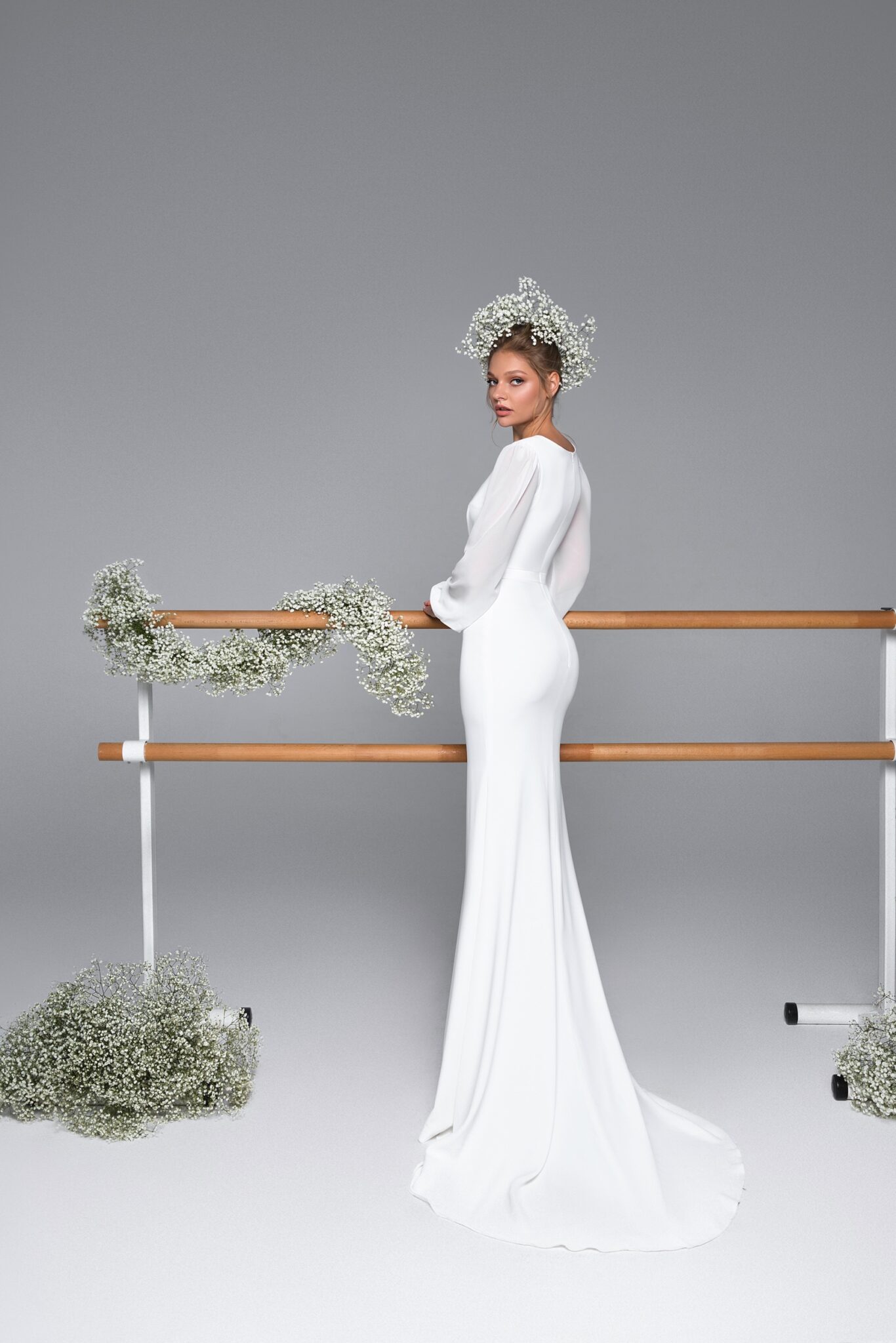 Less is more 2019Discover the magic of bridal couture with Nino. Its enchanting sheath silhouette, paired with the softness of crepe, tulle, ensures a look of regal sophistication. Every bride deserves to look and feel her best, and this gown promises just that.