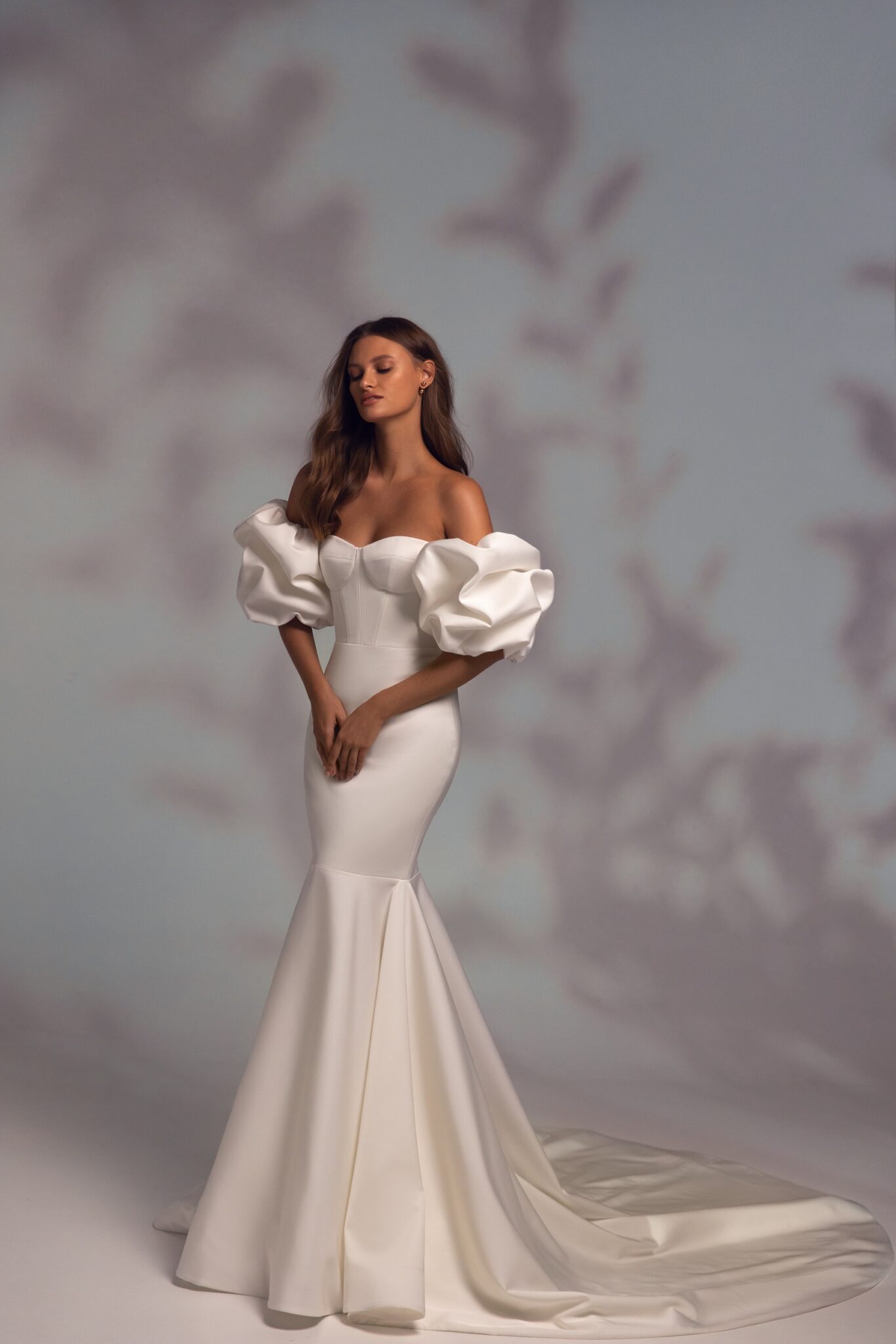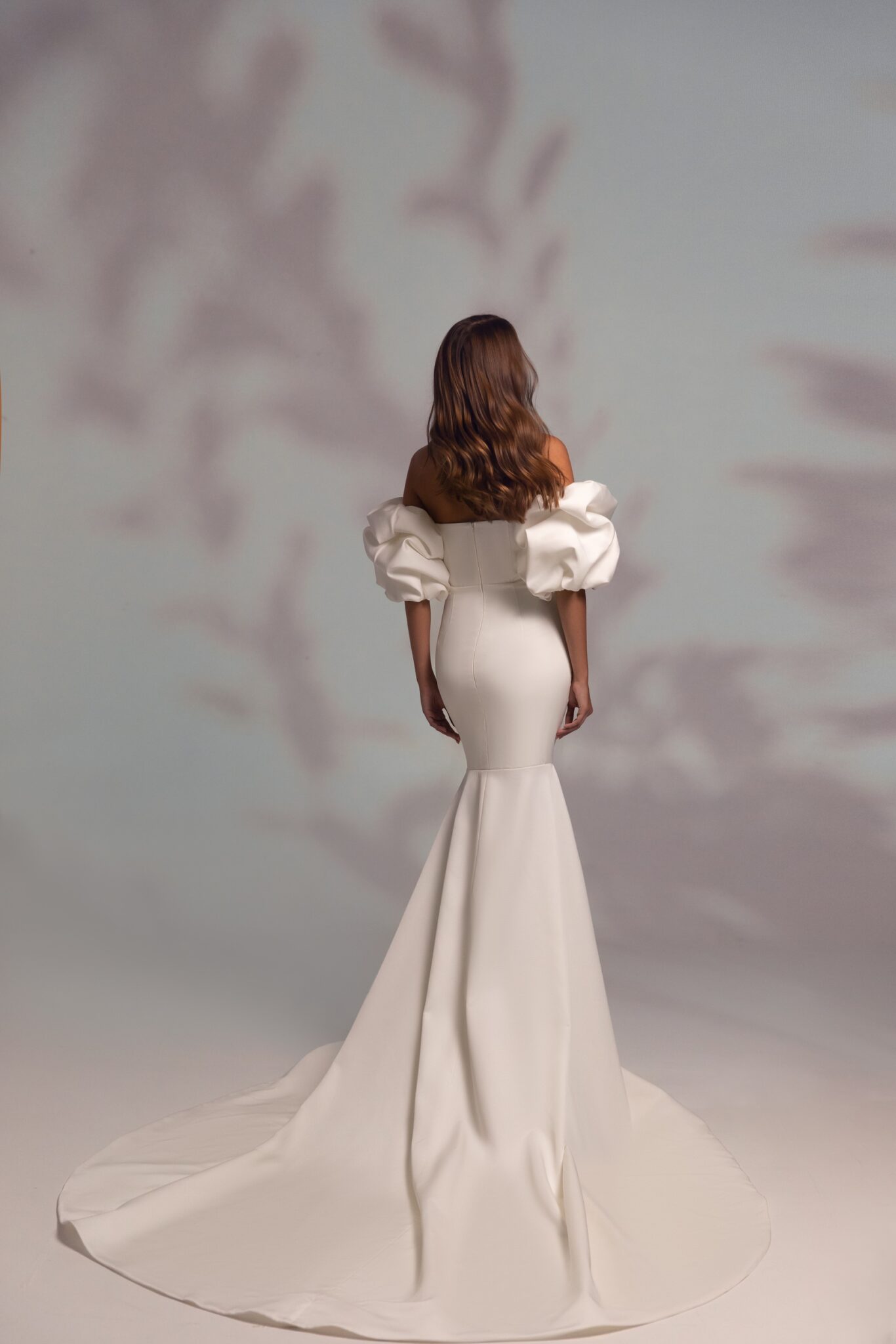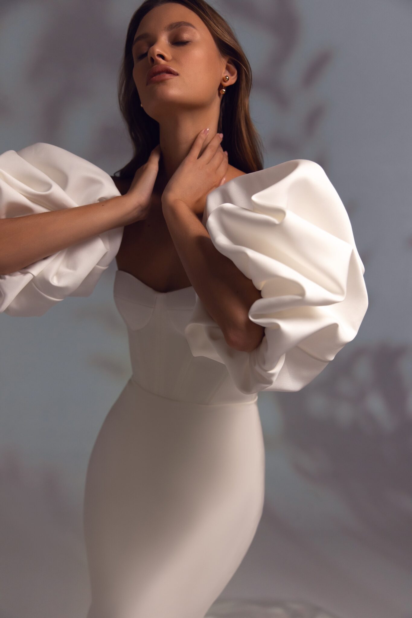 RebelAn extraordinary wedding gown made of soft mikado silk with fantastic detachable sleeves. A strapless corset is decorated with cups and bones and beautiful volumetric sleeves are fixed on arms. A skirt is fitted on the hips and becomes more flare down the knees ending with a long train.