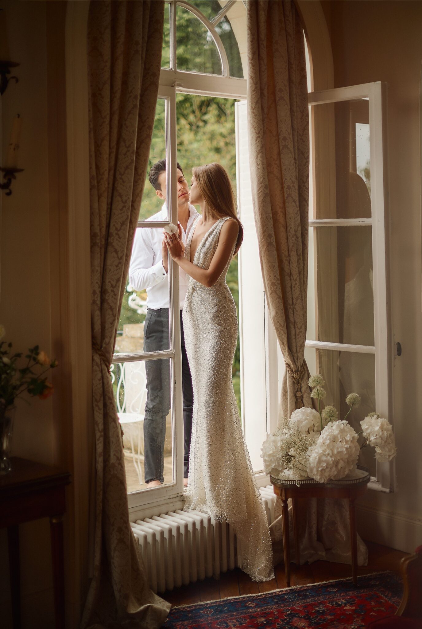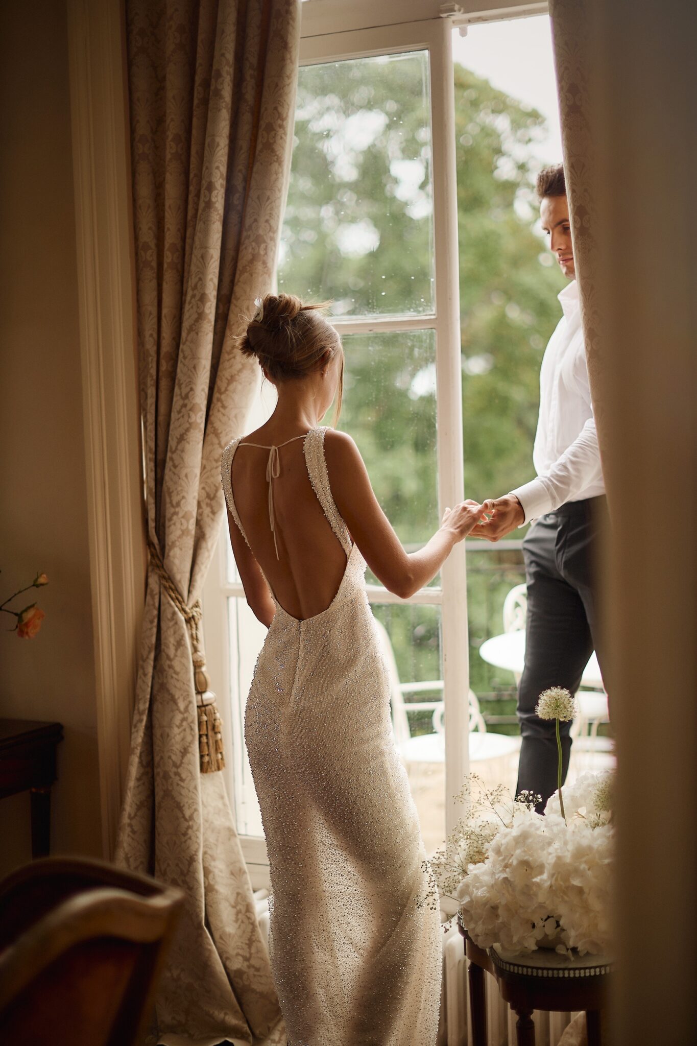 Love StorySemi-translucent V-neck dress with an open back.