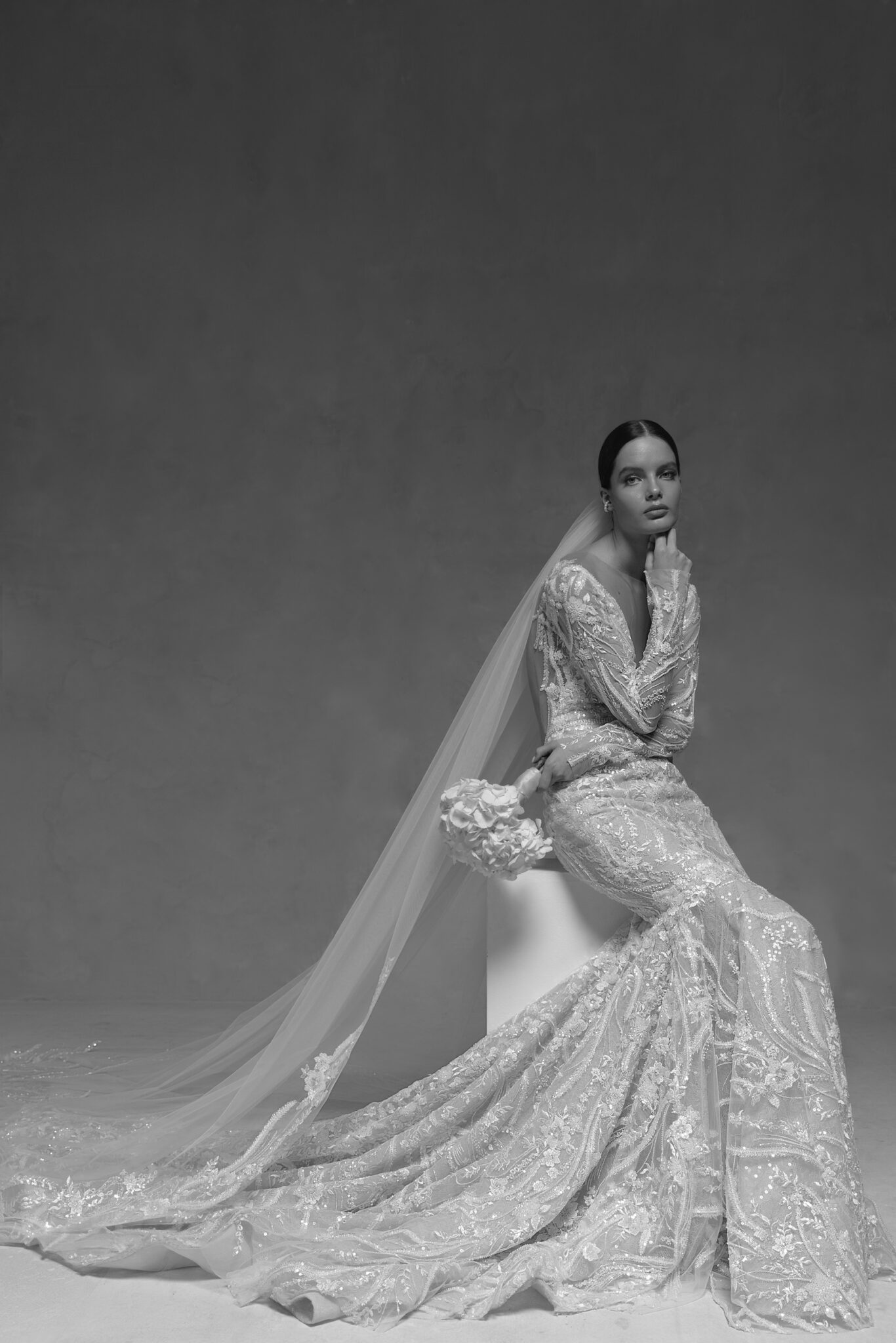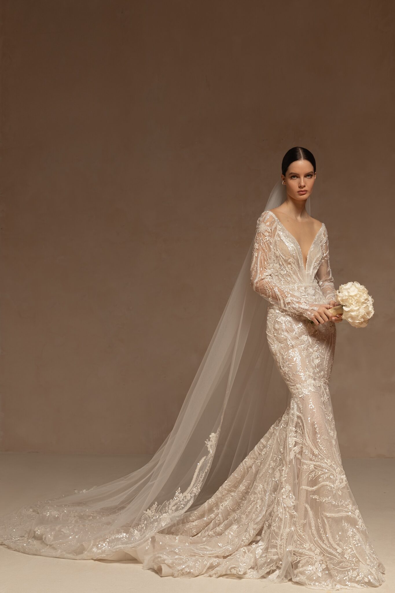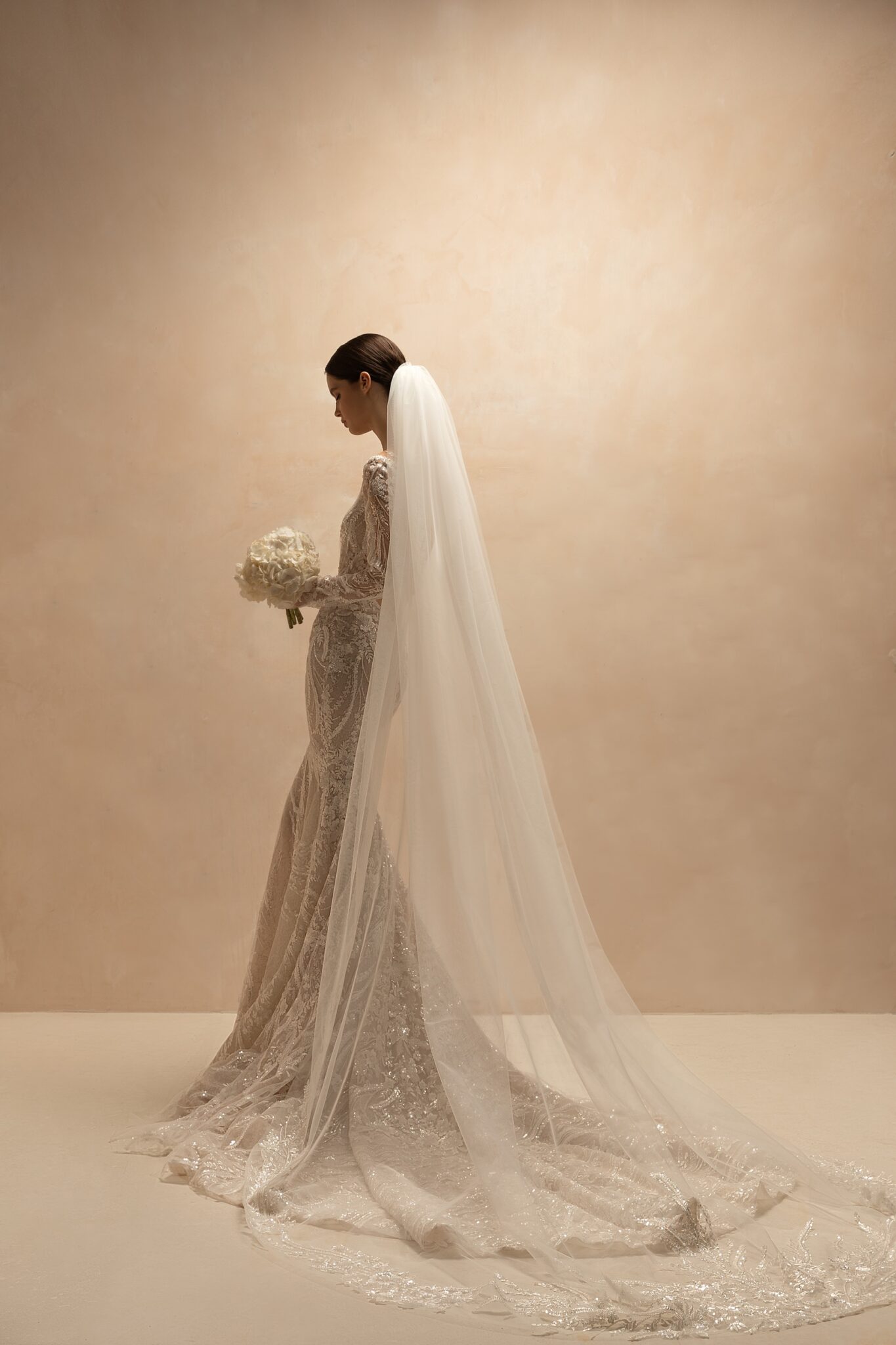VeilsLuxurious single-tier bridal veil made of translucent tulle and decorated with fabulous embroidered sequined lace. Suits perfectly with WONÁ Concept Goddess bridal gown. Available in catherdal length of 3m.