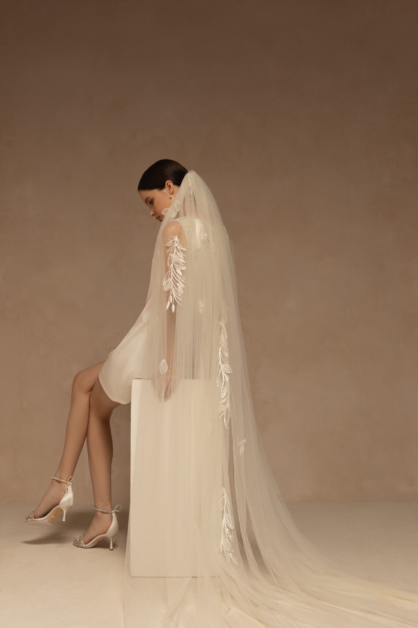 VeilsRomantic single-tier veil made of tulle and decorated with oversized floral lace appliques. Available in cathedral length.