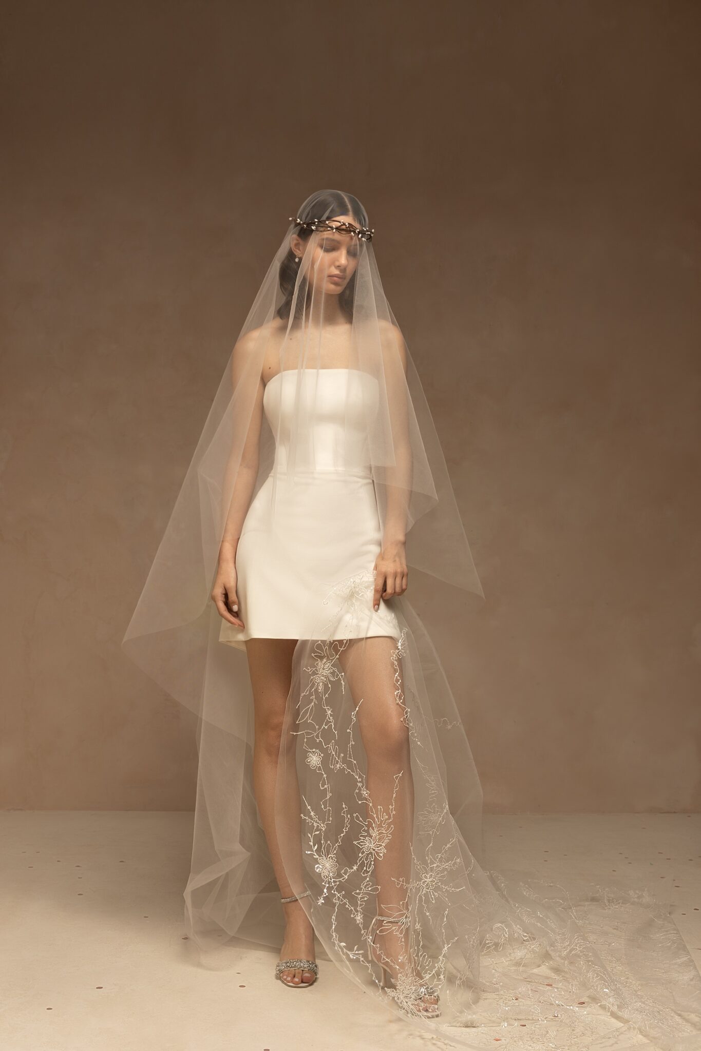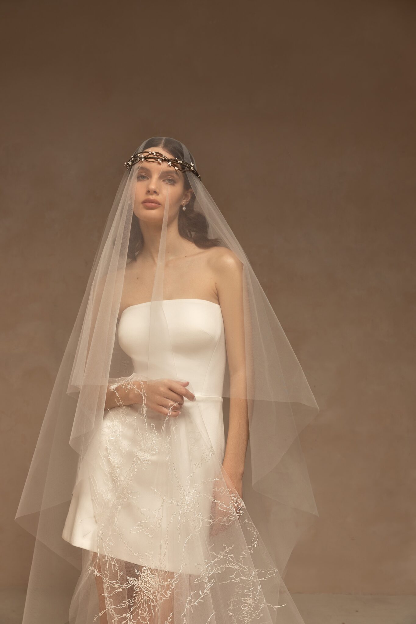 VeilsTender single-tier drop veil made of tulle and decorated with sparkling lace appliques located on the veil’s train. Available in cathedral length. Folded back, the veil will create two layers.