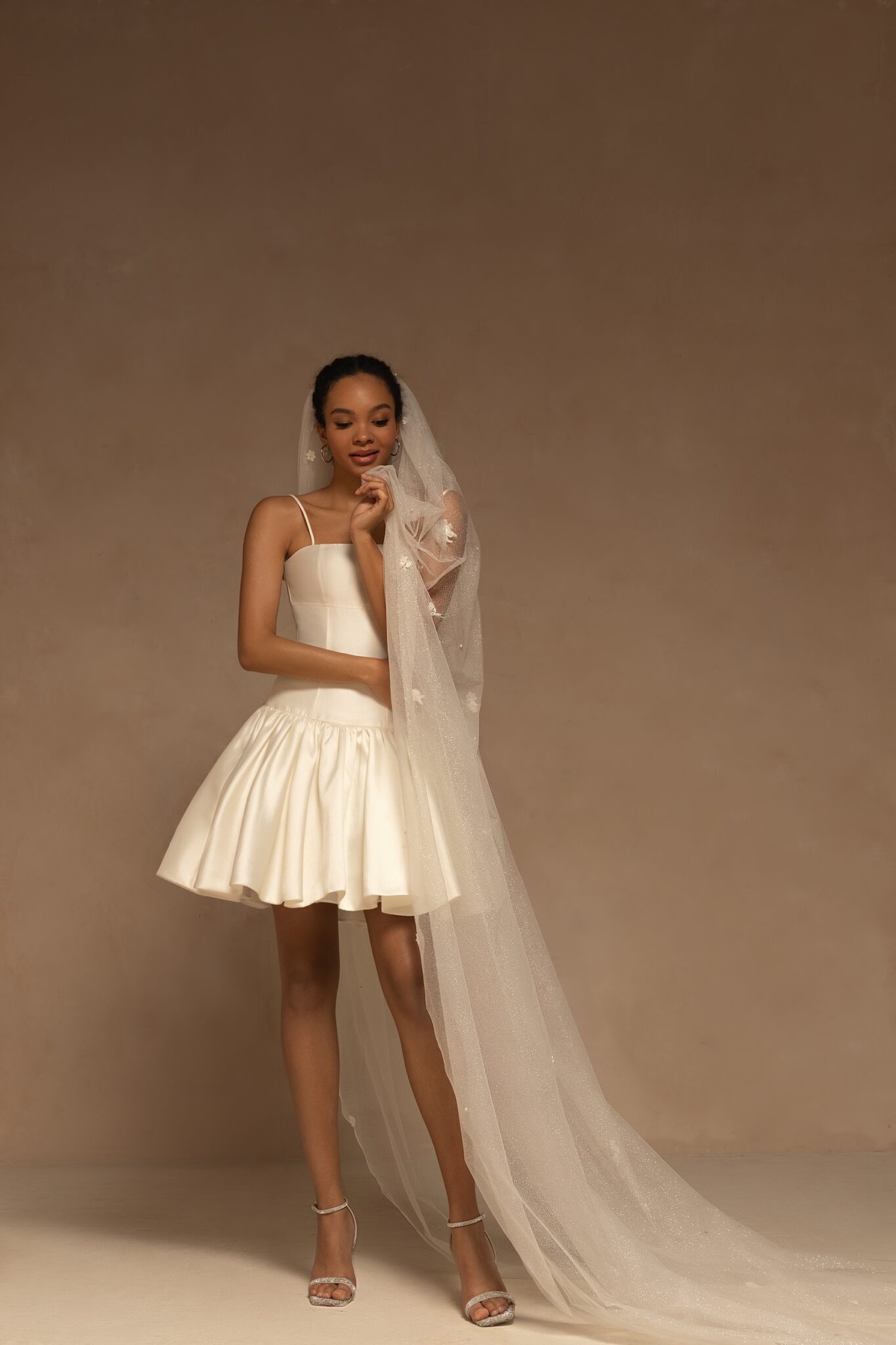 VeilsBeautiful sparkling single-tier veil made of glitter tulle and decorated with small 3D floral appliques and artificial pearls. Available in cathedral length.