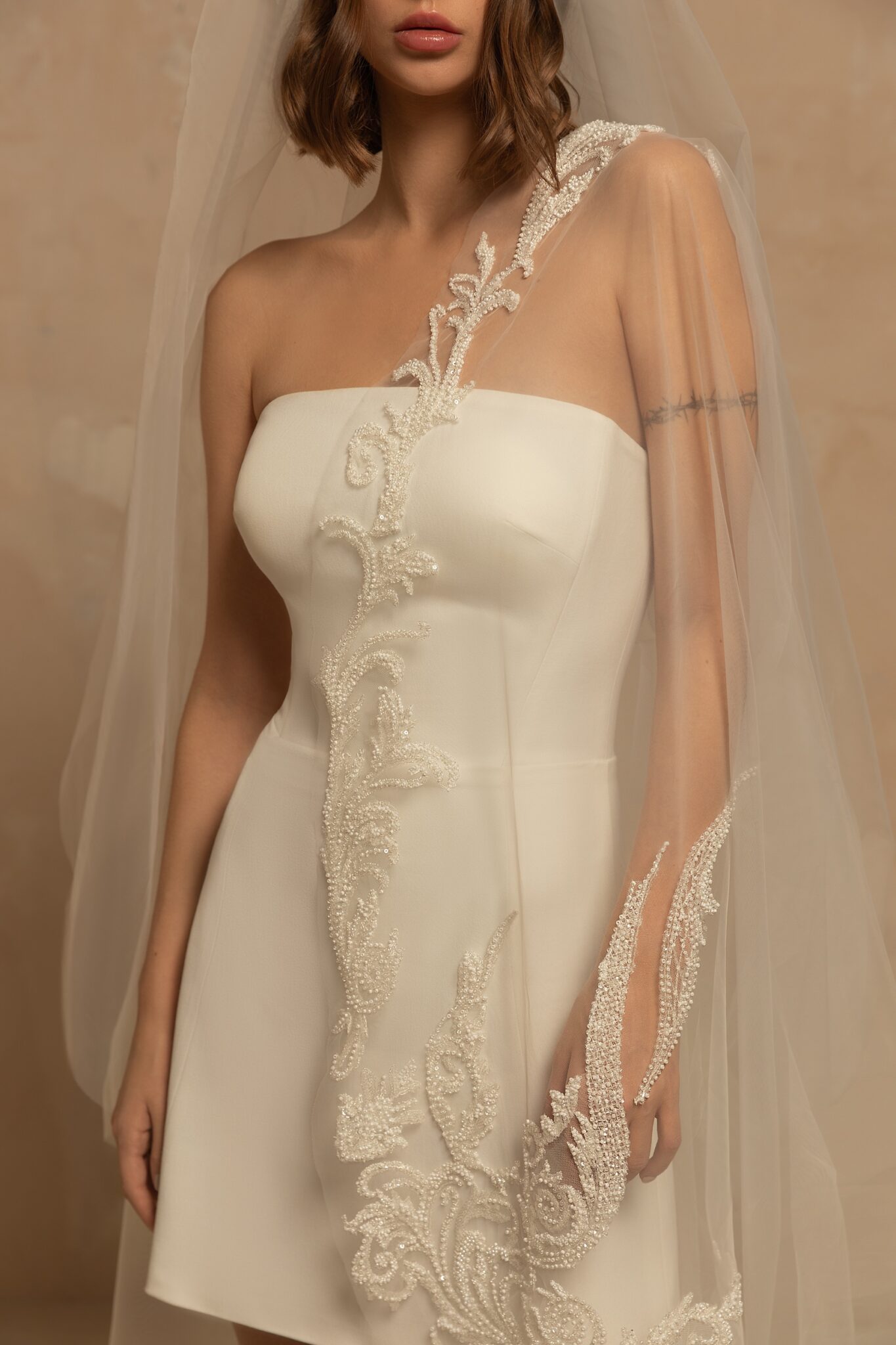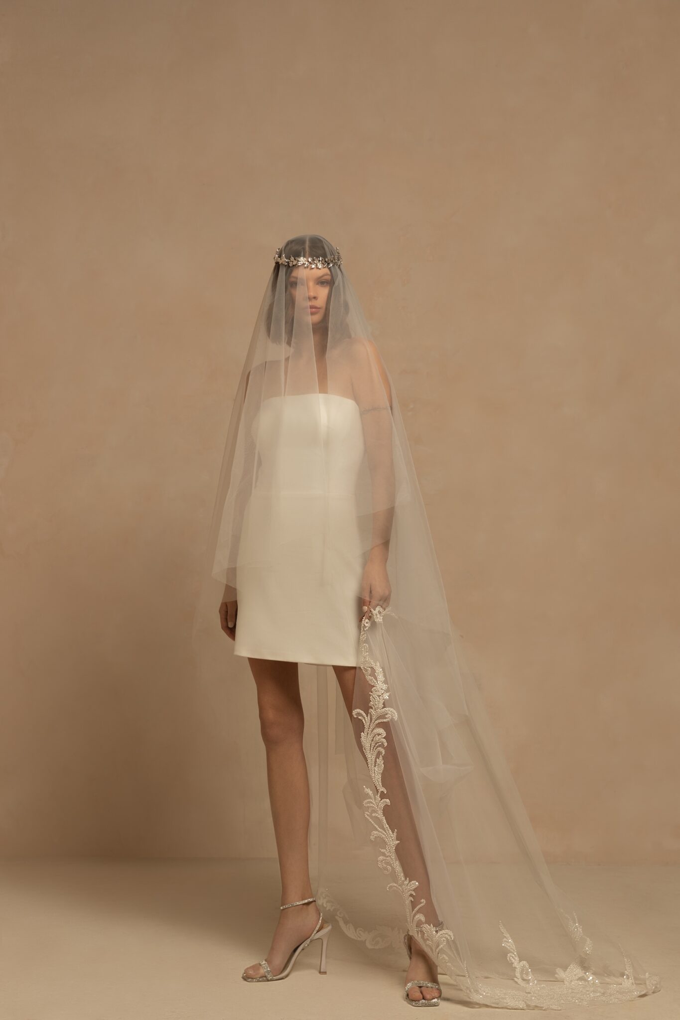 VeilsTruly luxurious single-tier drop veil made of tulle and decorated with exquisite beaded lace on the edges. Can be worn as a mantilla veil. Available in cathedral length of 3m. Folded back, the veil will create two layers.
