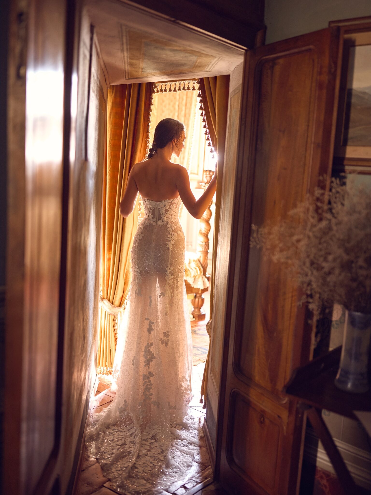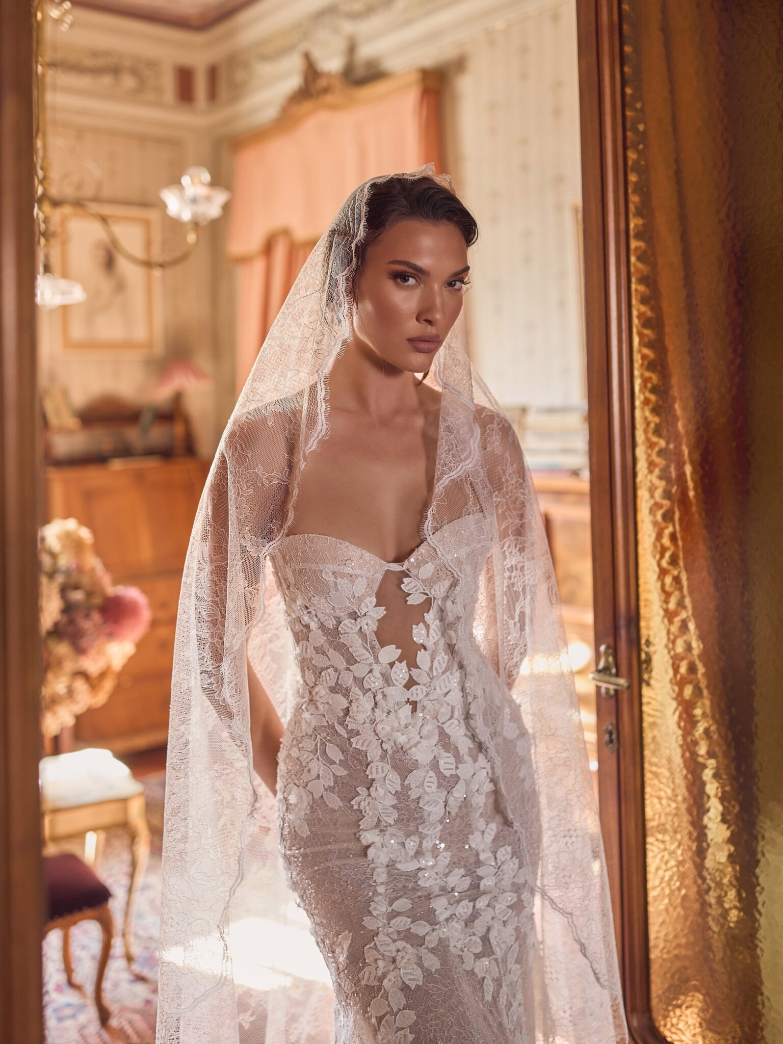 Amore in FioreNyx gown is a refined mermaid silhouette that captivates with its shimmer and floral elegance. Made from sparkling lace, the dress is adorned with delicately scattered floral appliqués that cascade gracefully across the bodice and skirt, creating a romantic, textured effect.