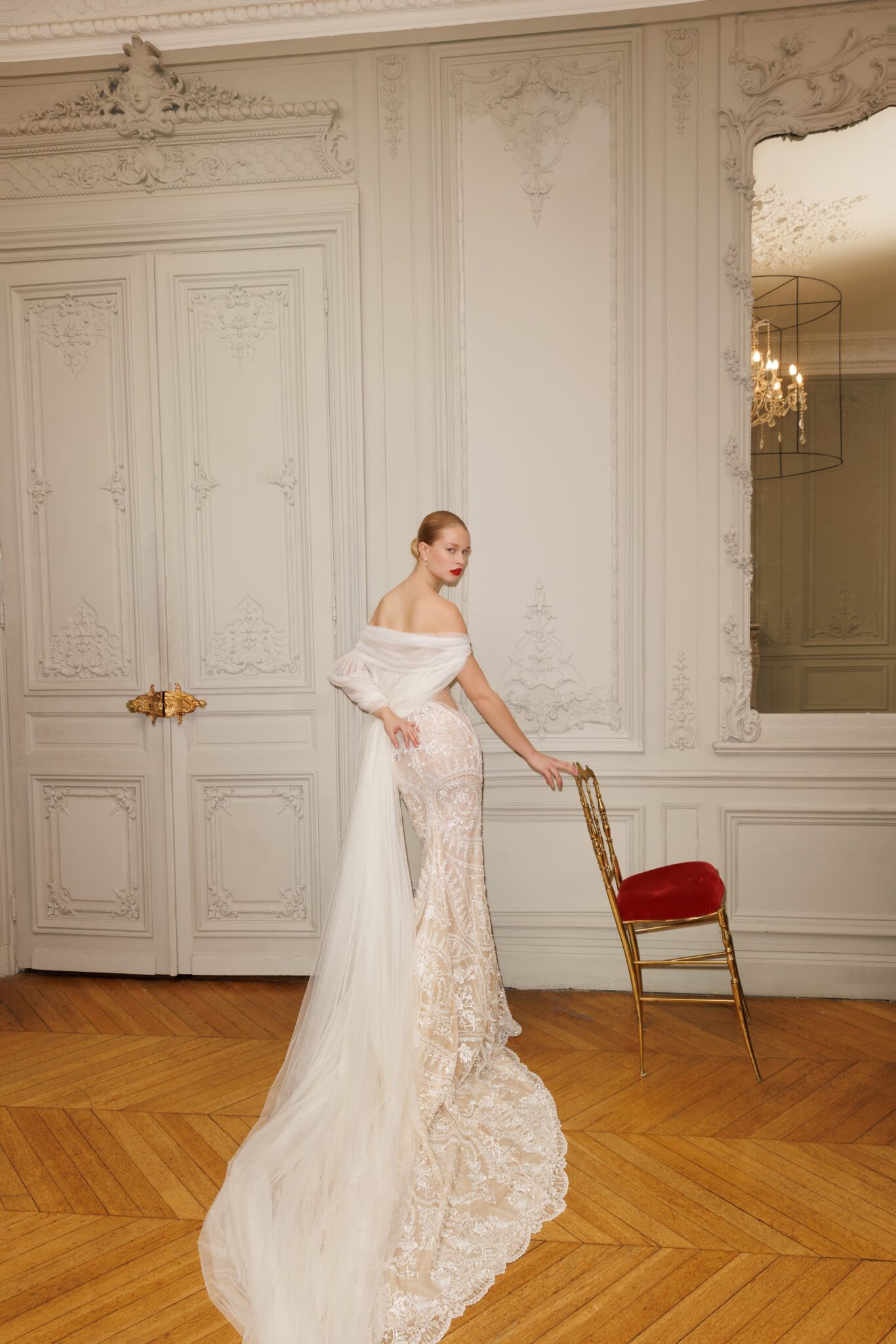 Atelier Lumiére, Plus SizeA whisper of tenderness and sophistication, this chantilly lace creation is a true masterpiece with its lace-up semi-open back. Cold-shoulder long-sleeve top, structured corset decorated with lace appliquès and pearls. Graceful adherent skirt features a simple lace train while the organza cape adds a touch of strict firmness to the style.