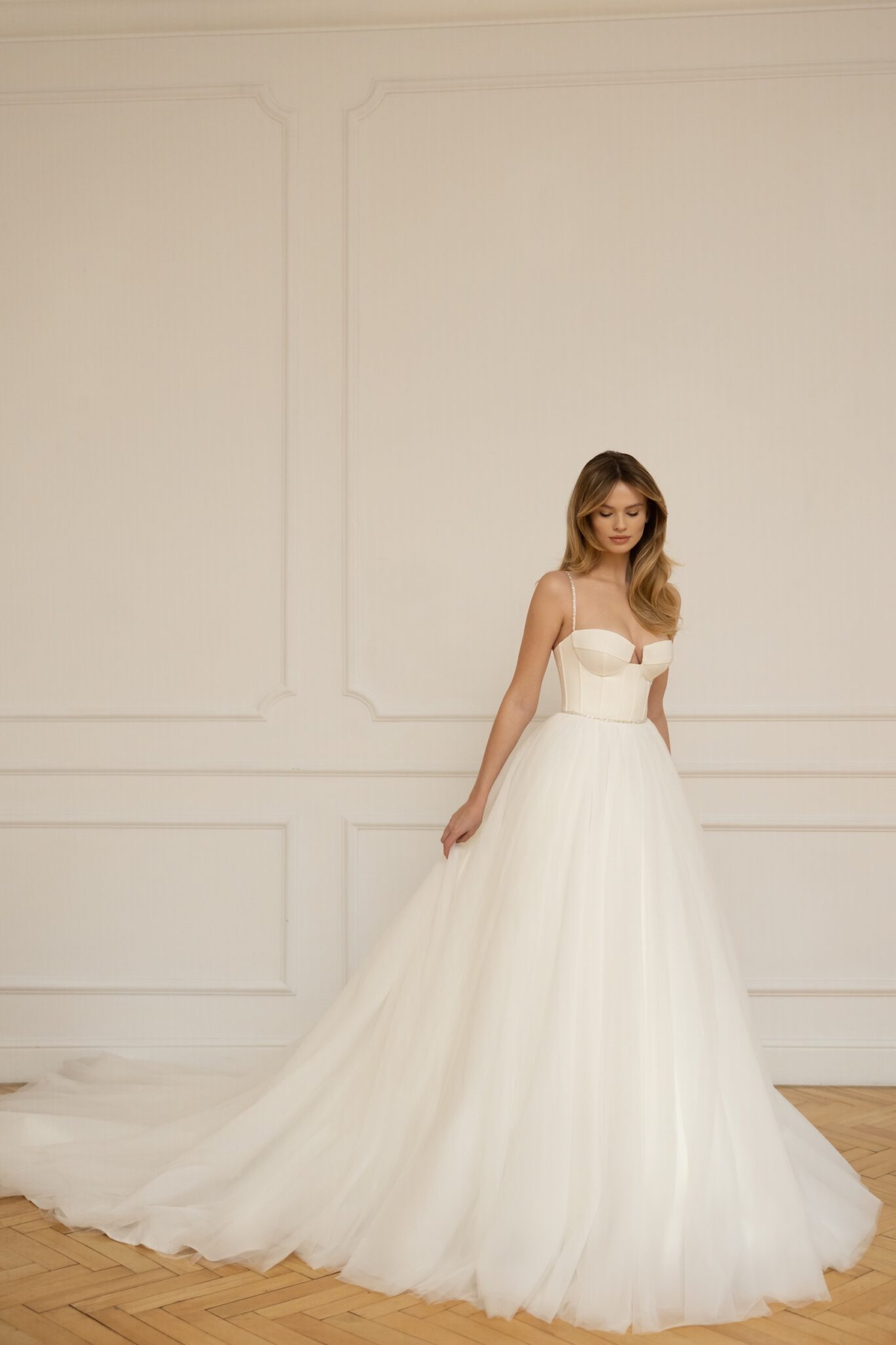 Less is more 2023Orli shows that simplicity is powerful in bridal fashion. This dress has been expertly crafted with soft crepe and weightless Tulle which add to the drama of her flawless A-line skirt featuring a gorgeous cathedral train in butter soft Tulle. The statement neckline with deep plunge and thin spaghetti straps covered with sparkling elements brings balance to the dramatic structured bodice