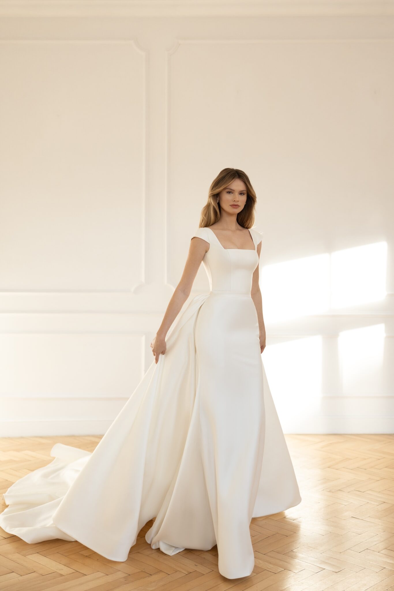 Less is more 2023, Plus Size, Sample SaleOrtis is an embodiment of refined minimalism. This gown has a modern square bustier-style neckline with elegant cap sleeves paired with a sleek trumpet sheath skirt. Beautifully crafted in luxurious Mikado silk, this is the perfect gown for the sophisticated modern bride. Embellished with a detachable butter soft Mikado overskirt , it takes on extra volume for a grand down-the-aisle entrance