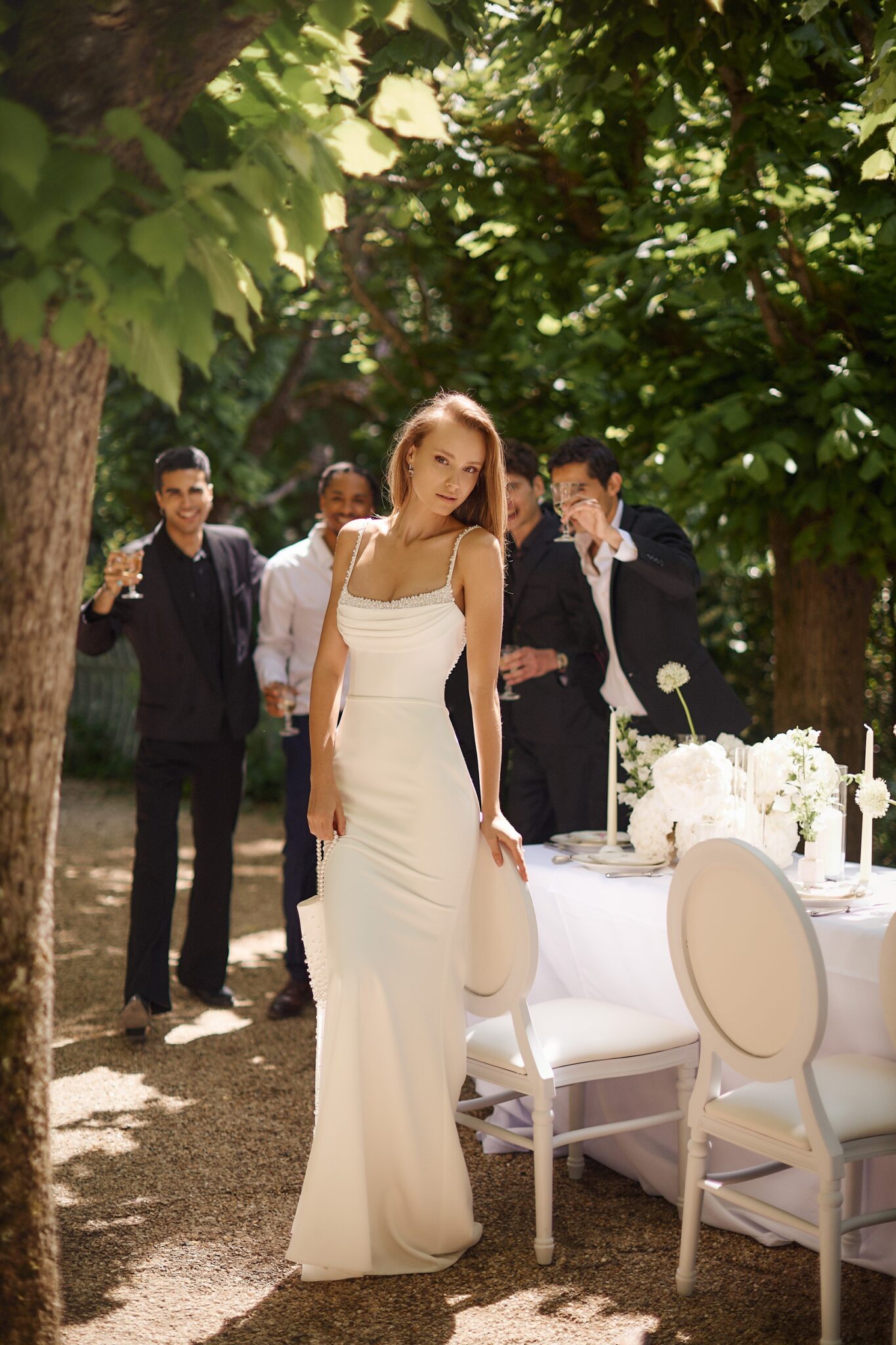 Love StoryStrapped dress decorated with a soft shirring in the front and pearled embroidery on the straps and neckline. The waist is highlighted by a tiny belt while the final touch is added by a sophisticated small handbag decorated with pearls and pearled fringe descending from the bottom.