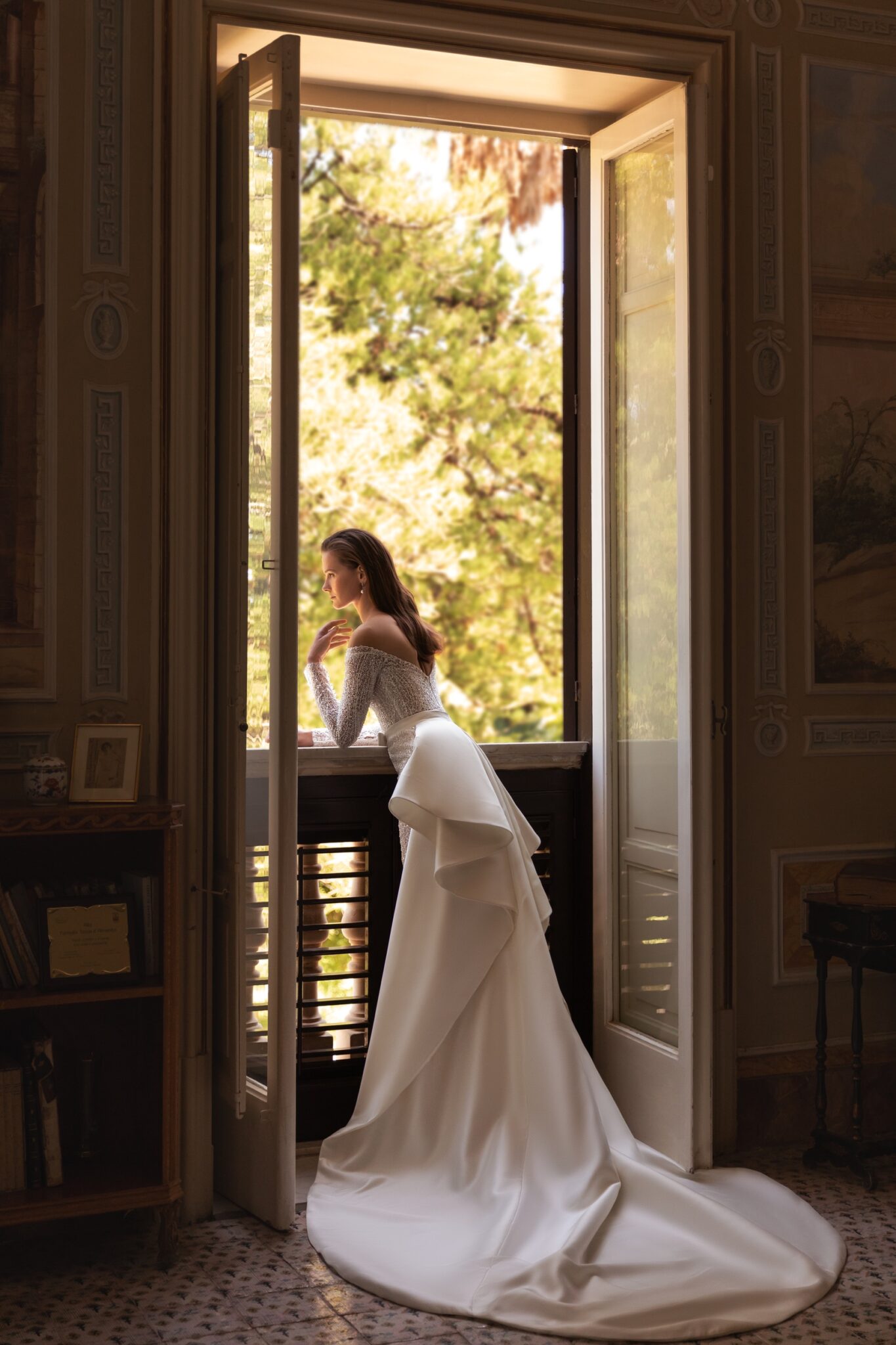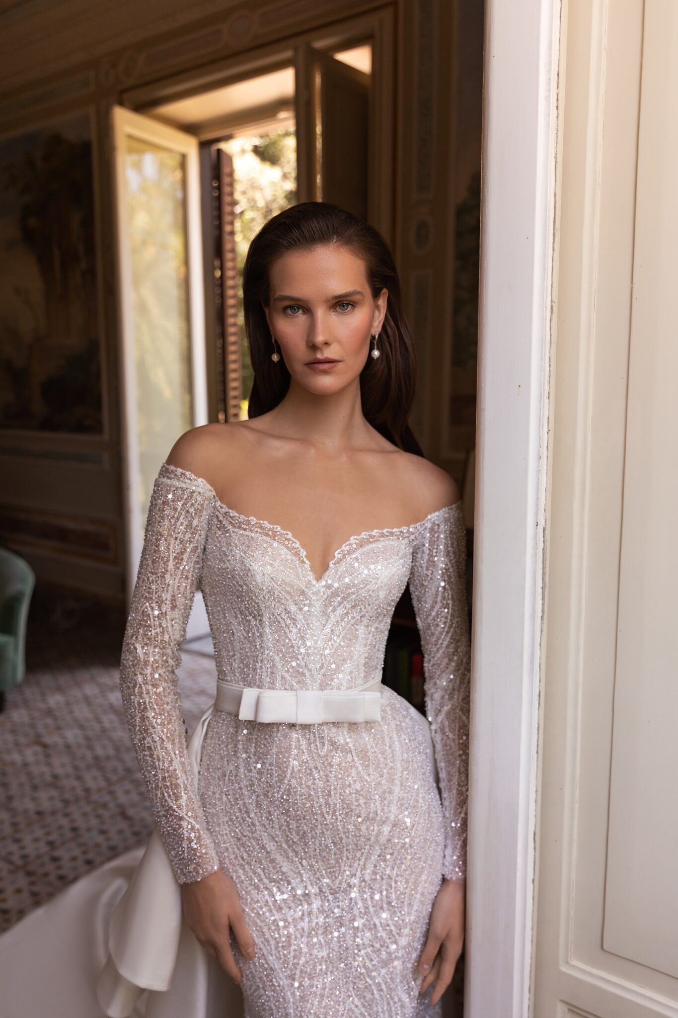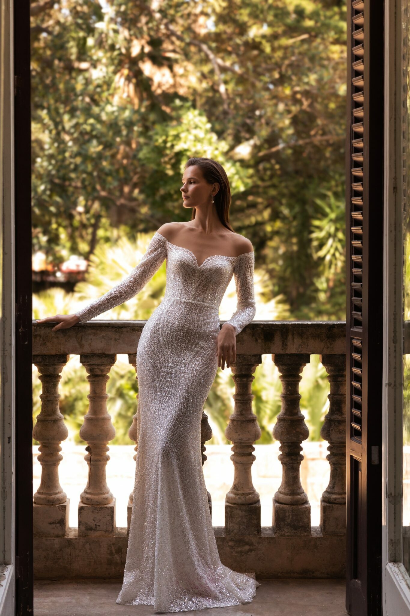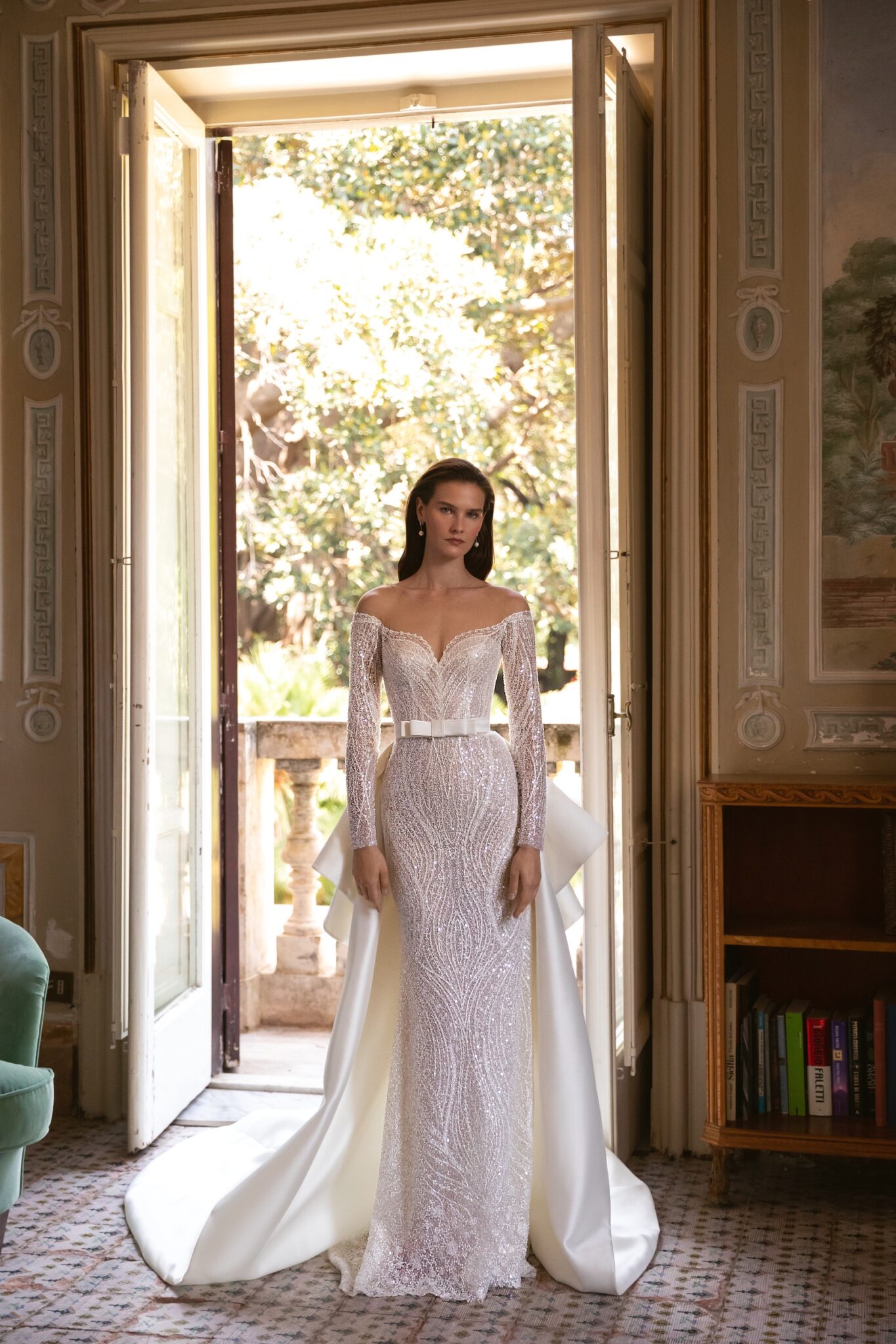 PalermoA skin-tight gown with sweeping train, sweetheart neckline and off-the-shoulder long fitted regal sleeves. All covered in sequins and crystal pendants Parvin features spectacular embroidered patterned lace. Accessorized with a fantistic satin overskirt, it takes on extra volume for a grand down-the-aisle entrance.