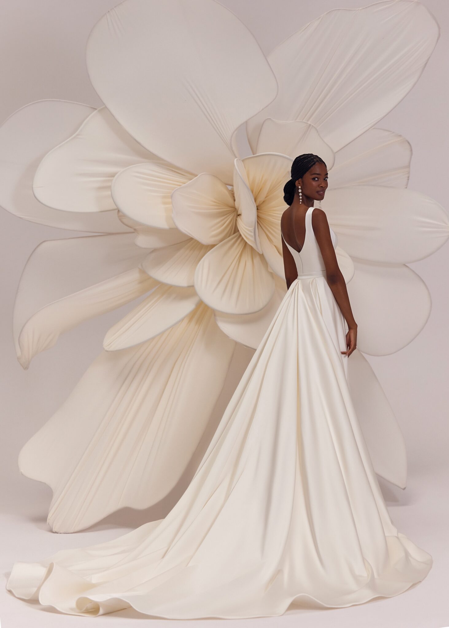 Less is More IVPercy – ballerina neckline dress with asymmetric wrap over the waistline and complemented with a smooth voluminous overskirt.