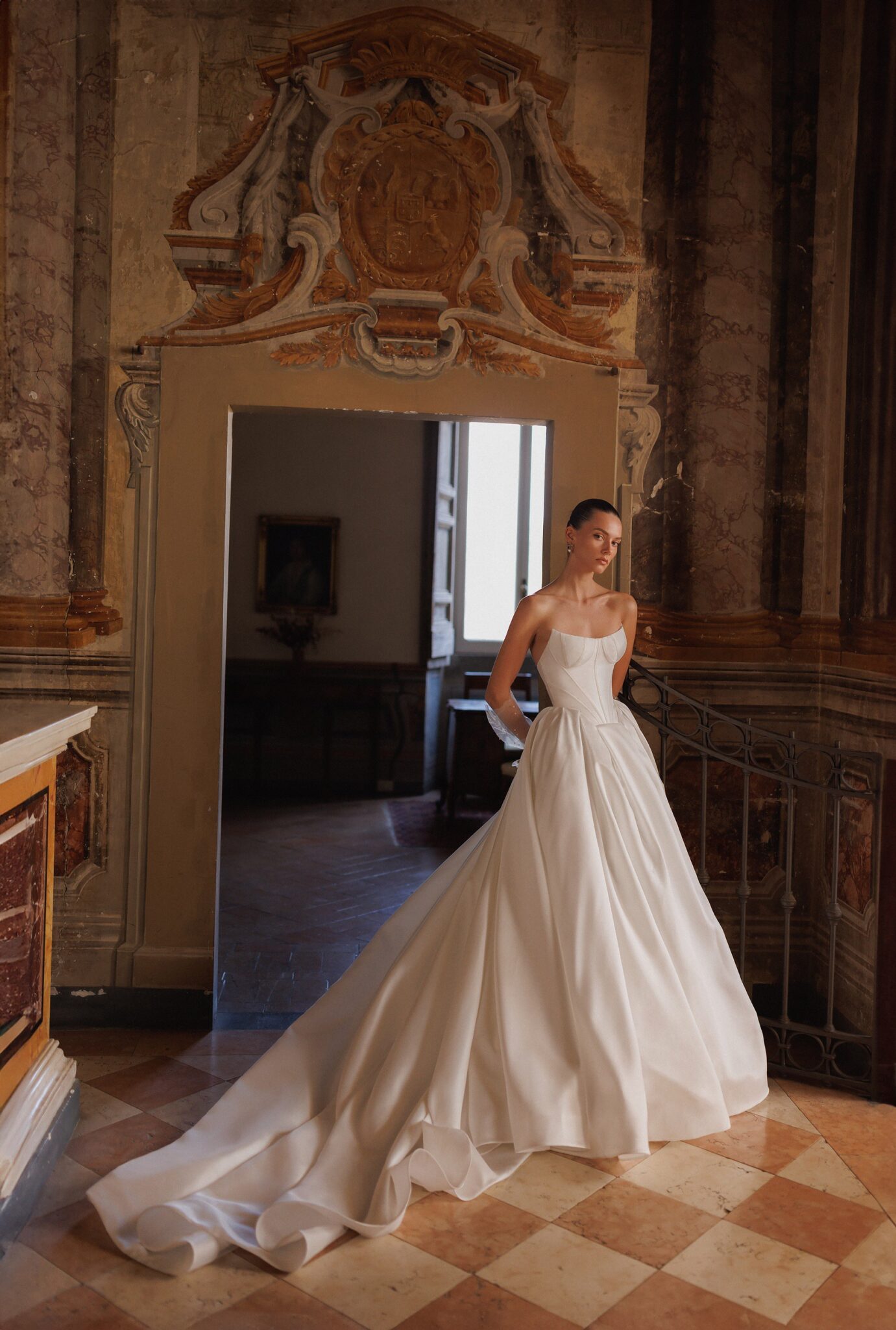 L'Unico, Plus SizeDeep round neck corset with pointed bottom and voluminous smooth fabric skirt.