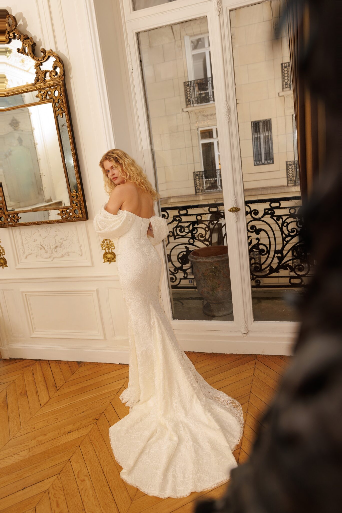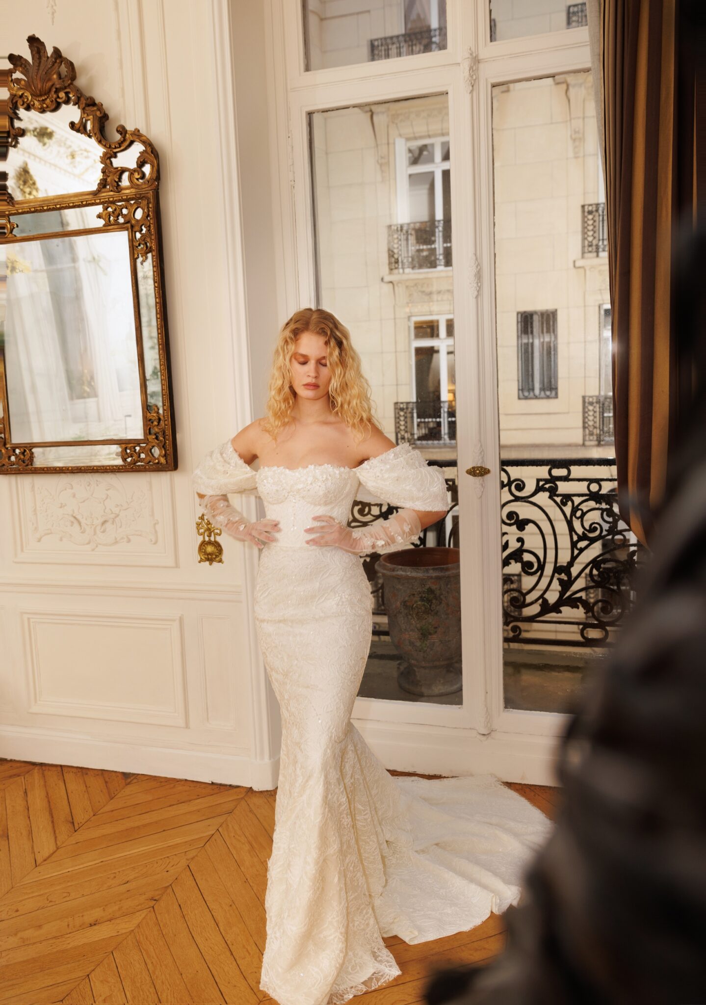 Atelier Lumiére, Plus SizeThe dress to fall in love with: structured semi-sheer lace-up at the back corset decorated by hand with sophisticated floral lace and pearled strings creating cold-shoulder straps. Voluminous yet lightweight gown of the same layered semi-sheer fabric meticulously adroned by lace. The detachable mikado silk overskirt makes the style more elegant and strict while keeping the sophistication of the top and corset visible and outlined.