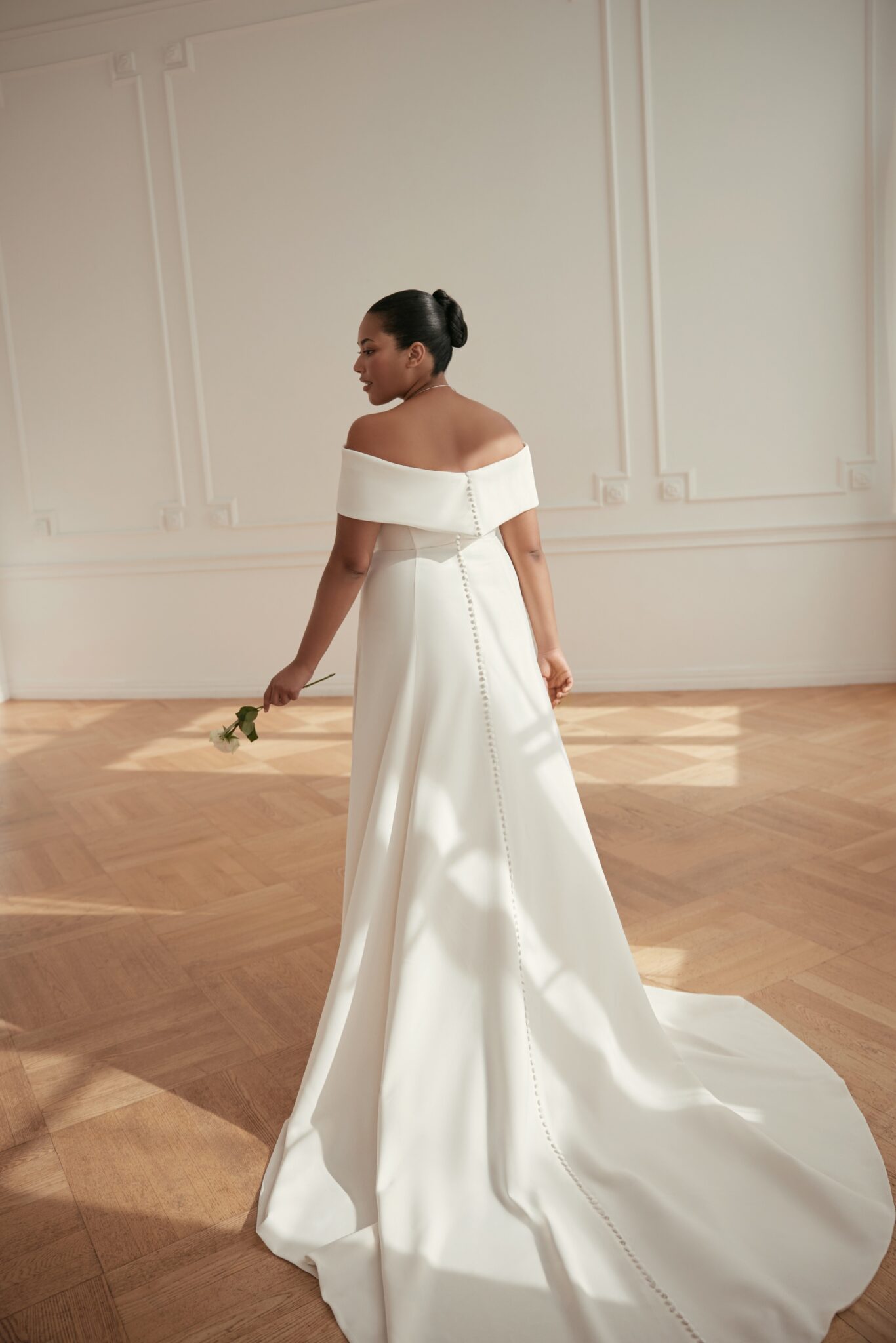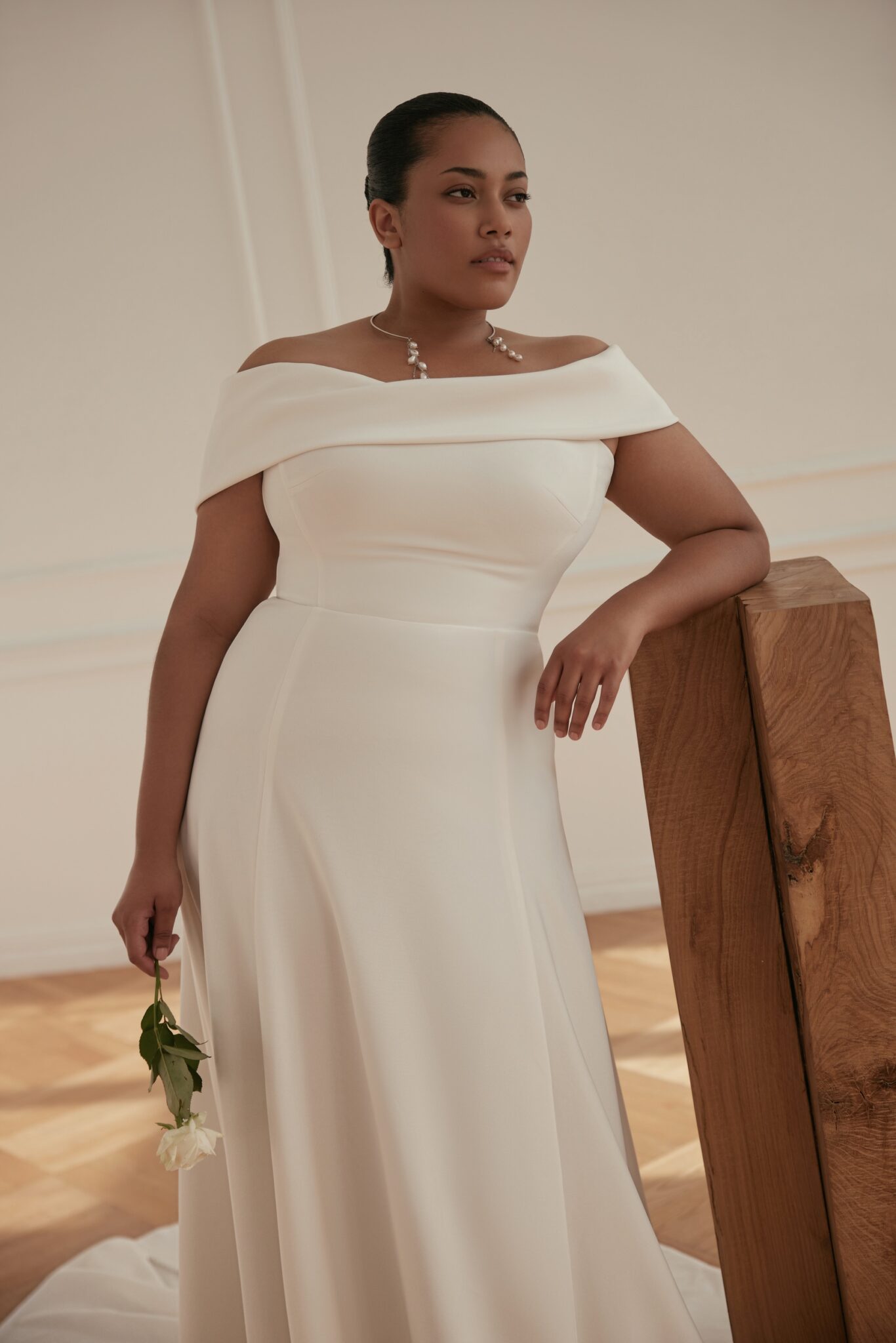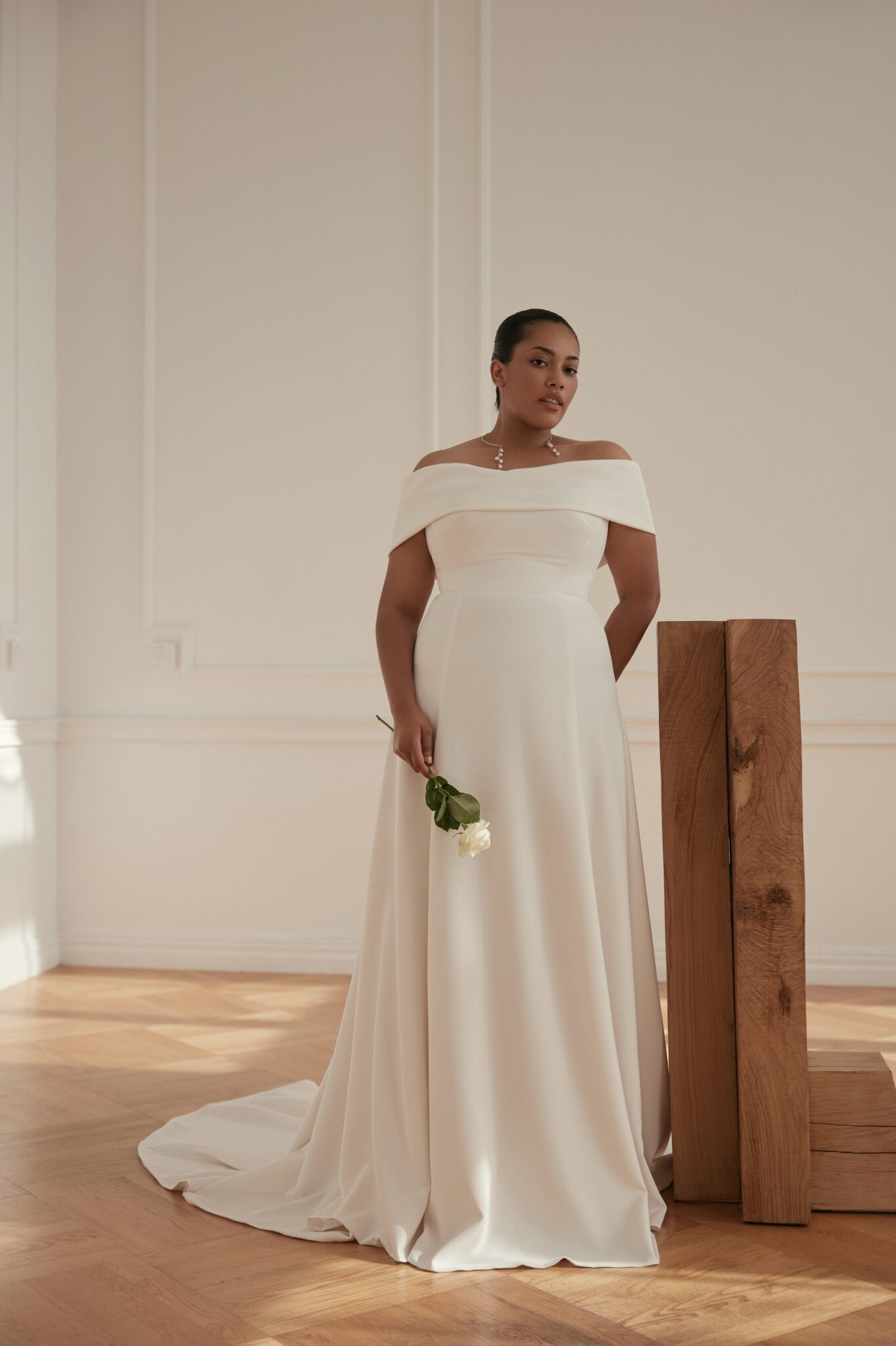 Less is More IV, Plus SizePoema – cold-shoulder natural waistline A-line dress with a modest decorative crystal line all over the length of the dress on the back.