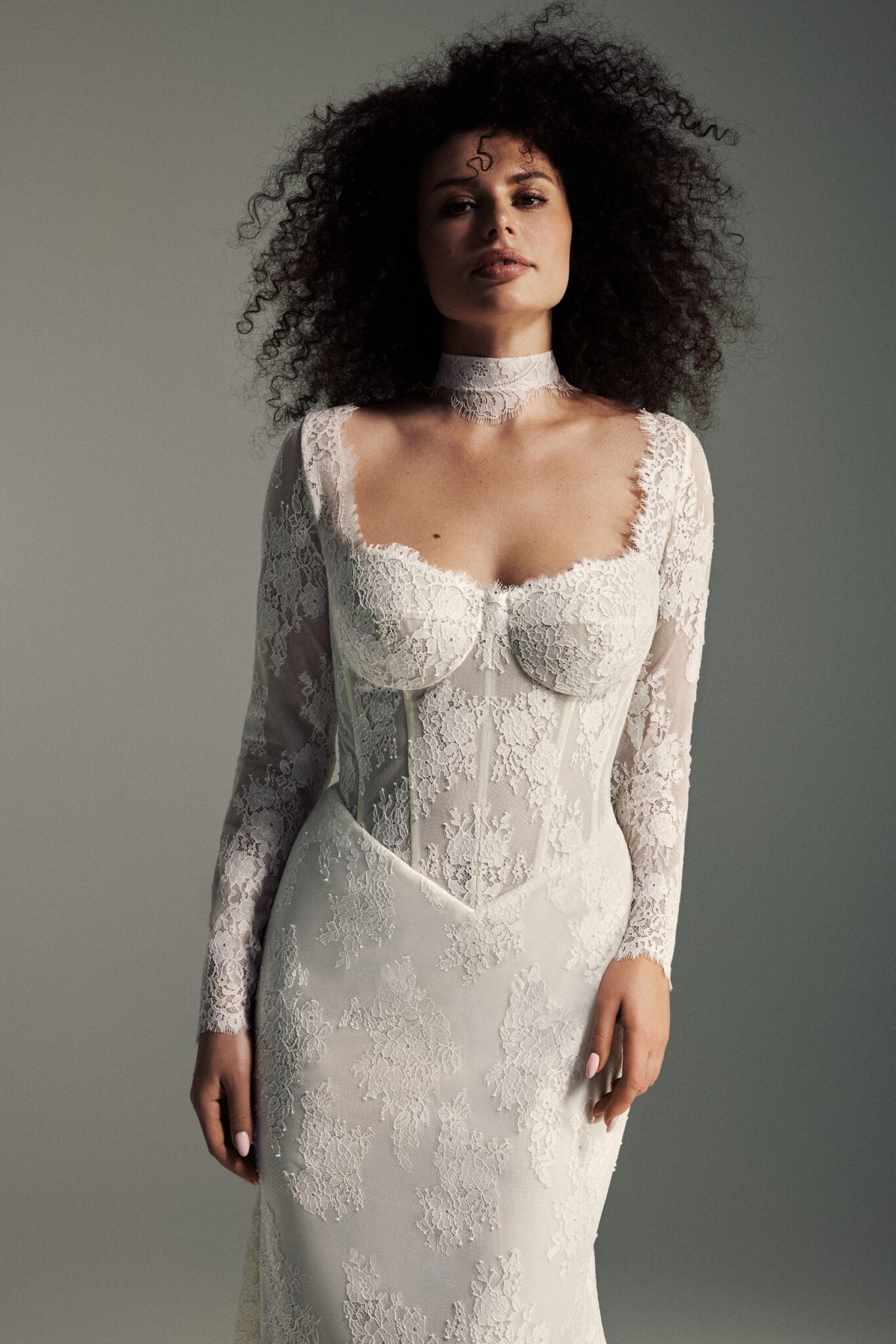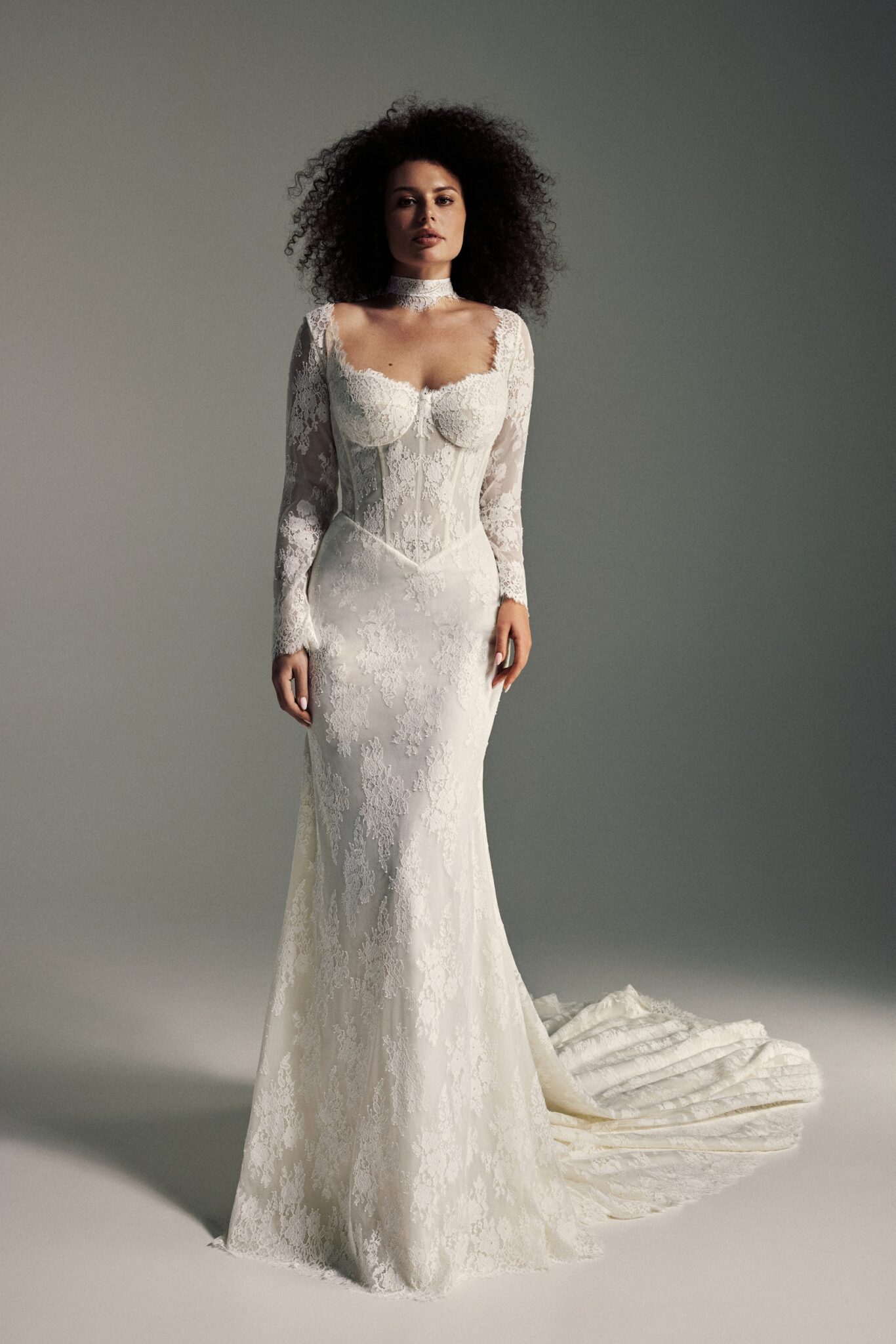 Blooming LovePoppy is a timeless and elegant gown crafted in a lace sheath silhouette that combines structure with romance. A structured corset with boning and a defined Basque waist shapes the bodice, complemented by a square neckline and long lace sleeves, while an open square back and sweeping cathedral-length train complete the look with graceful sophistication.