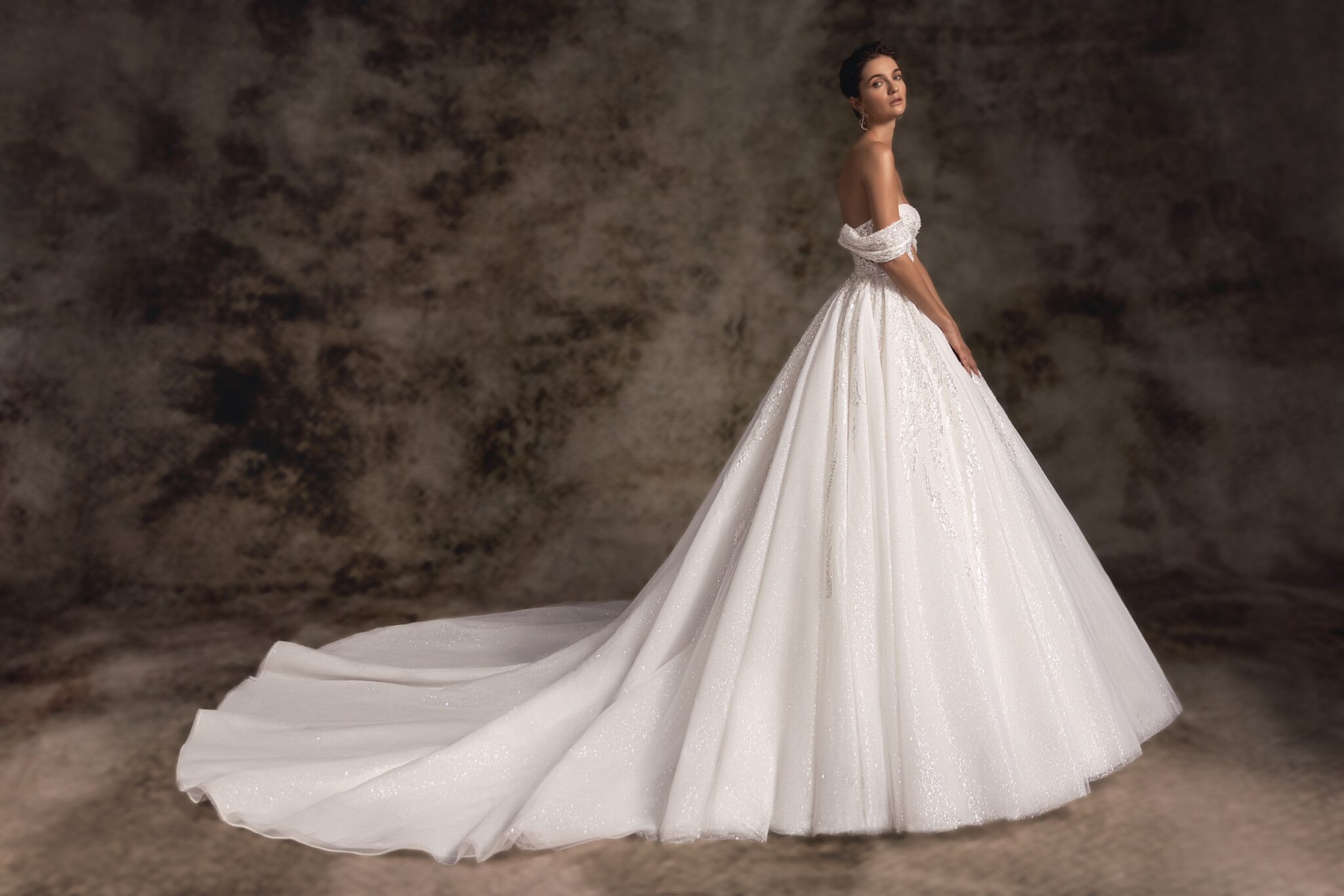Notte d'Opera, Plus Size, Sample SaleExtraordinary craft details and a classic silhouette make this majestic princess dress a thing of utter beauty. Crafted in soft glitter and lace Tulle with a richly beaded bodice and romantic dropped sleeves the dress features a beautiful corset with sweetheart neckline and lacing on the back. Decorated with ornate lacework on the bodice, and Chantilly lace skirt with fluted edging and a commanding train.