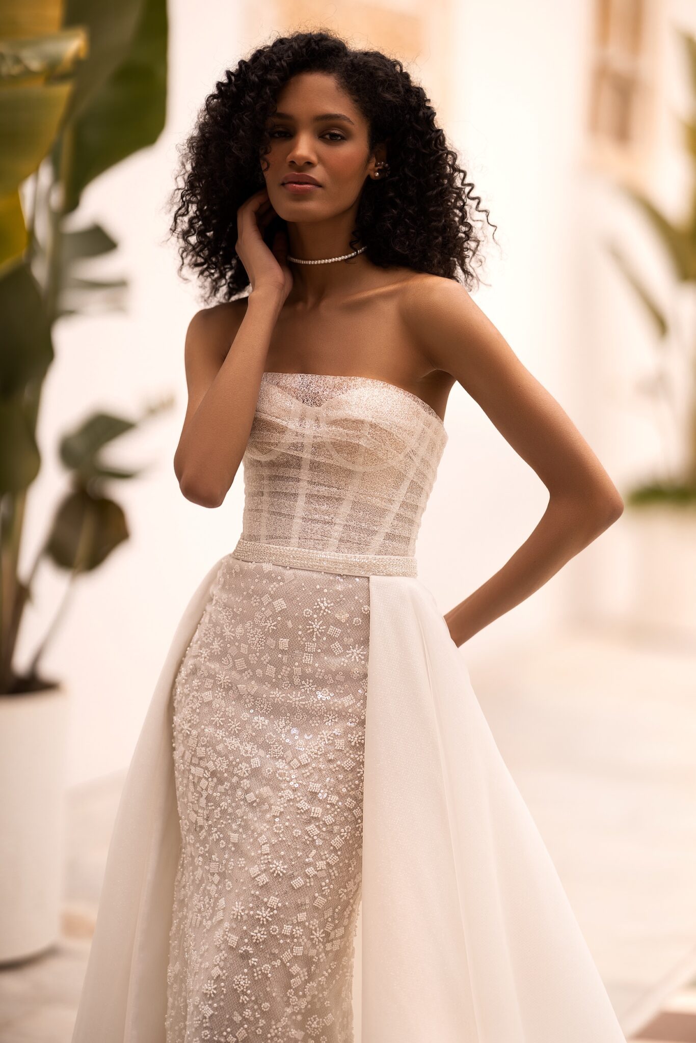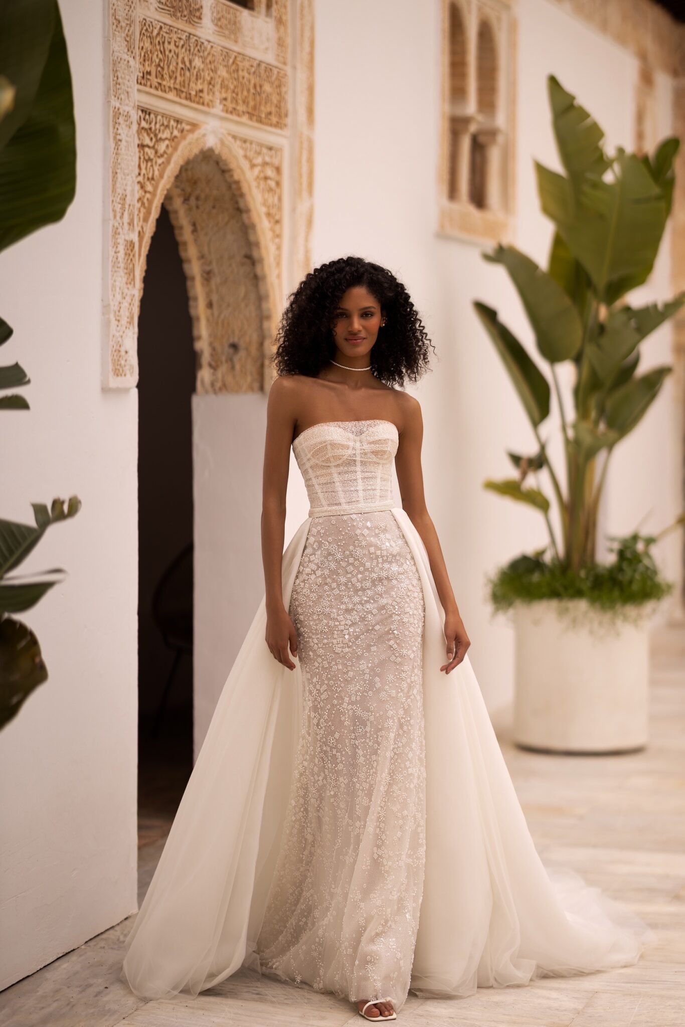 Alma de OroIntroducing our mesmerizing sheath wedding dress, a vision of elegance and allure. Crafted from shimmer fabric, it gleams with every movement, exuding an ethereal radiance. The strapless corset, adorned with delicate draping, creates a captivating play of light and shadow, enhancing your feminine curves. The straight across neckline adds a touch of timeless sophistication, framing your décolletage with grace. The skirt is a work of art, embellished with exquisite sequins and beads, sparkling like stars in the night sky. For an added touch of drama, a long detachable tulle overskirt cascades from the waist, creating a stunning ethereal train that floats behind you with grace and beauty.