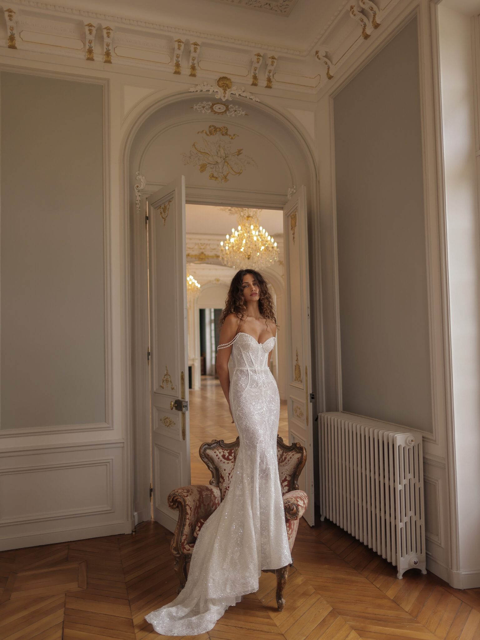 White SwanStrapless mermaid gown highlights the figure with intricate lace from the bust to the hips. The structured bodice features a sweetheart neckline and detailed corset, enhancing the waist. A trail of shimmering sequins runs throughout the dress, while it’s fitted silhouette flares out into a graceful train.