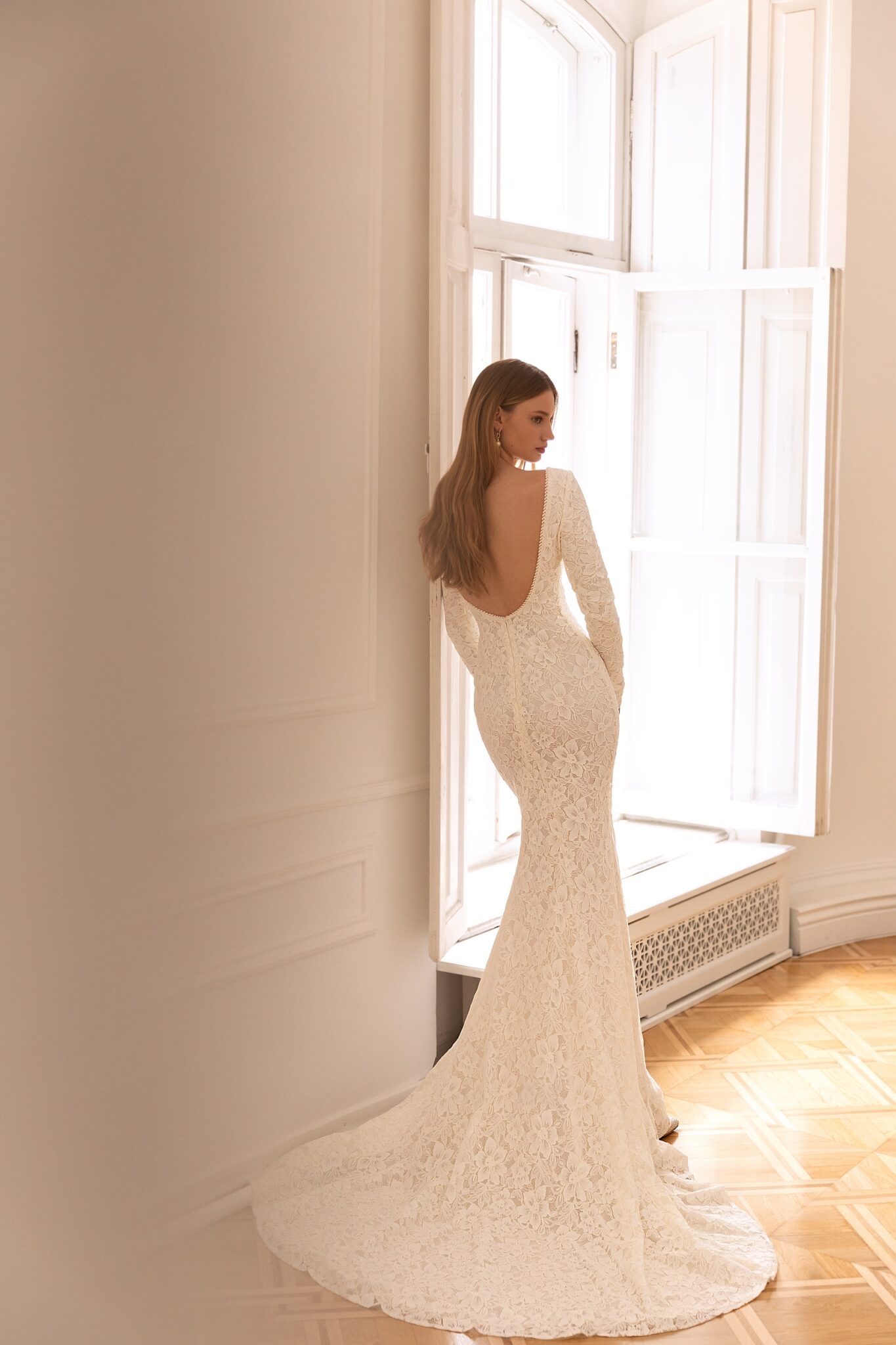 Less is more 2022Reese is a perfect choice for elegant and modest brides. The laconic mermaid silhouette accentuates the figure with long sleeves and Closed Boat neckling adding solemnity. The whole dress is made of textured floral lace. The special detail is hidden in the extra-low bodice that bares the bride’s back. The skirt has a small delicate train.