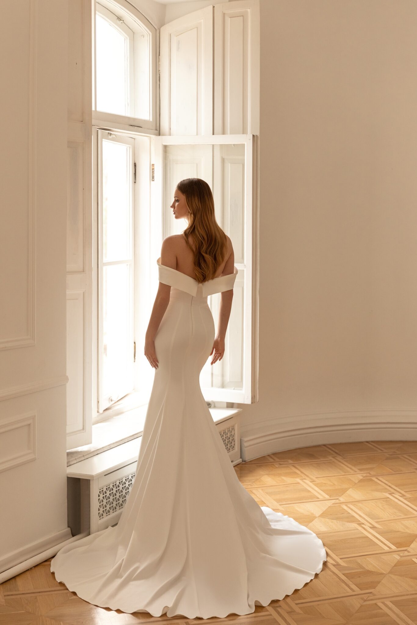 Less is more 2022, Plus SizeRenata is a magnificent and elegant A-line satin wedding gown that creates a royal look. It is made of glossy fabric. The dress with lowered shoulders is embellished with falbala that has a V-shaped neckline on the front and pointed angles at the back of the dress. A fantastic sheath skirt is fitted on hips and becomes flare down the length. The magnificent overskirt passes into a long train that adds solemnity to the outfit.