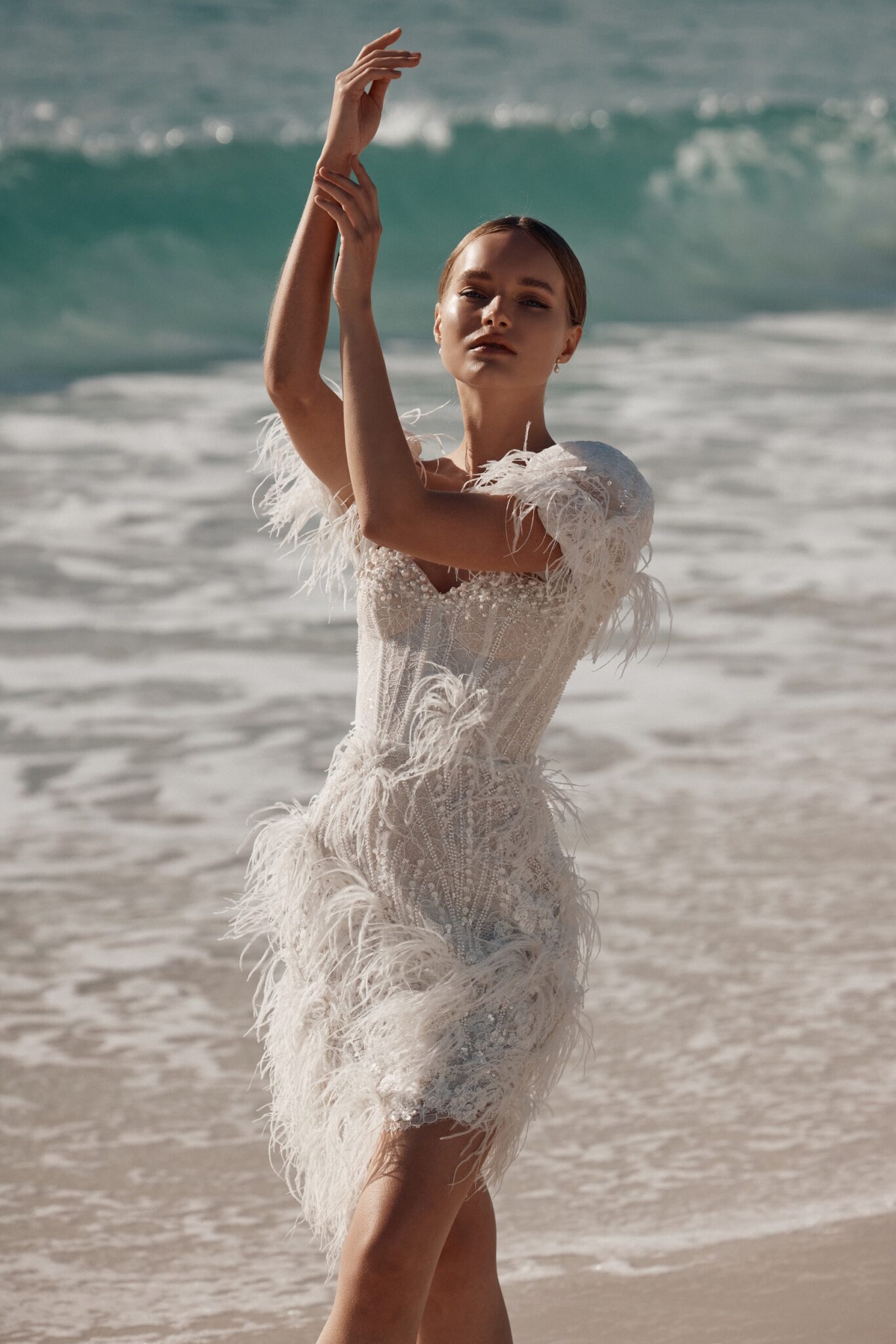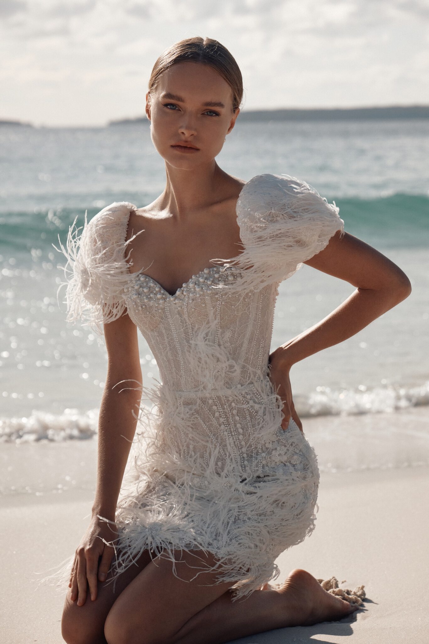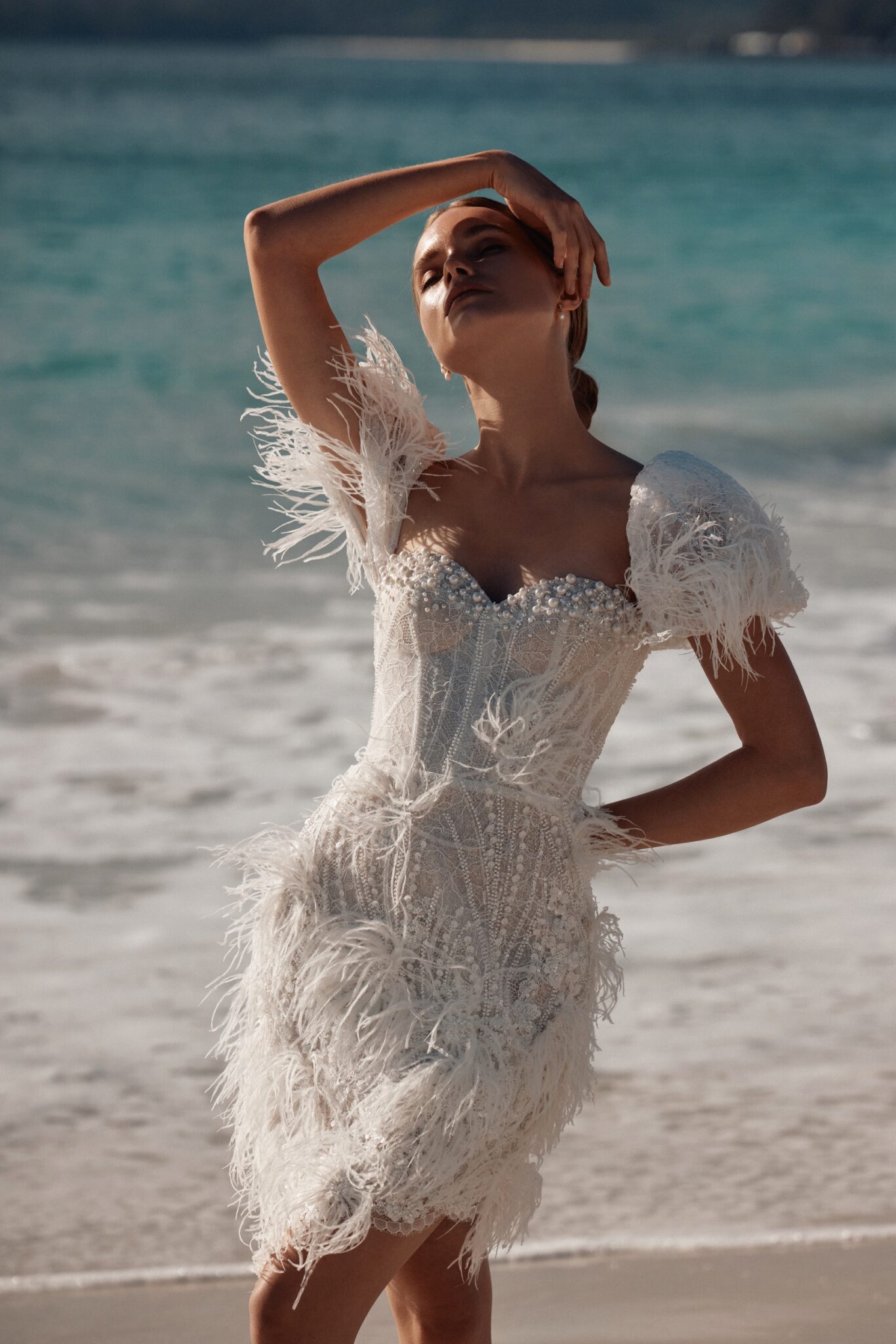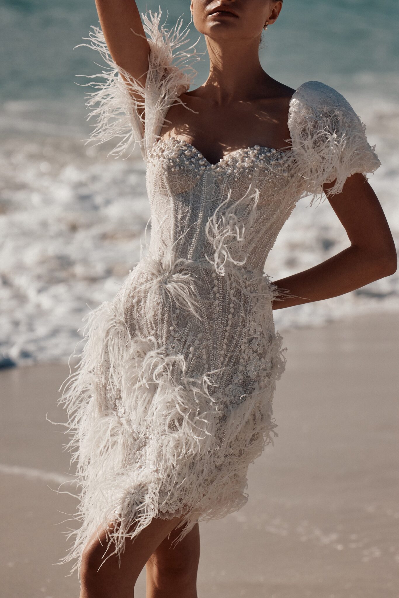 Atelier signature edition, Sample SaleThis mini-length wedding dress is a dazzling showstopper, bedecked in shimmering beads, pearls, and enchanting feather appliques. The sweetheart neckline adds a touch of classic romance, while the cap sleeves adorned with feathers give it a unique and extravagant flair. Perfect for the bride who wants to make a bold and unforgettable statement.