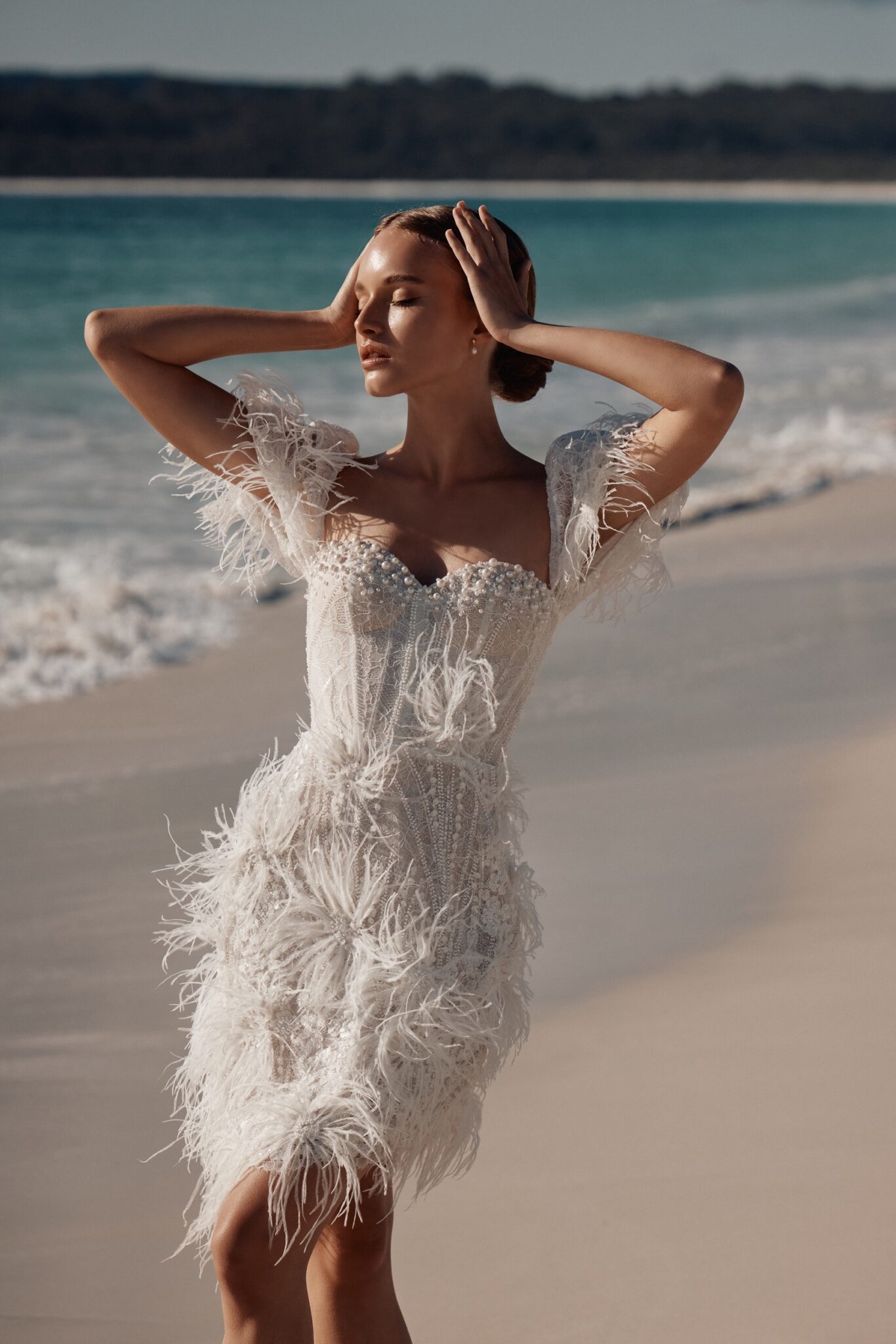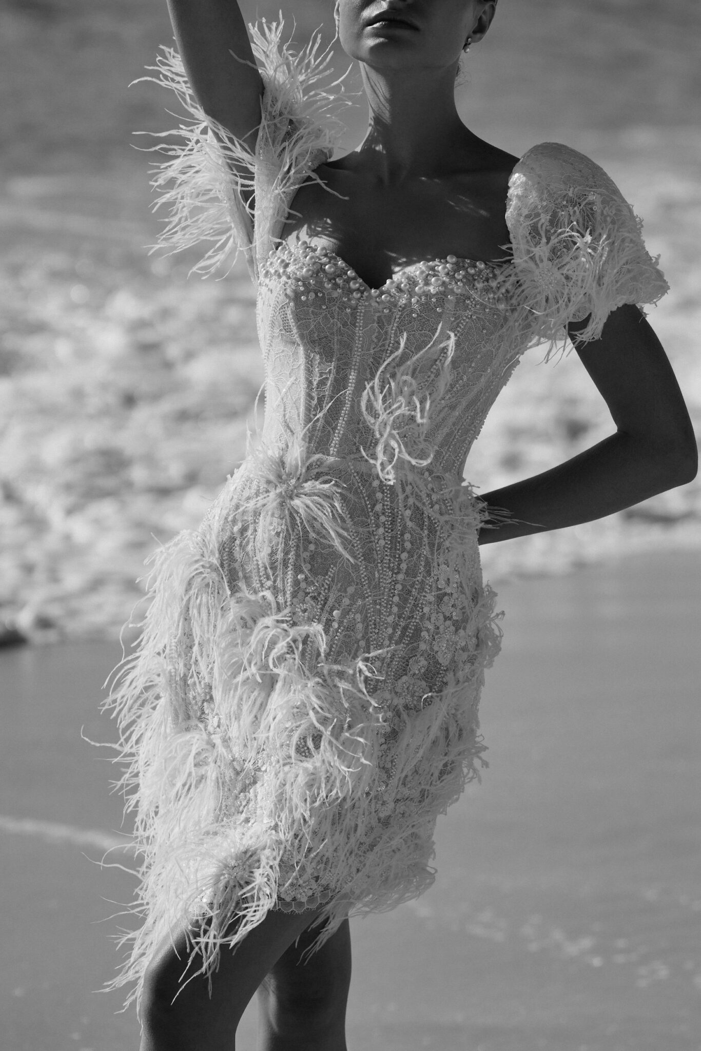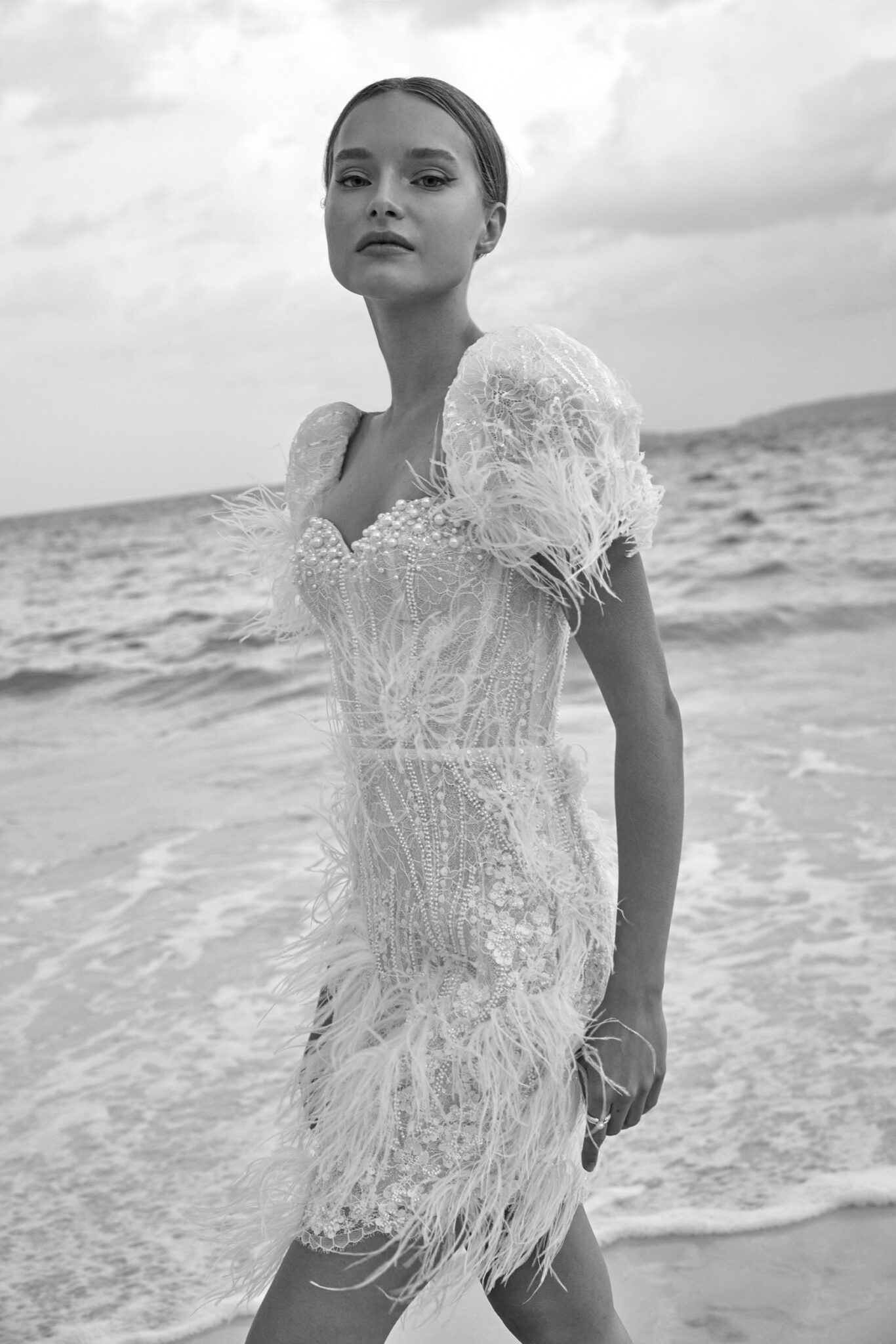 Atelier signature edition, Sample SaleThis mini-length wedding dress is a dazzling showstopper, bedecked in shimmering beads, pearls, and enchanting feather appliques. The sweetheart neckline adds a touch of classic romance, while the cap sleeves adorned with feathers give it a unique and extravagant flair. Perfect for the bride who wants to make a bold and unforgettable statement.