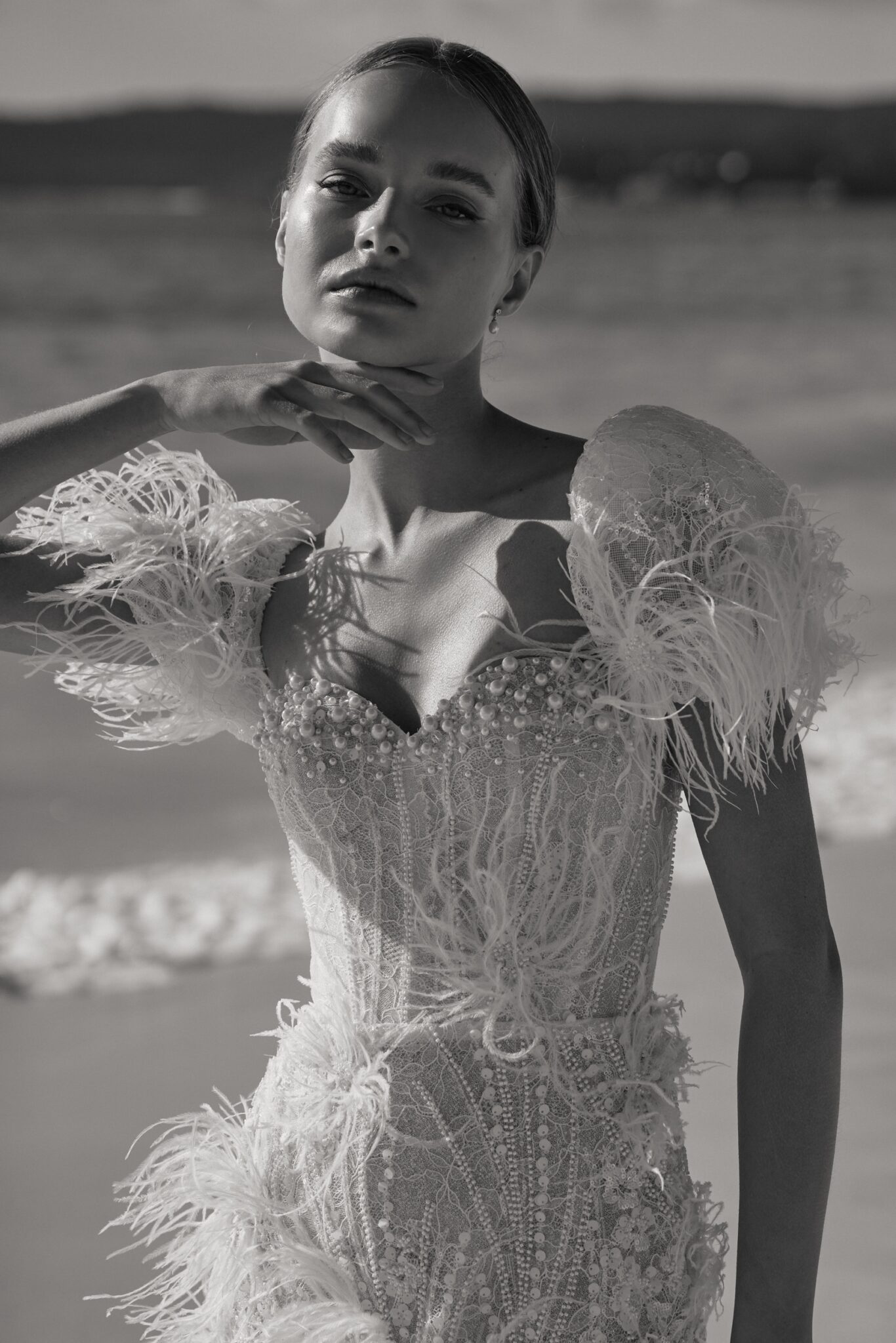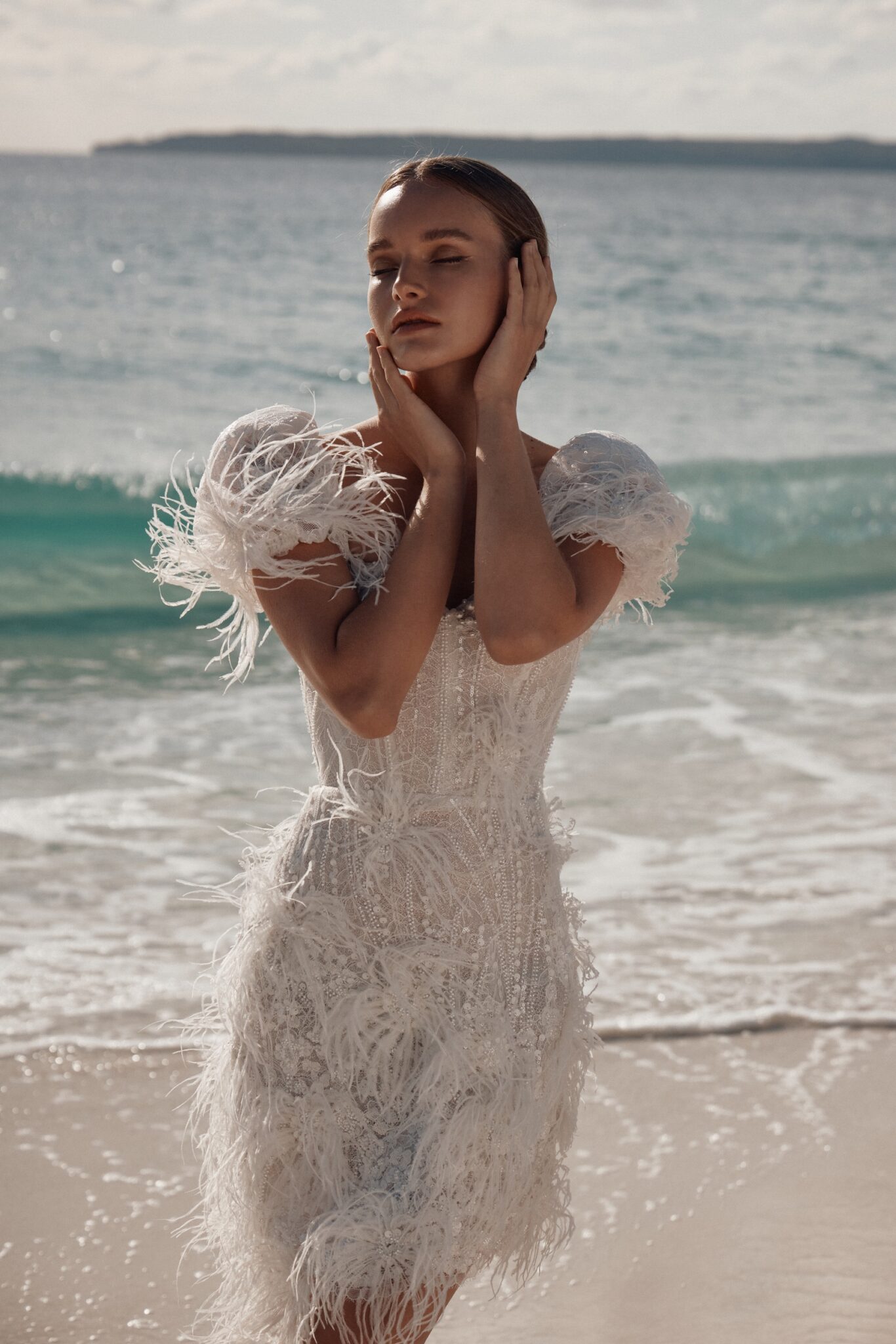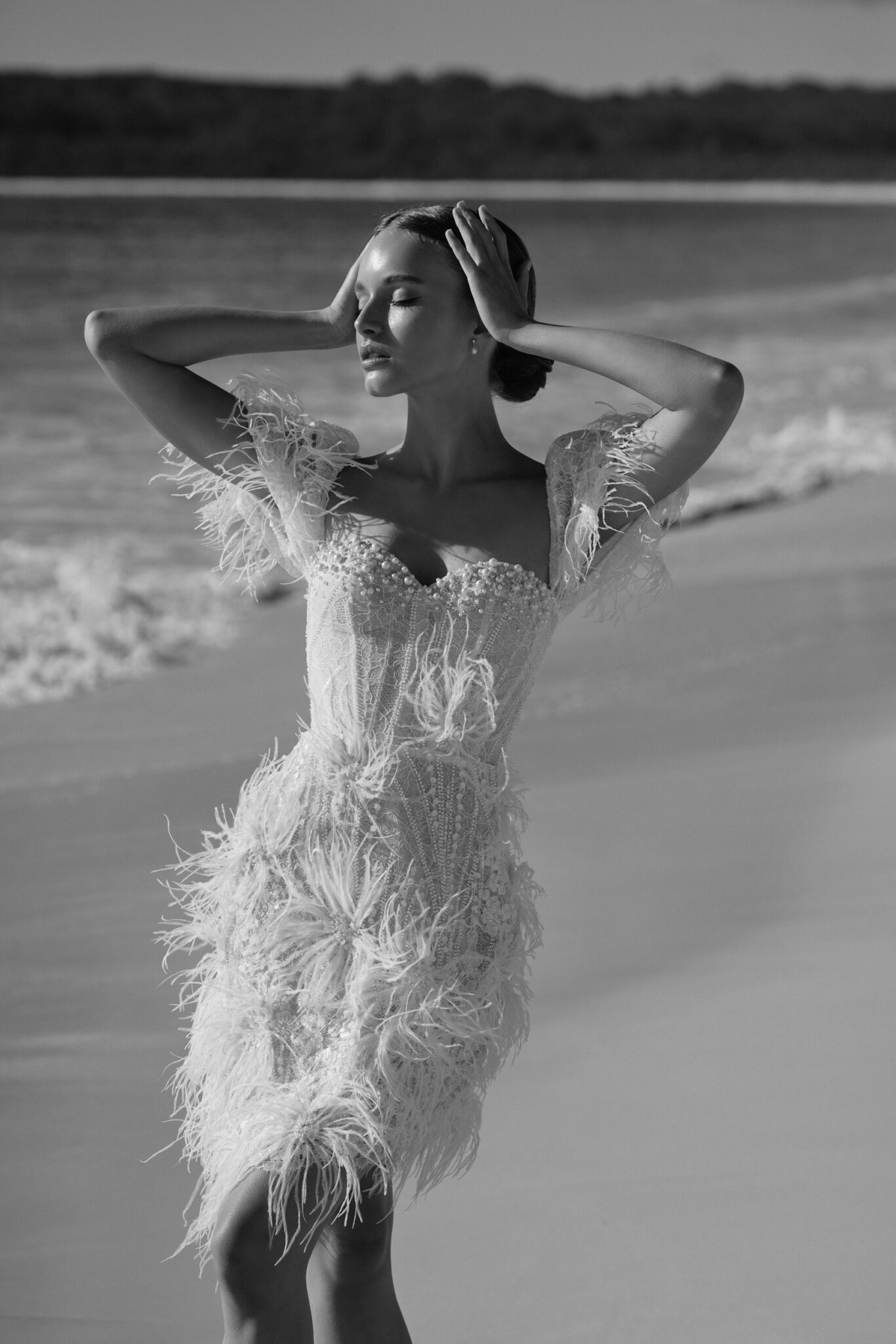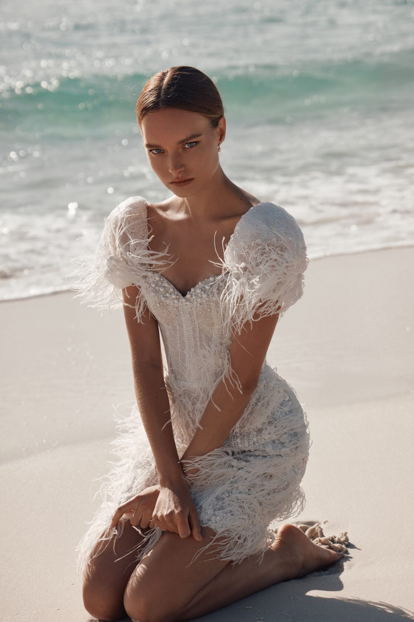 Atelier signature edition, Sample SaleThis mini-length wedding dress is a dazzling showstopper, bedecked in shimmering beads, pearls, and enchanting feather appliques. The sweetheart neckline adds a touch of classic romance, while the cap sleeves adorned with feathers give it a unique and extravagant flair. Perfect for the bride who wants to make a bold and unforgettable statement.