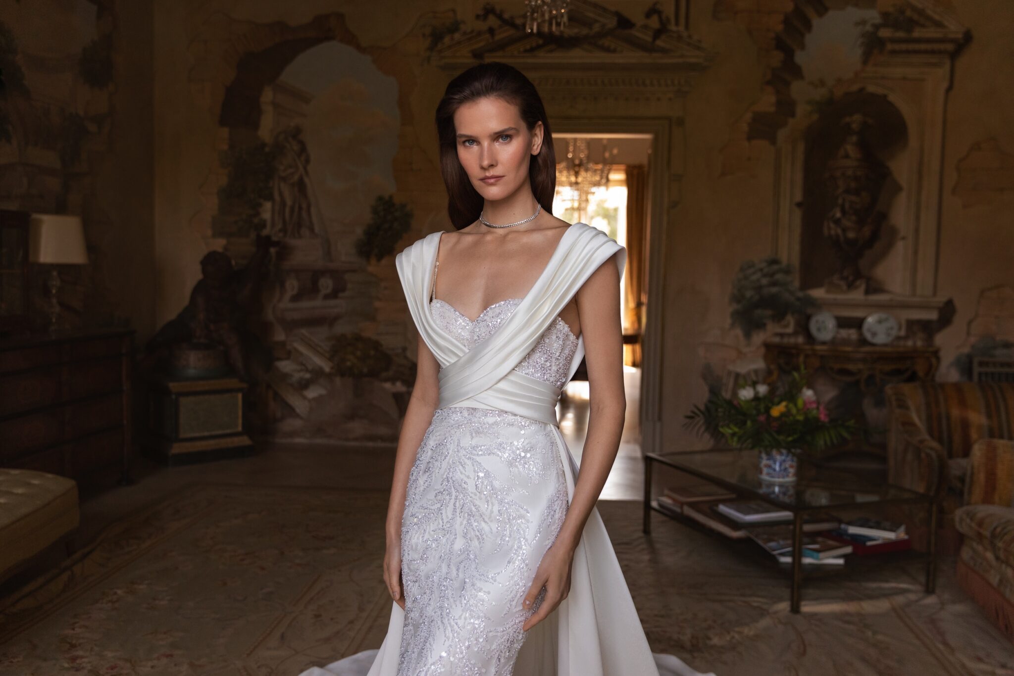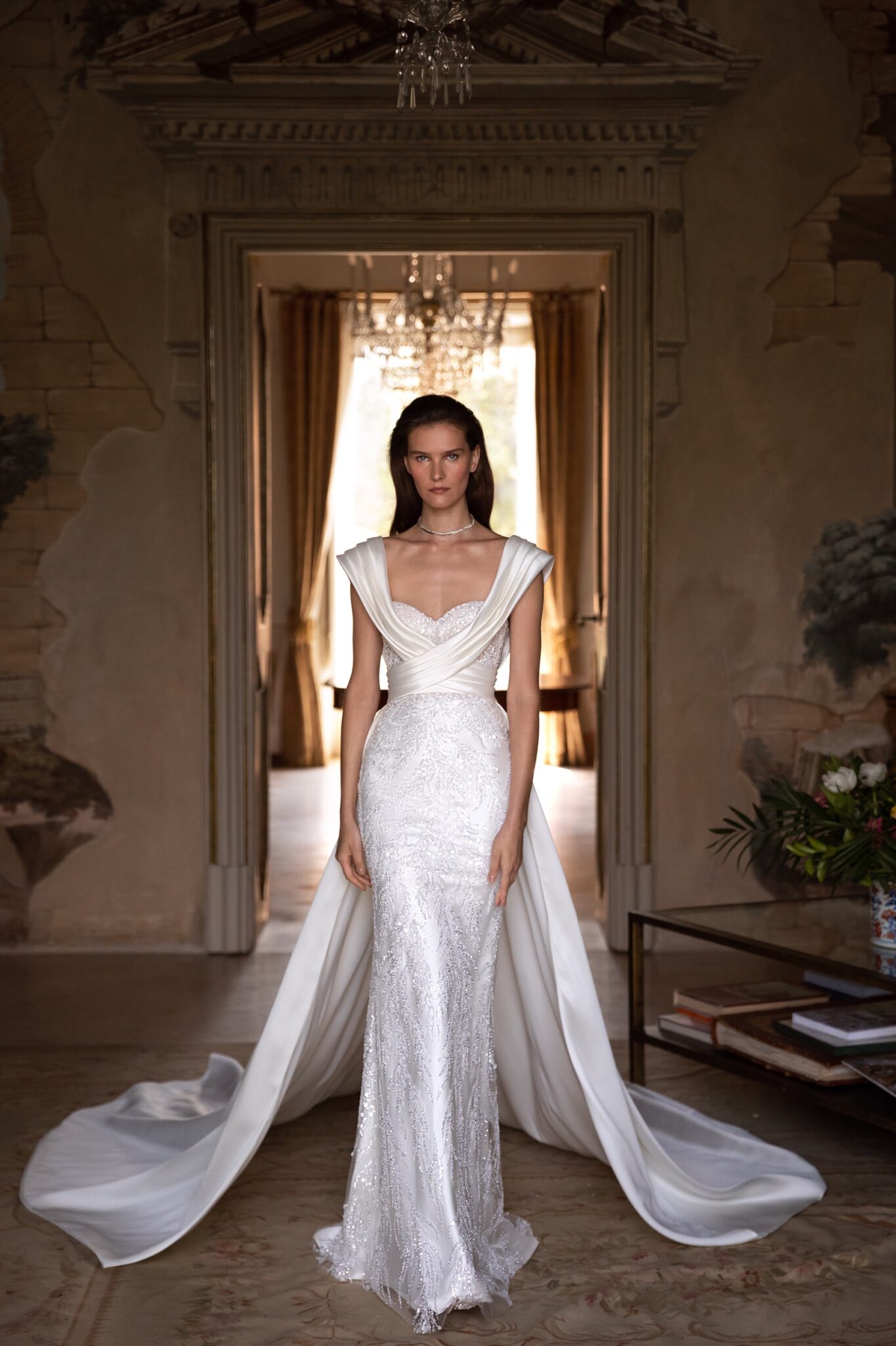 Palermo, Plus Size, Sample SaleRoca is a super-fitted trumpet head-to-toe sequined gown for a sexy and sophisticated bride. A sheer sweetheart corset with thin sparkling spaghetti straps and organic patterned embroidery on a special lace is paired with a matching cross-body satin draped bolero that is attached on the waist and runs into an eyecatching cape with a magnificent long train.