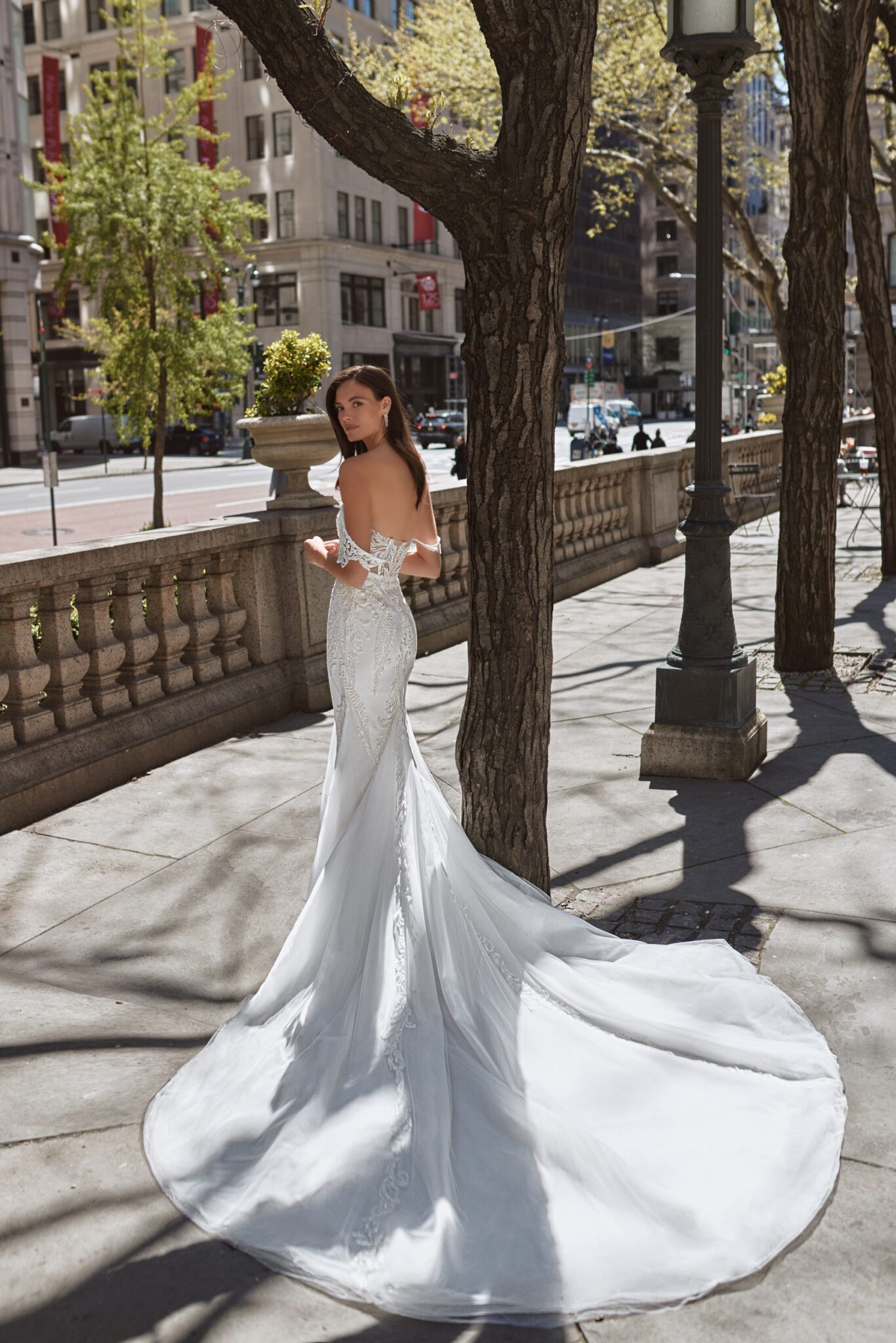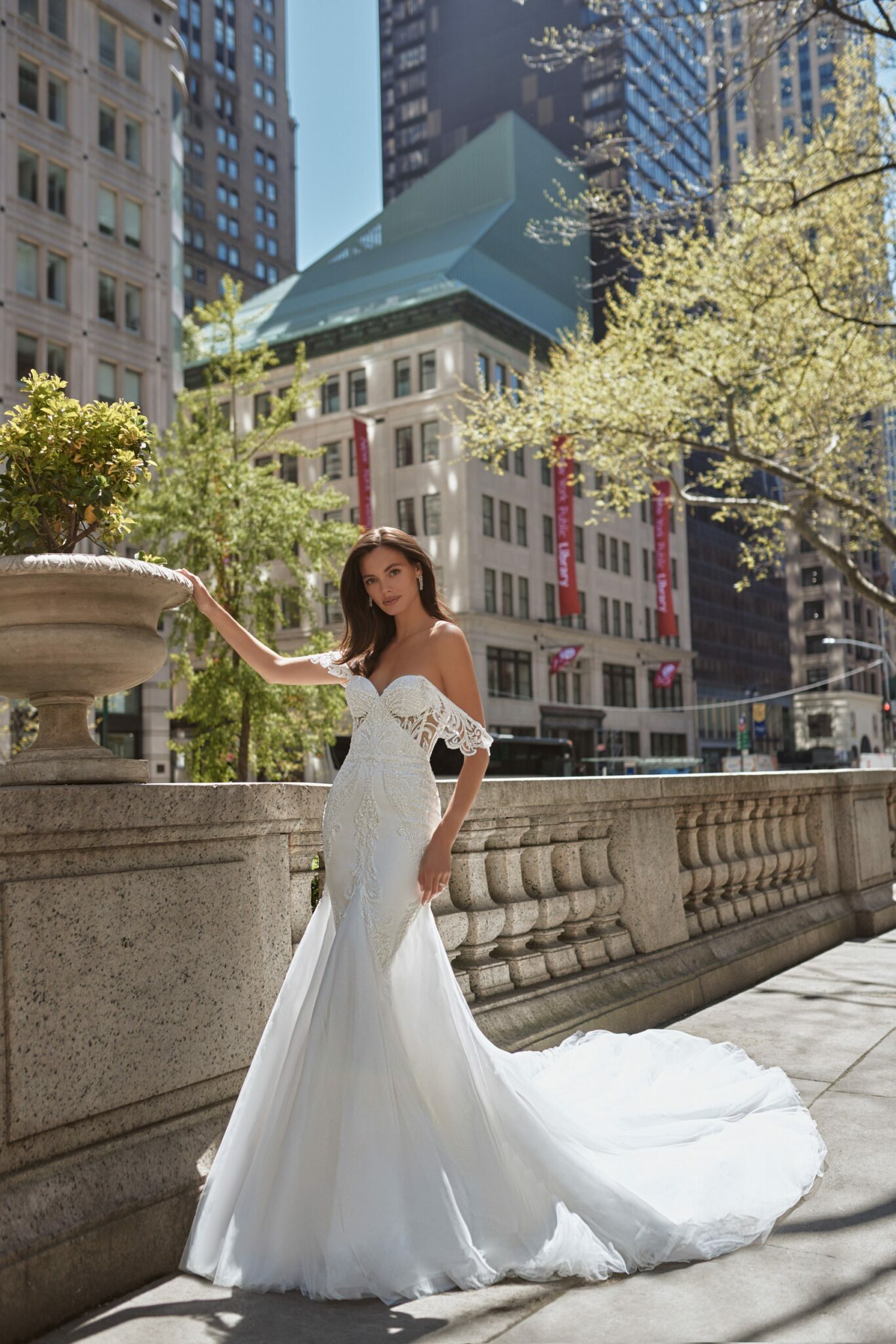 Love in the City, Plus Size, Sample SaleTender Rochelle wedding gown is made of exquisite laced fabric. The corset is embellished with a sweetheart neckline and lowered shoulders. The lace inserts decorate the corsage and the lowered sleeves. The skirt is fitted on the hips and continued with geometric inserts of lush Tulle which pass into a fantastic train.