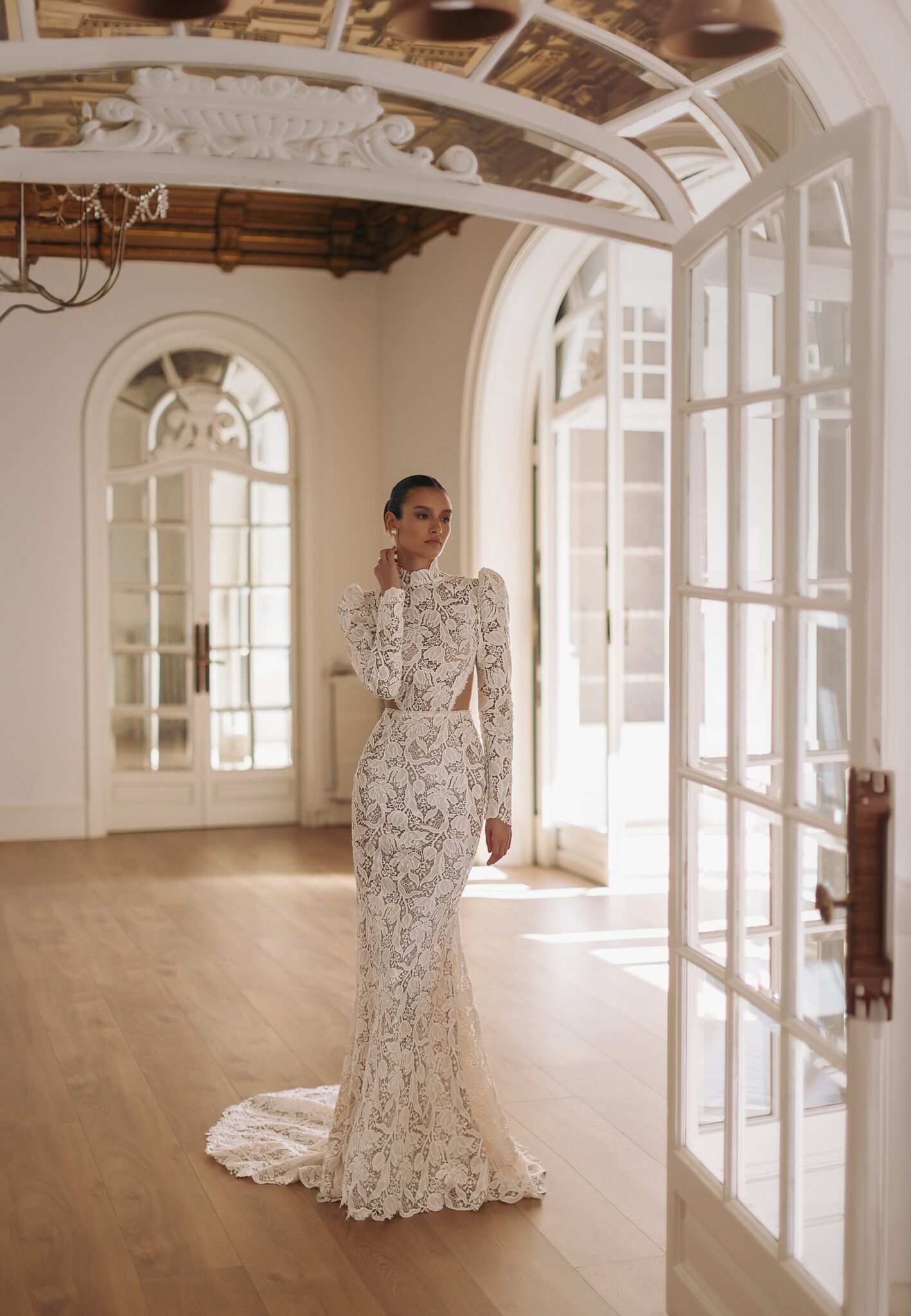 GeminiRodeo — guipure lace fitted mermaid silhouette turtleneck dress with long sleeves cut out sides and open round back with thin shiny straps from the neck to the bottom. Complemented with detachable smooth upper skirt open in the front and covering the back and sides.
