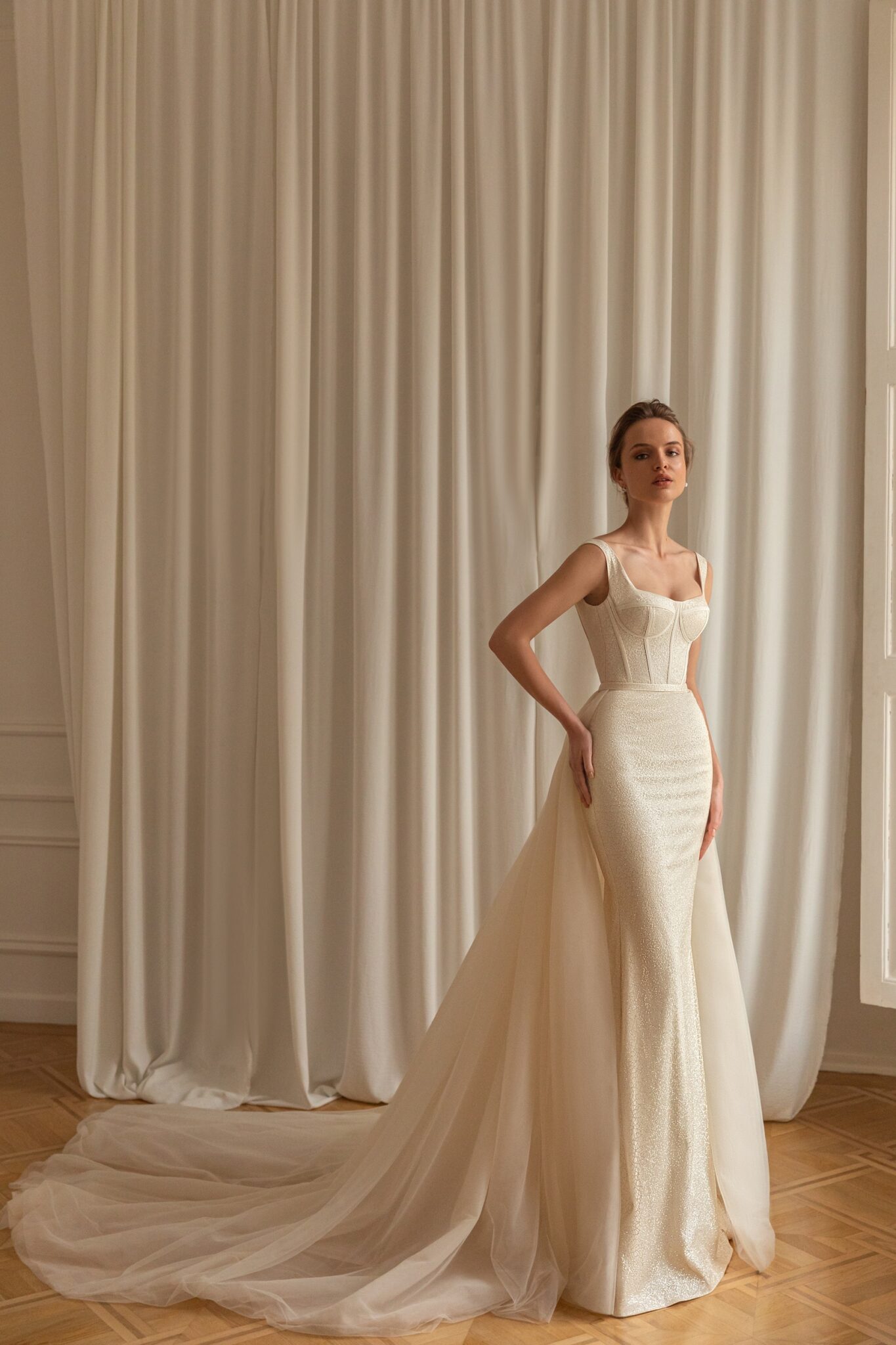 Less is more 2022Rory is a sparkling wedding dress in Ivory colour with a fantastic overskirt. The corset is decorated with classic cups and bones. The neckline is square with two wide straps that pass to the uncovered back Boat-shaped neckline. The fitted sheath skirt of mermaid silhouette is made of shiny fabric and the magnificent overskirt made of Ivory Tulle is fixed on the waistline.